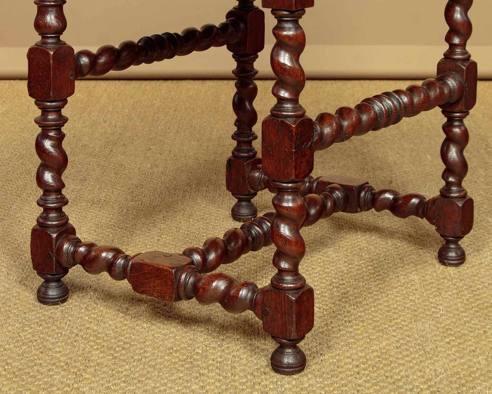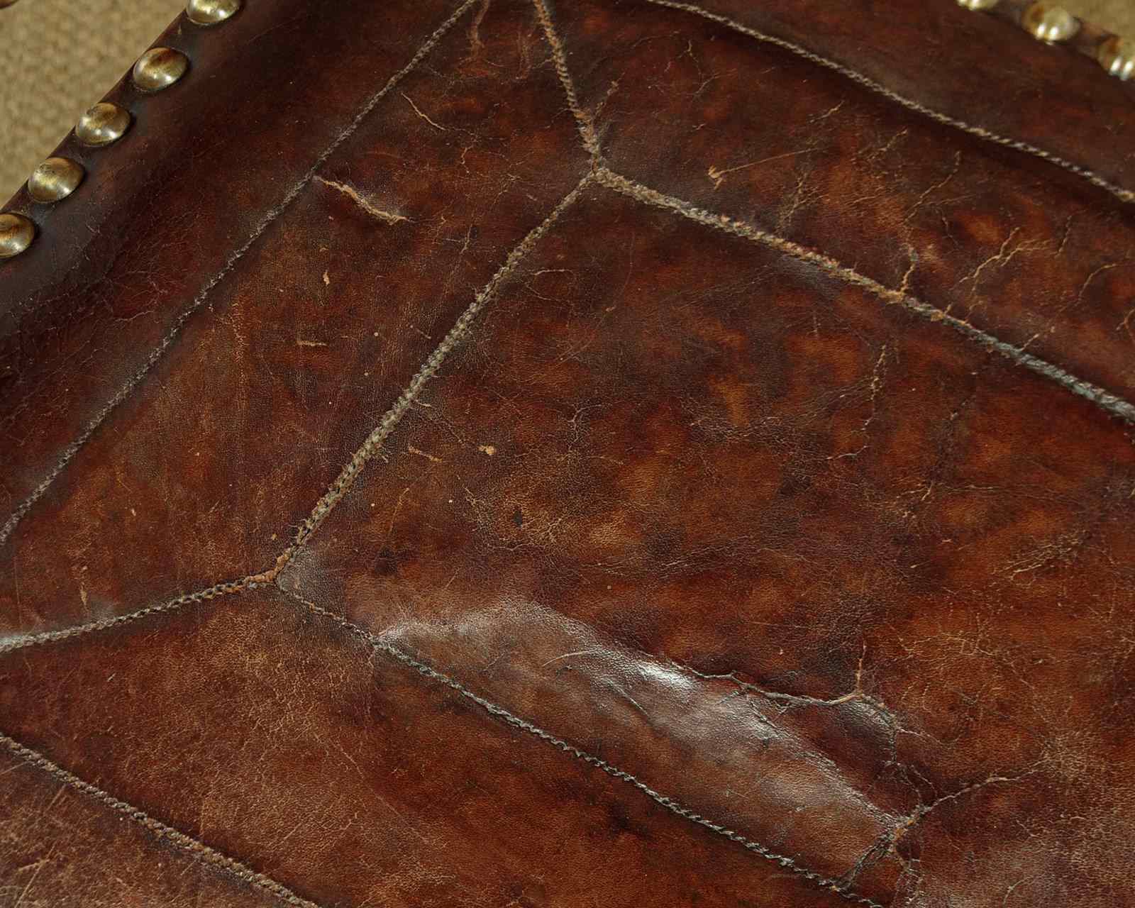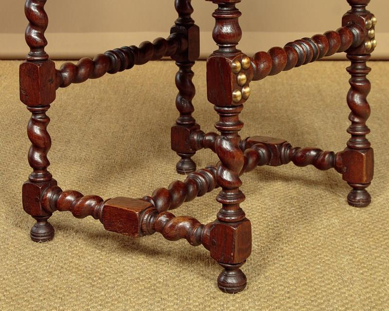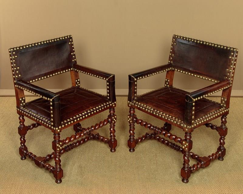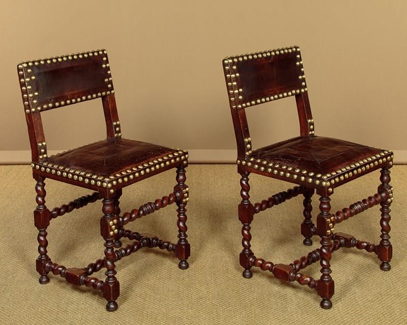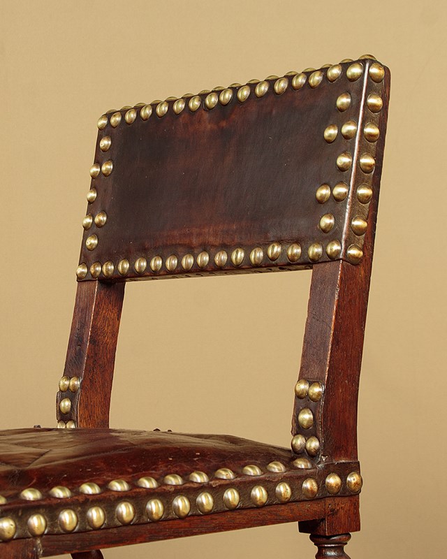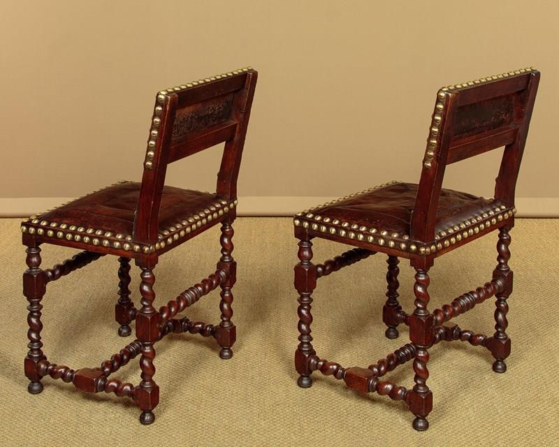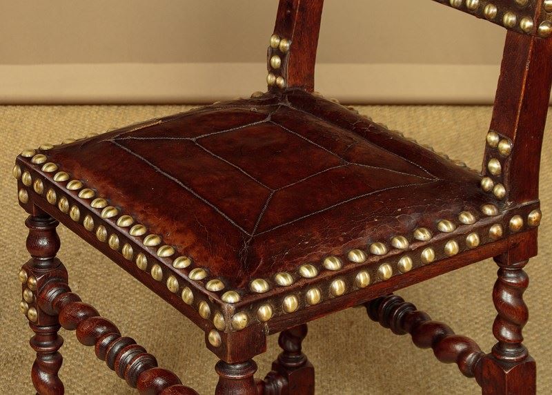 Good looking set of four 17th.c. style oak and leather dining c.1920. Backrests and padded seats retaining the original brown leather covering with large decorative brass studs to the edges. Solid oak frames with twist carved, turned and block legs and stretchers. Some wear to the seats, generally very good condition with particularly good colour and patina to the leather. Cleaned and waxed in our workshops.