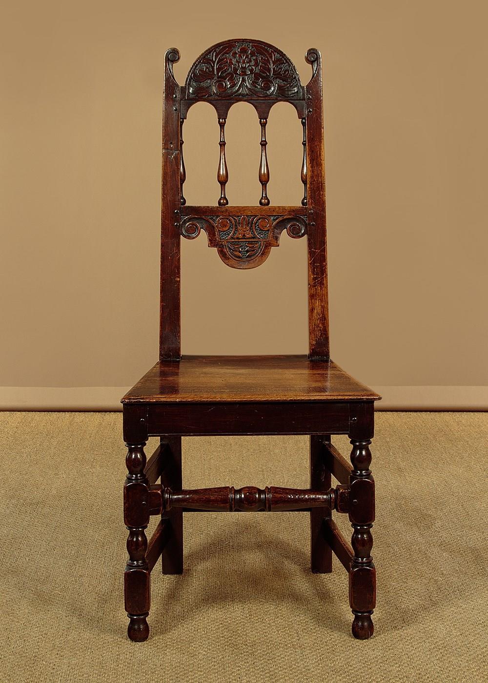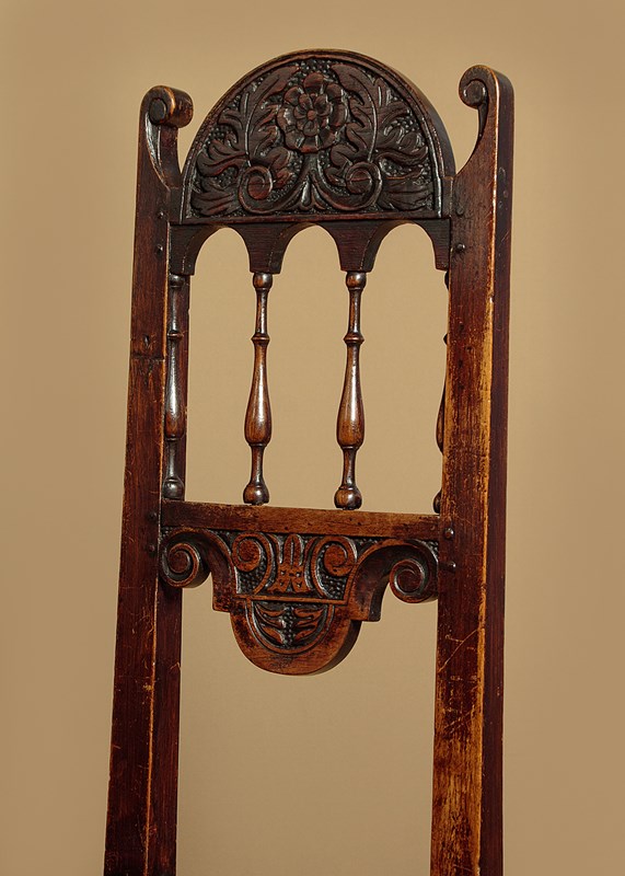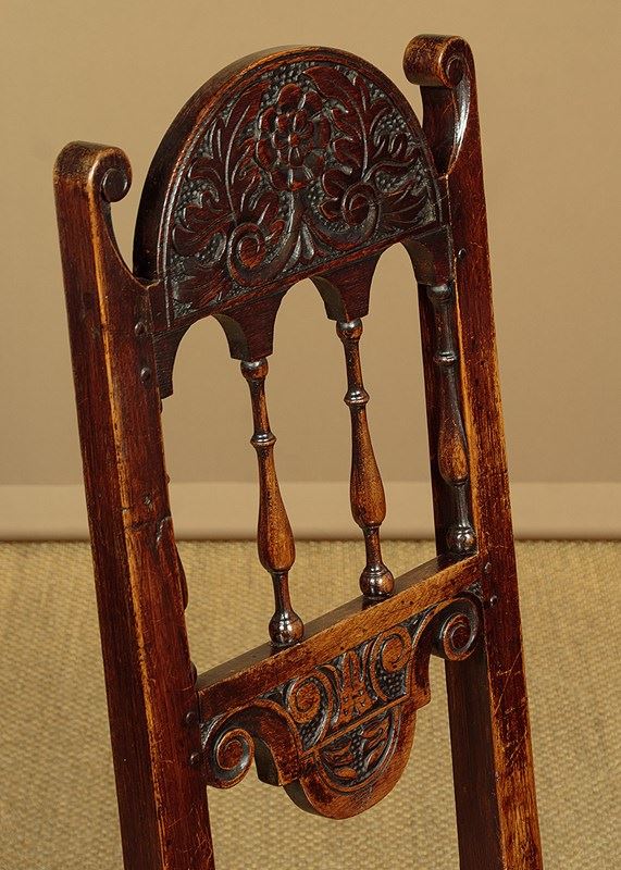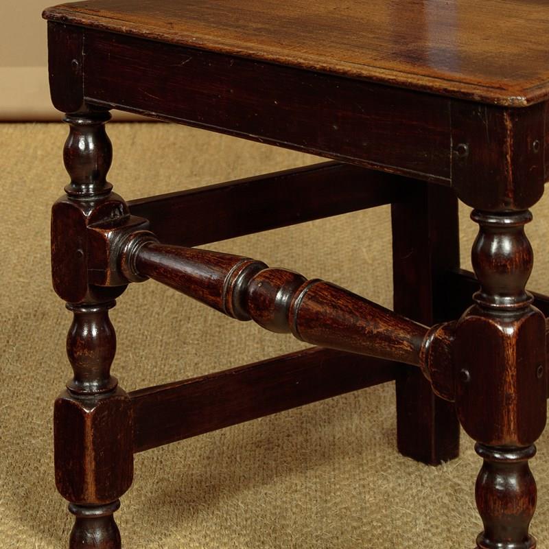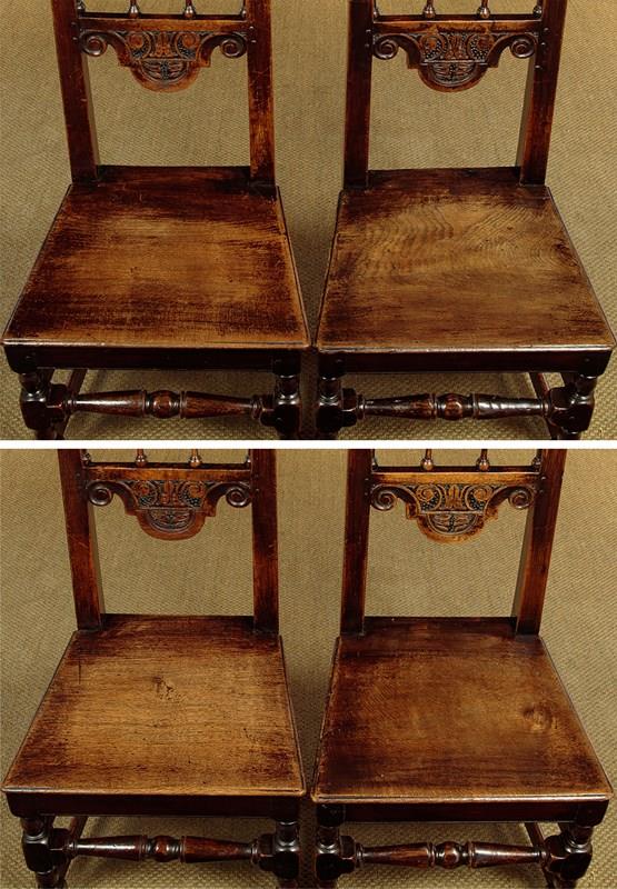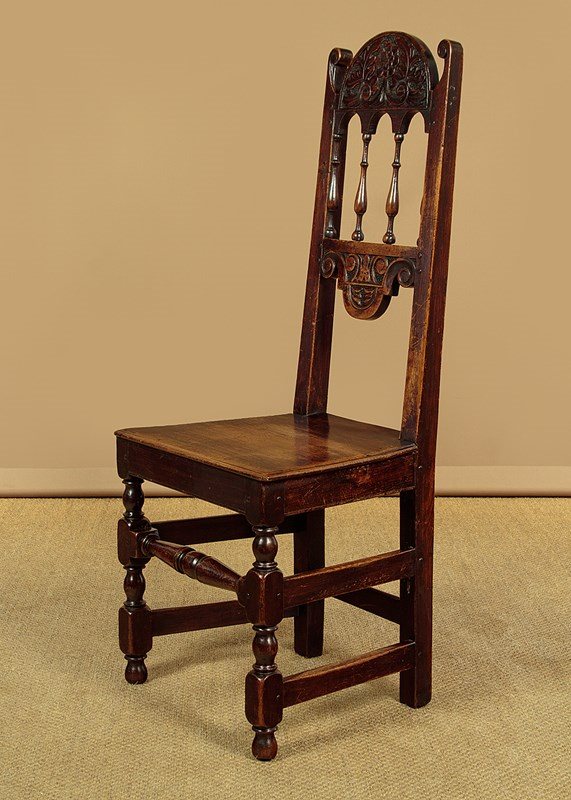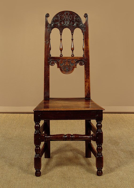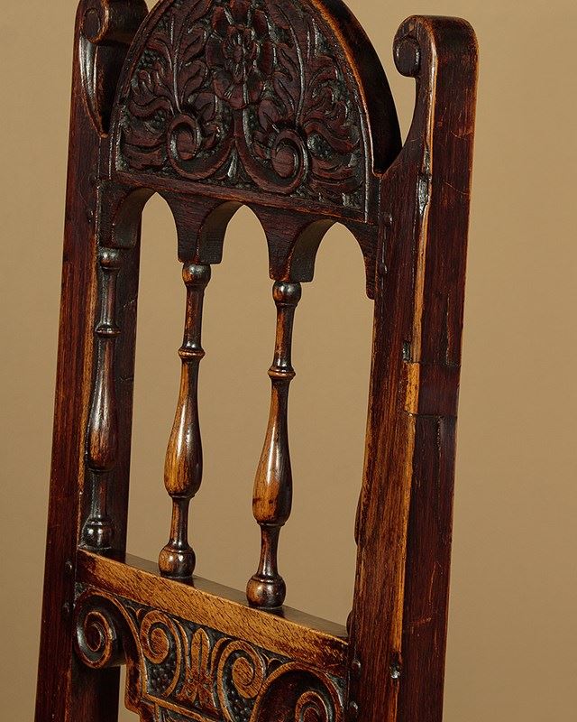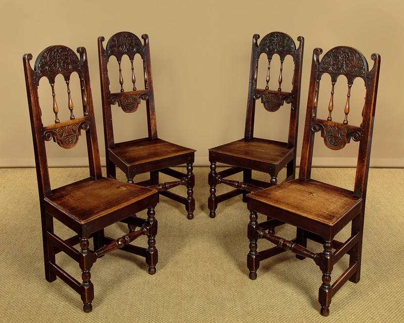 Good set of four 17th.c. style oak dining chairs c.1920. Good quality facsimiles of chairs or 'joined backstools' of the type produced in South Yorkshire in the latter half of the 17th century. Tall decorative backrests with an arched top carved with flowers and foliage over three arches supported on slim turned spindles with a good carved stretcher below. Between slightly tapering rear stiles topped with distinctive scrolling finials. Single piece board seats with a moulded edge (seat height 18½"). Turned and block front legs and a turned and tapering front stretcher. Straight stretchers to the sides and rear. Excellent colour and condition, cleaned and waxed in our workshops.