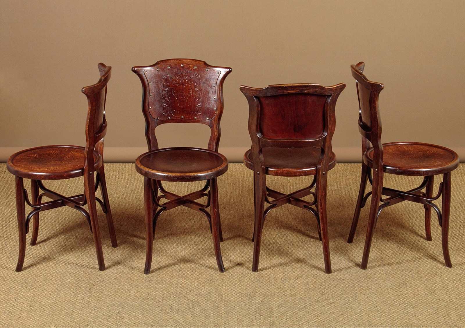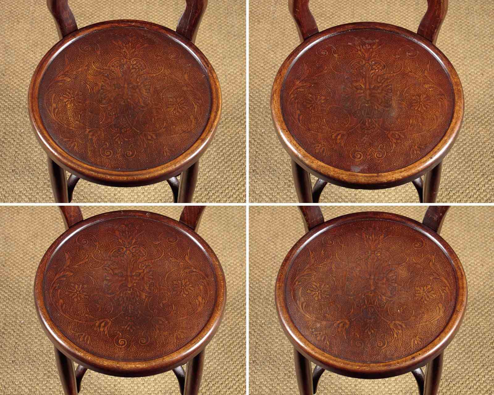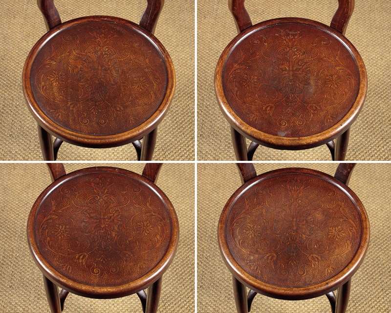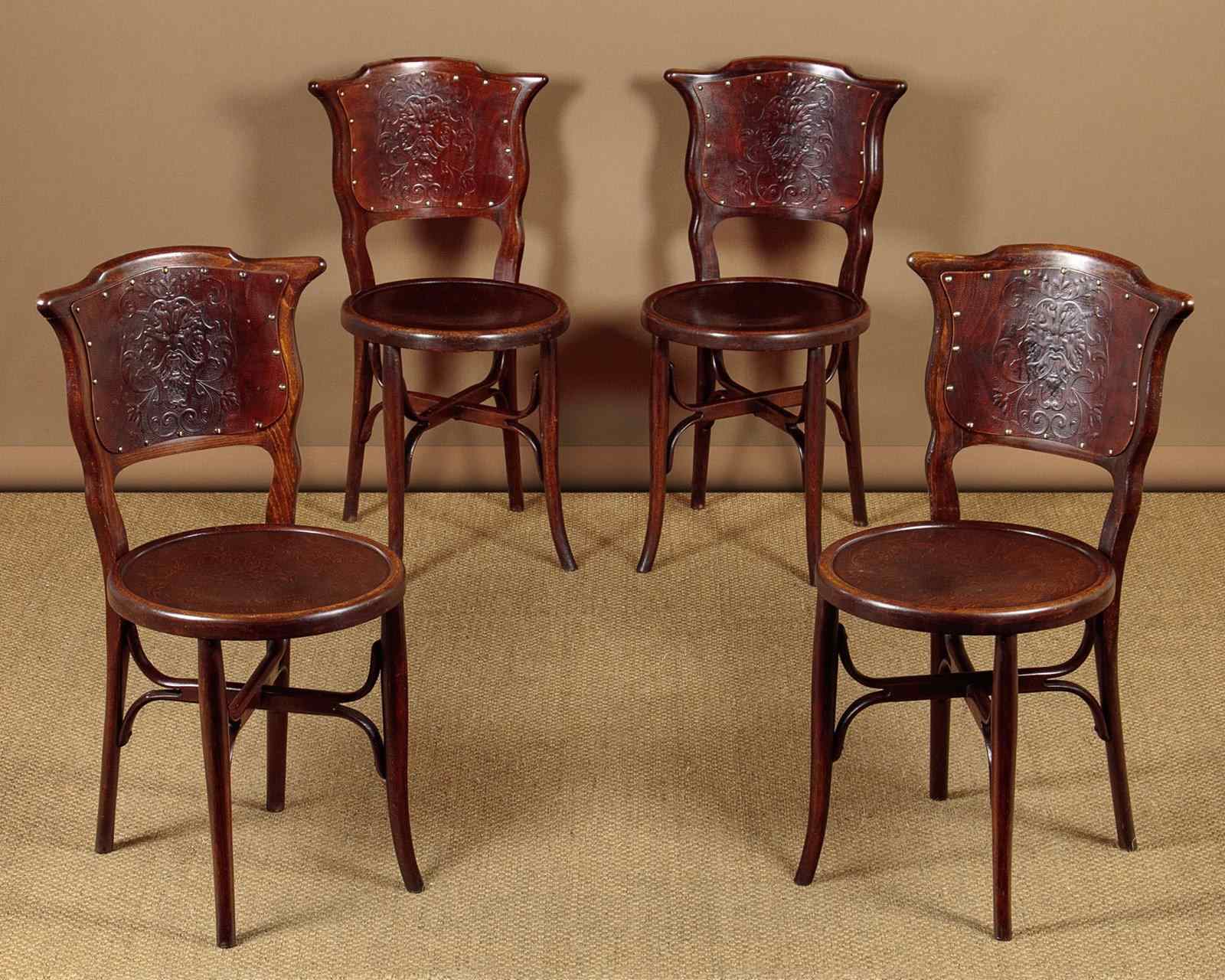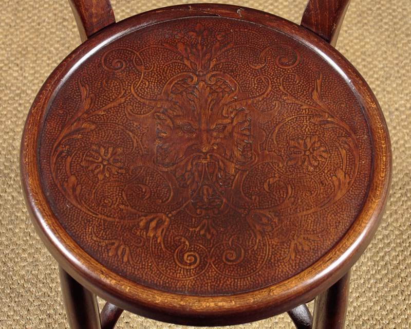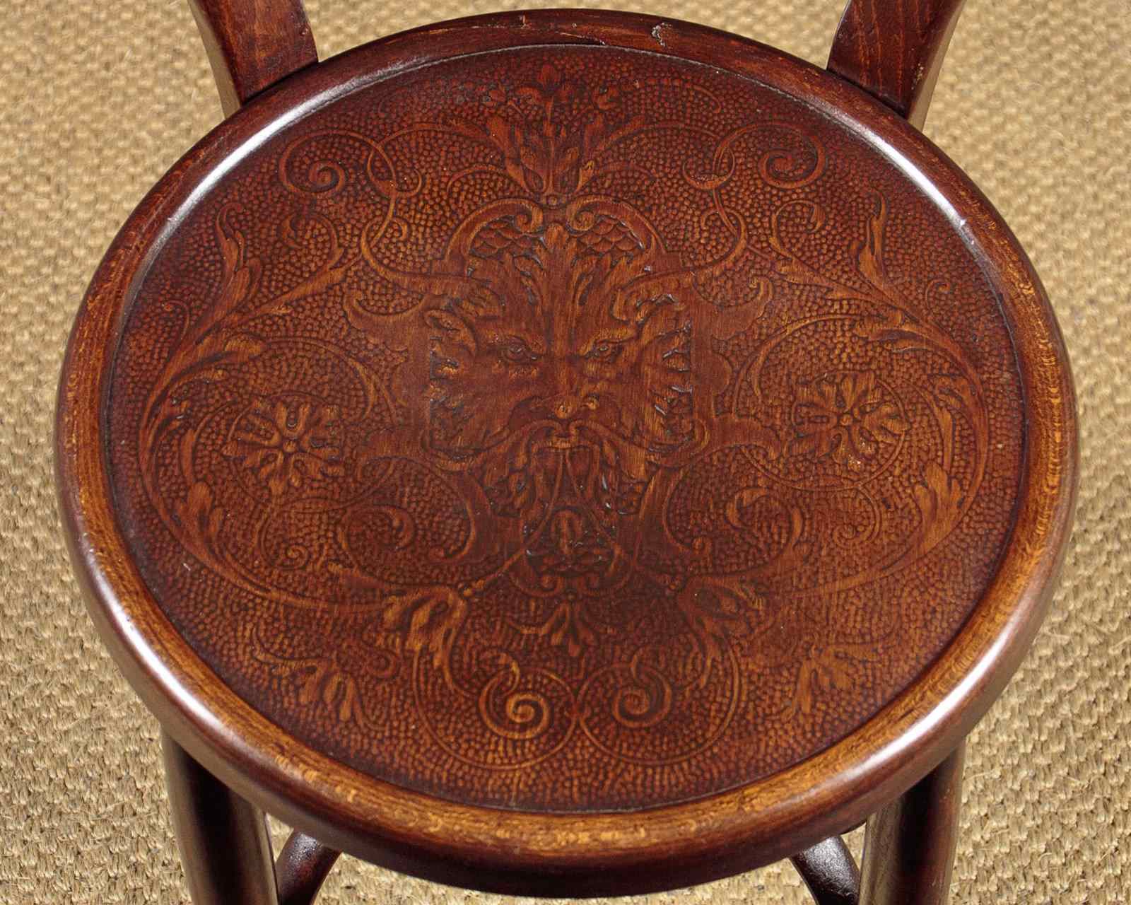 Set of four unusual bentwood bistro dining chairs c.1900. Shaped backrests and 16" diameter seats both with pressed panels featuring a superb Renaissance revival grotesque mask surrounded by scrolling foliate forms. Turned legs joined with pierced and crossed stretchers. Excellent colour and condition, cleaned and waxed in our workshops.