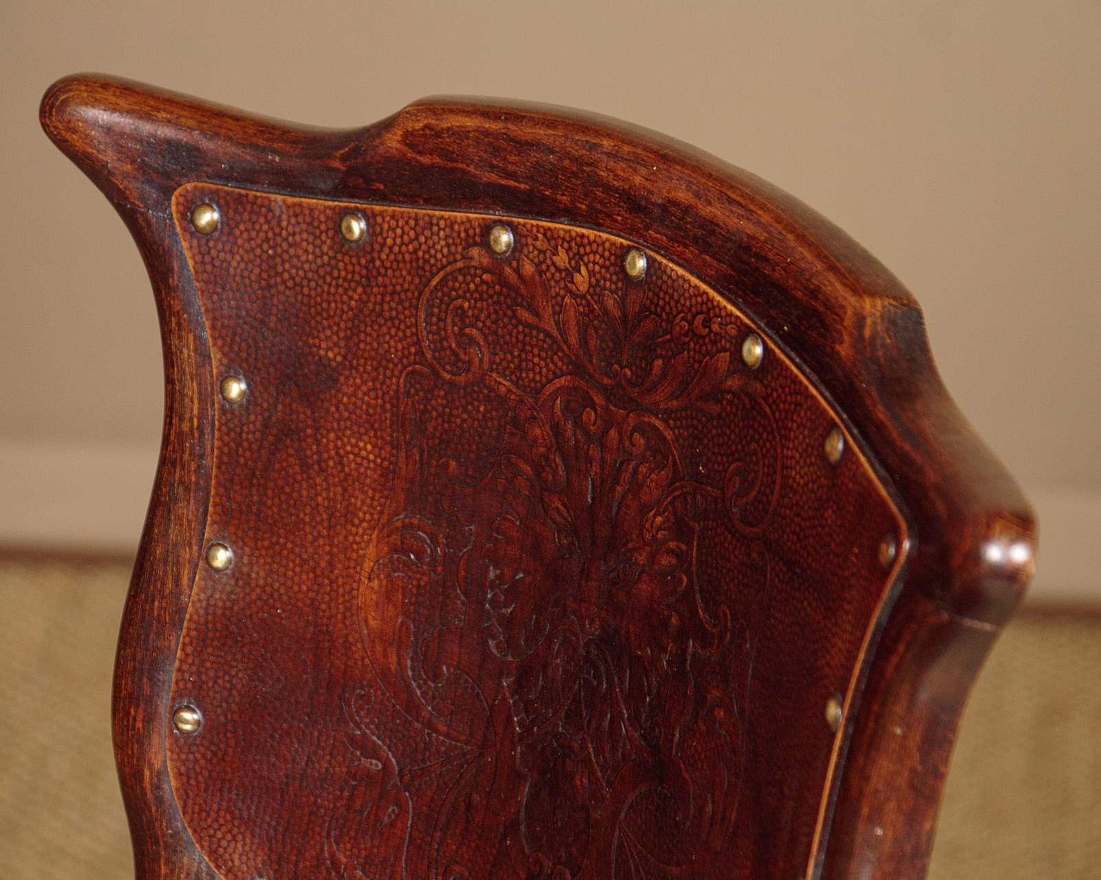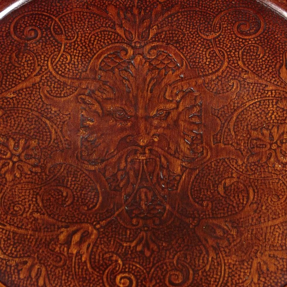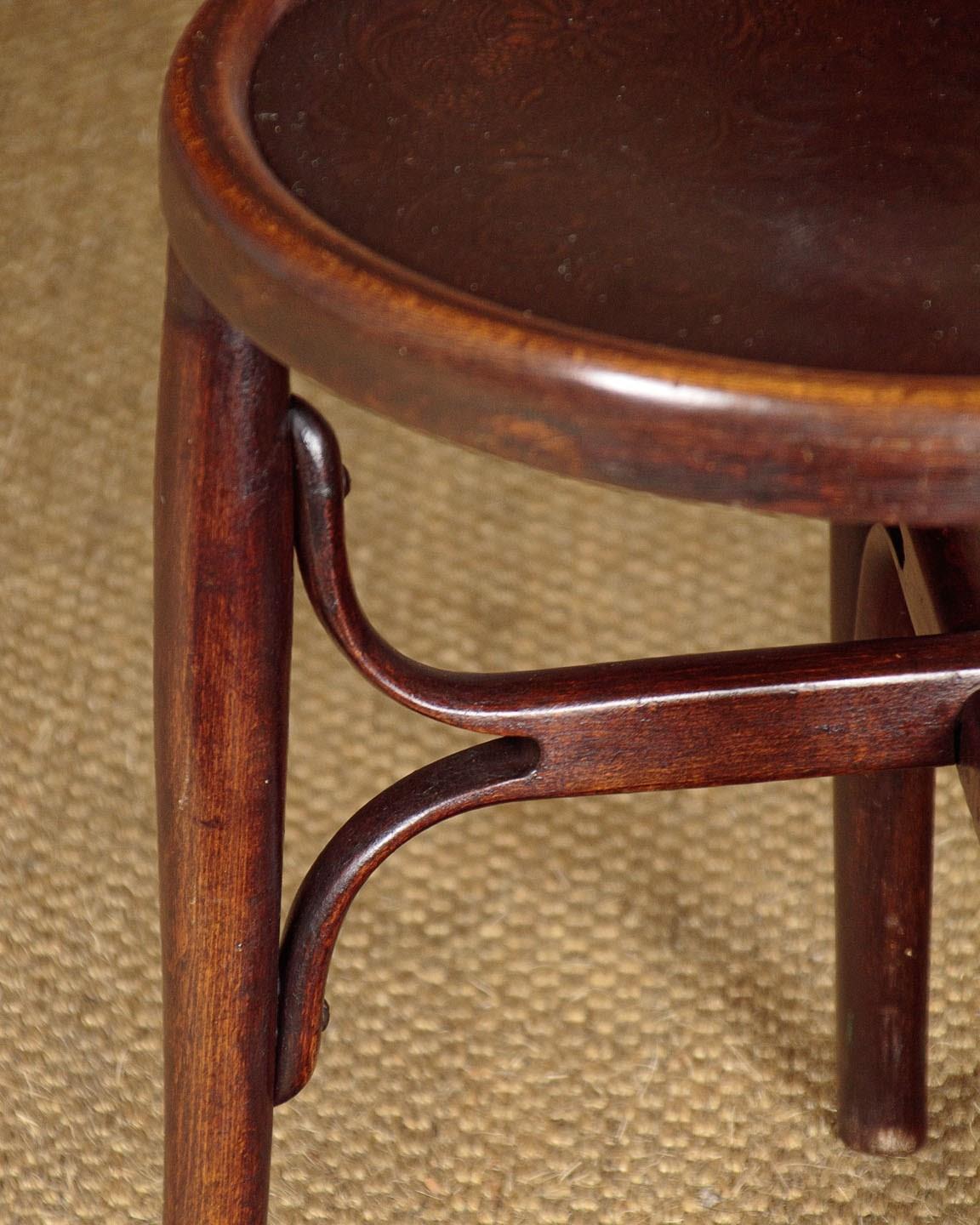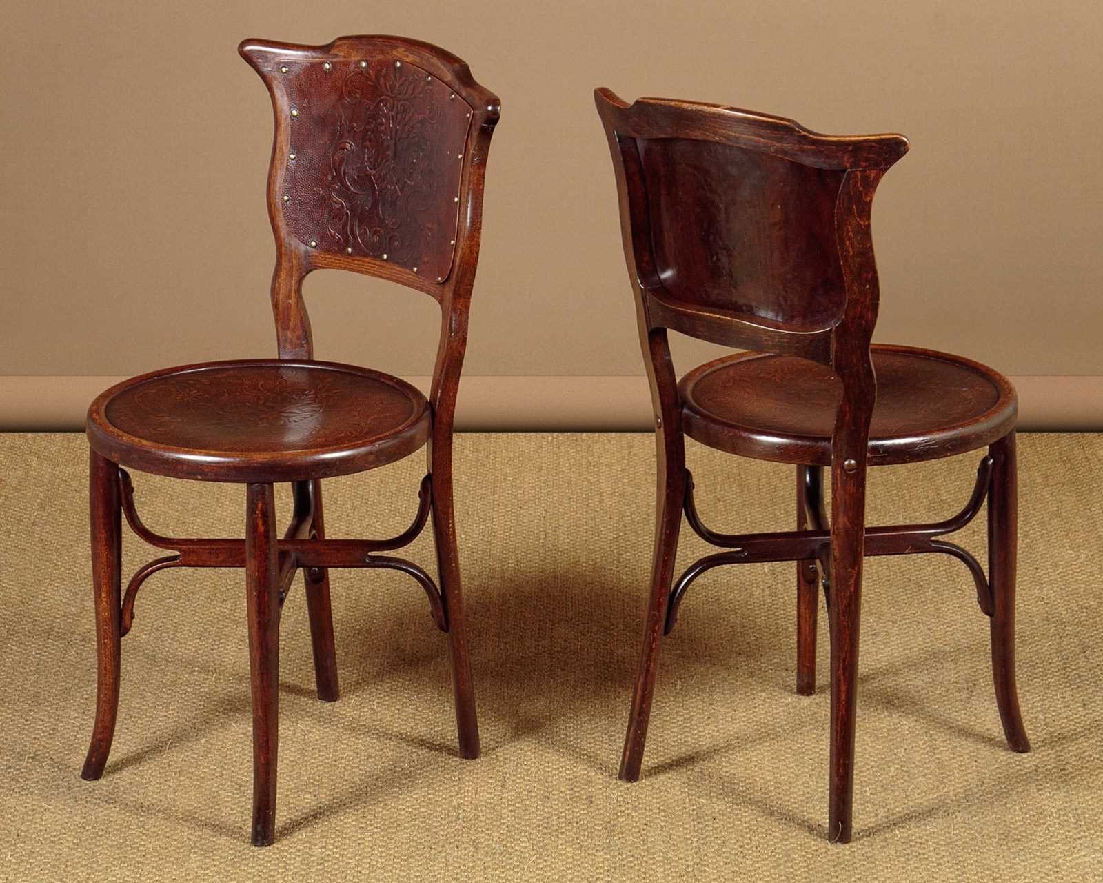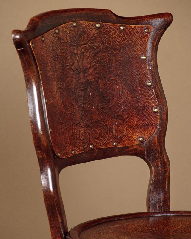 Set of four unusual bentwood bistro dining chairs c.1900. Shaped backrests and 16" diameter seats both with pressed panels featuring a superb Renaissance revival grotesque mask surrounded by scrolling foliate forms. Turned legs joined with pierced and crossed stretchers. Excellent colour and condition, cleaned and waxed in our workshops.