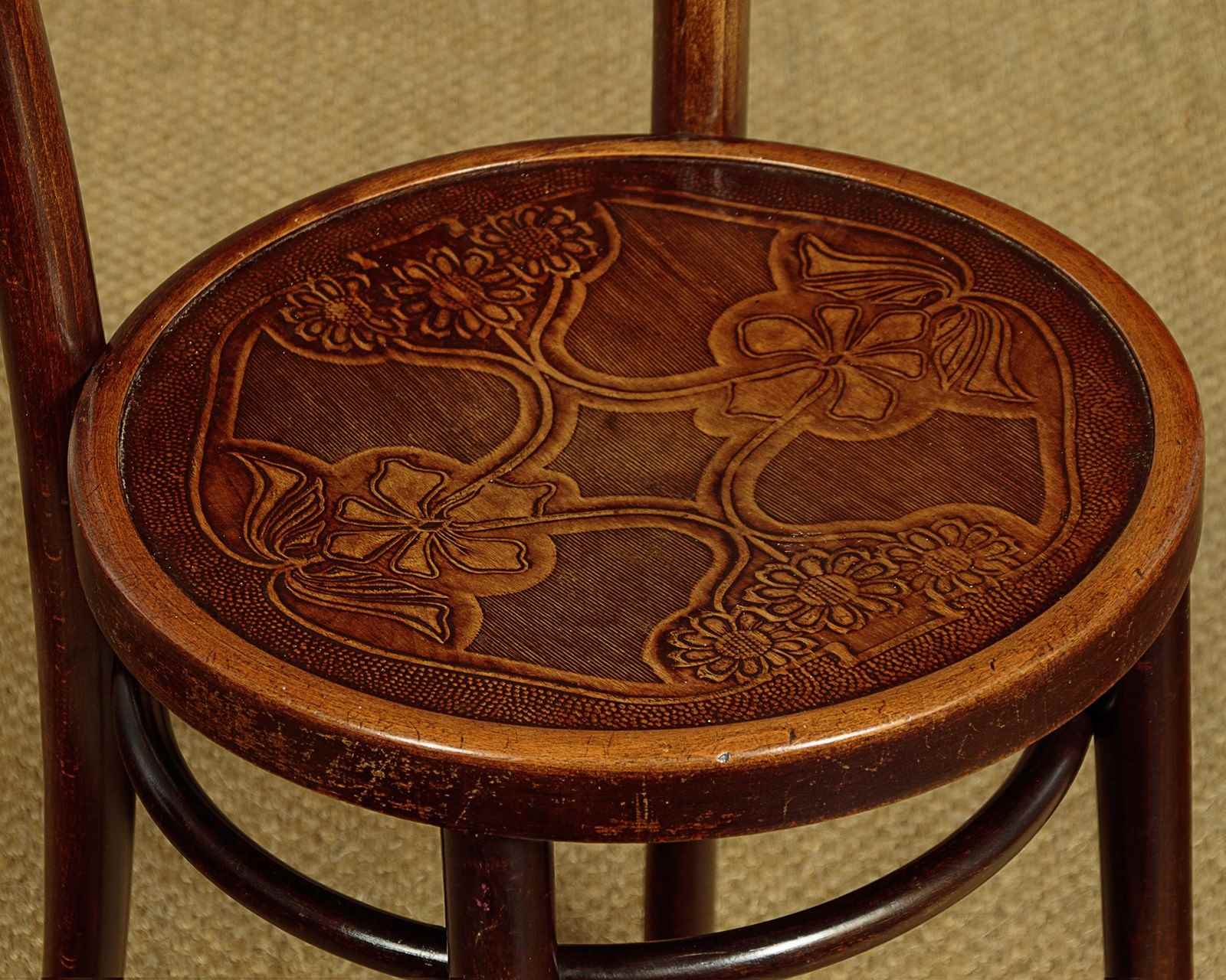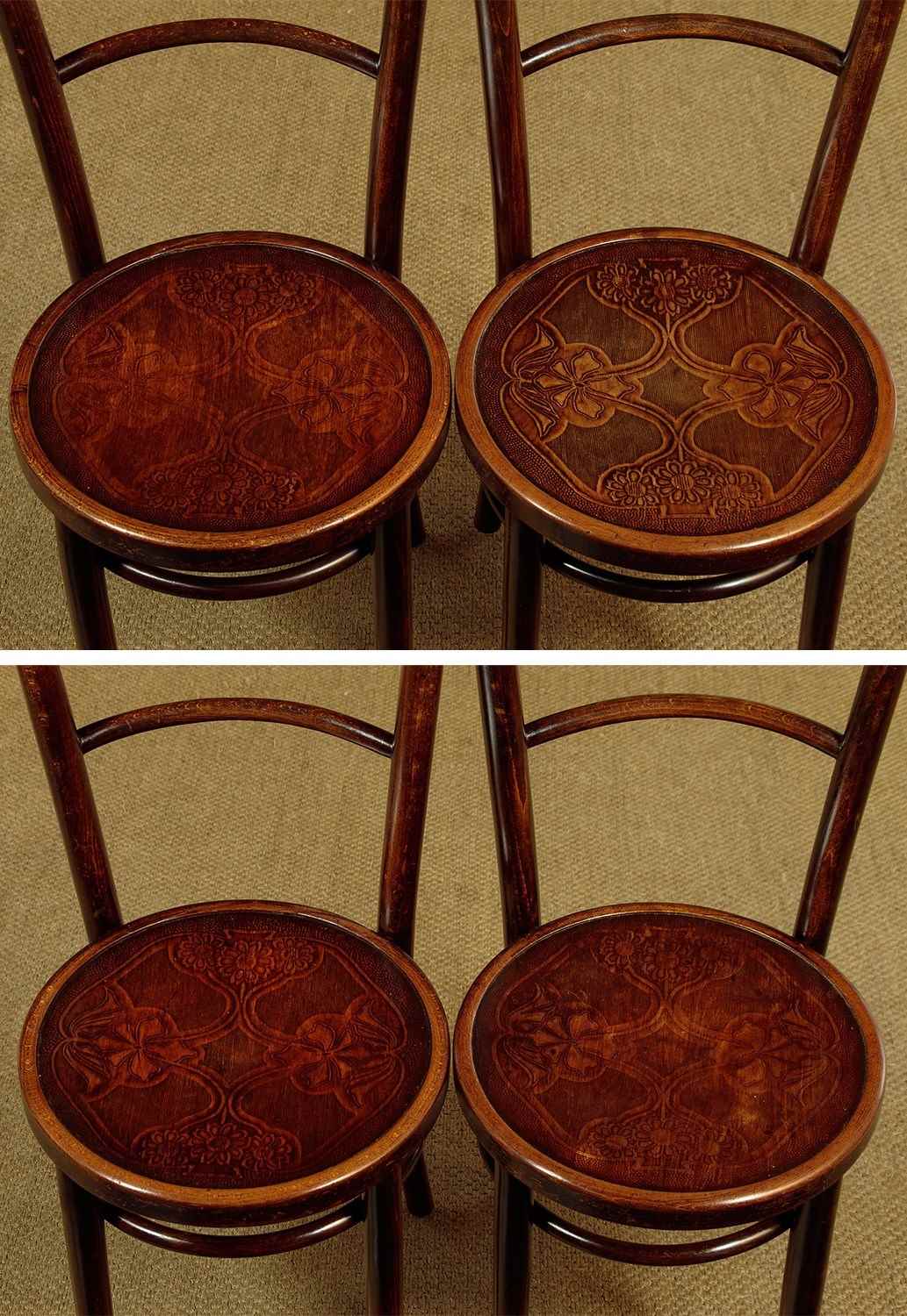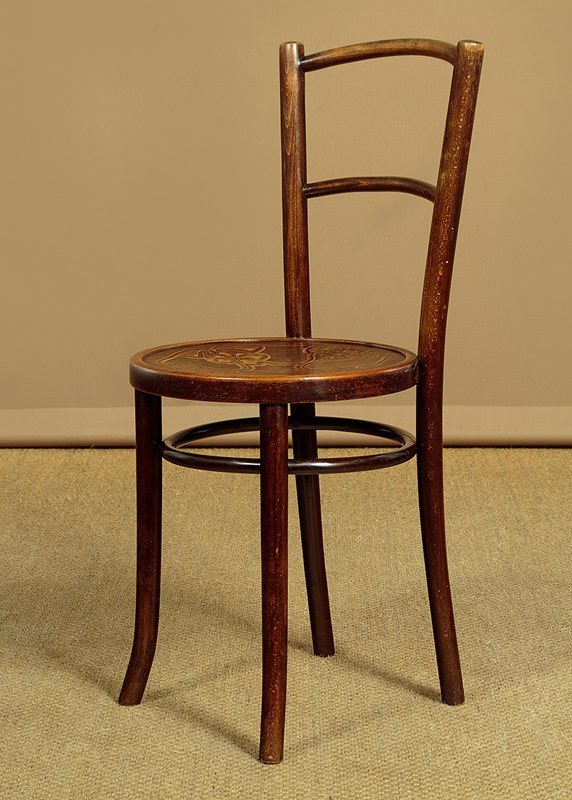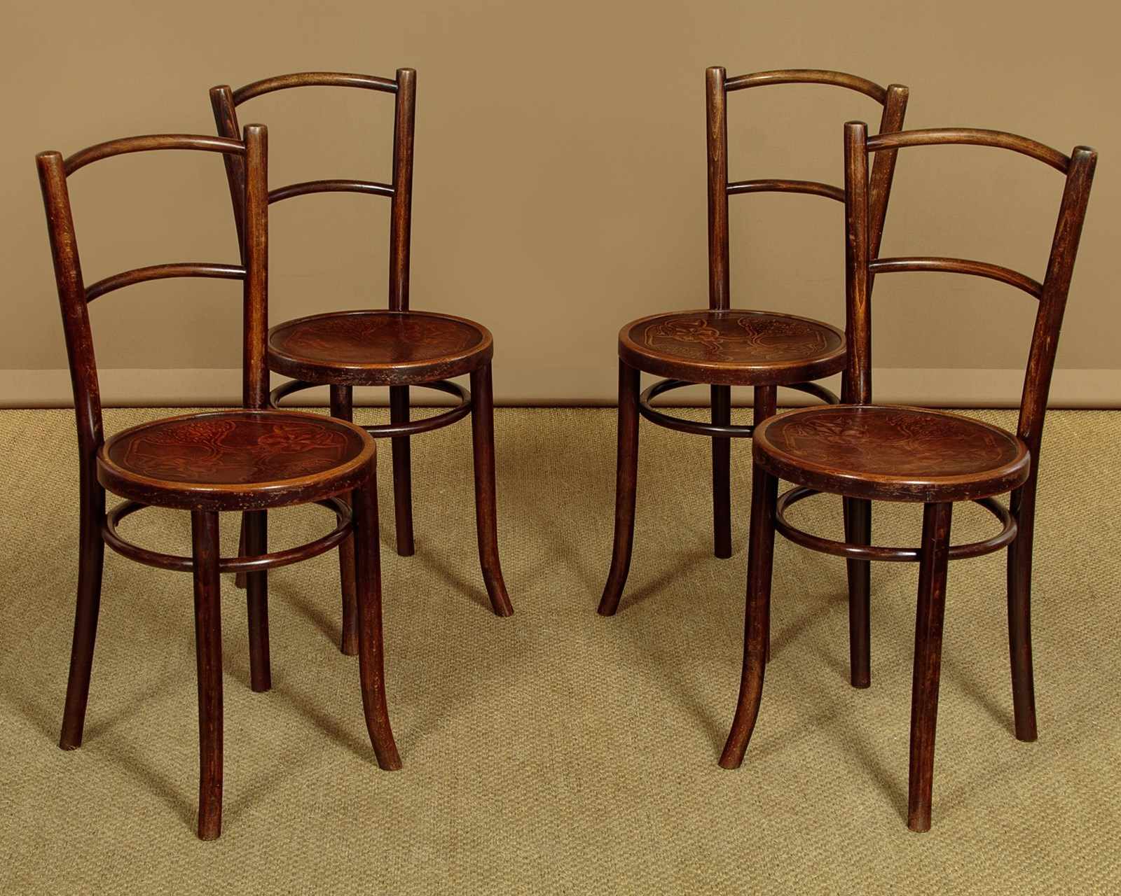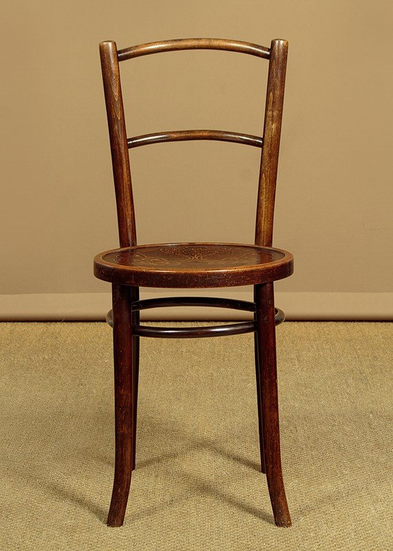 Good set of four Thonet style bentwood bistro dining chairs c.1900. Bentwood frames with curved top rails and back stretchers between splayed rear stiles. Over 15" diameter seats with particularly attractive Art Nouveau style impressed decoration of flower heads. Legs slightly curved outwards at the foot for stability and joined with hoop stretchers. Very good original condition. Cleaned and waxed in our workshops.