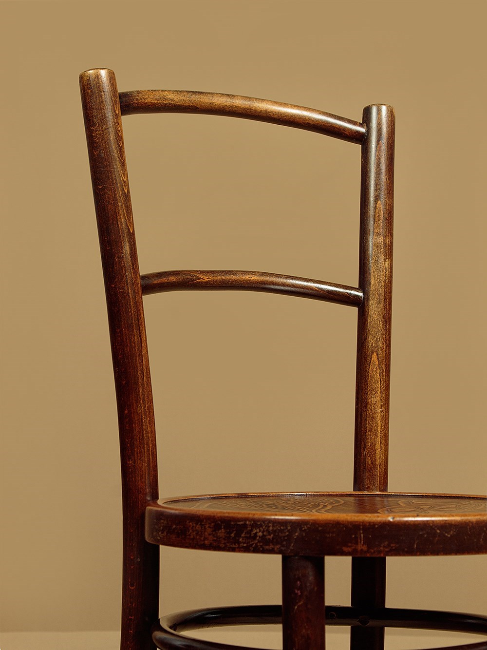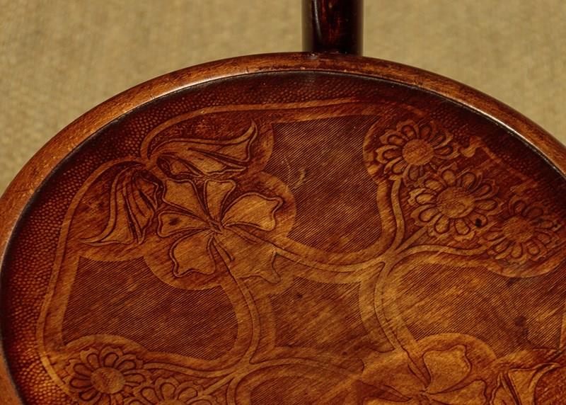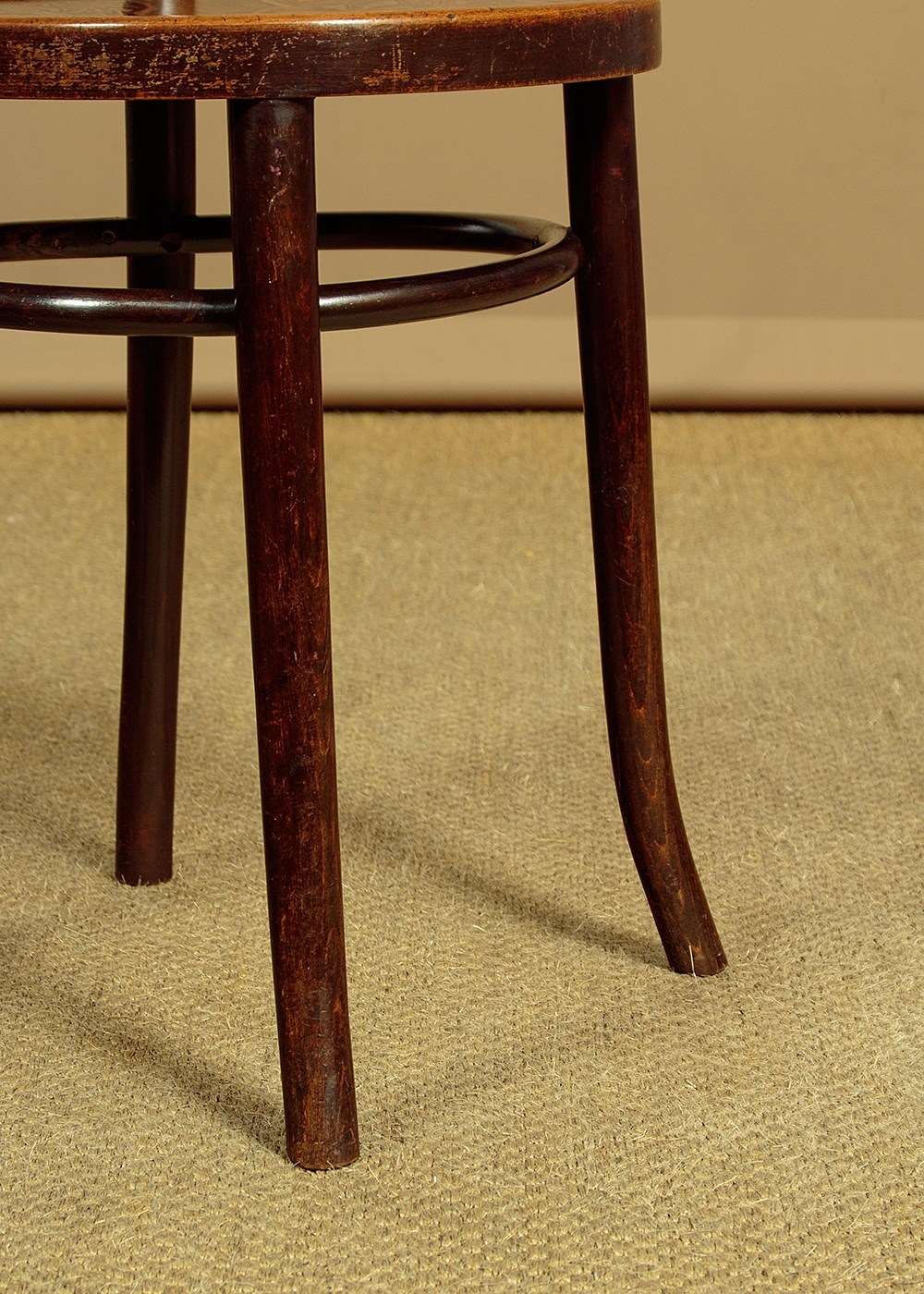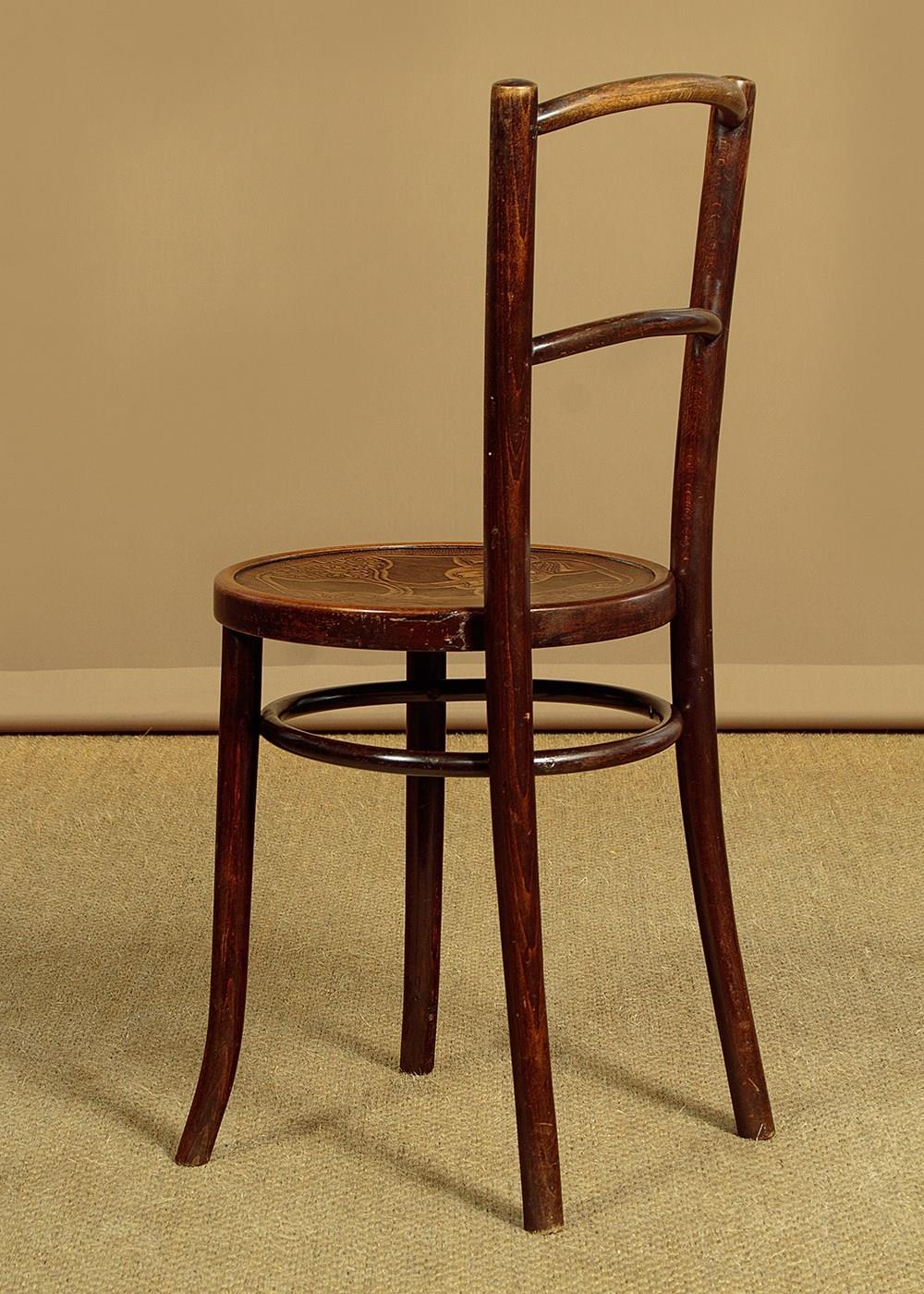 Good set of four Thonet style bentwood bistro dining chairs c.1900. Bentwood frames with curved top rails and back stretchers between splayed rear stiles. Over 15" diameter seats with particularly attractive Art Nouveau style impressed decoration of flower heads. Legs slightly curved outwards at the foot for stability and joined with hoop stretchers. Very good original condition. Cleaned and waxed in our workshops.