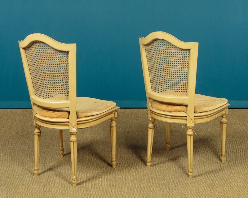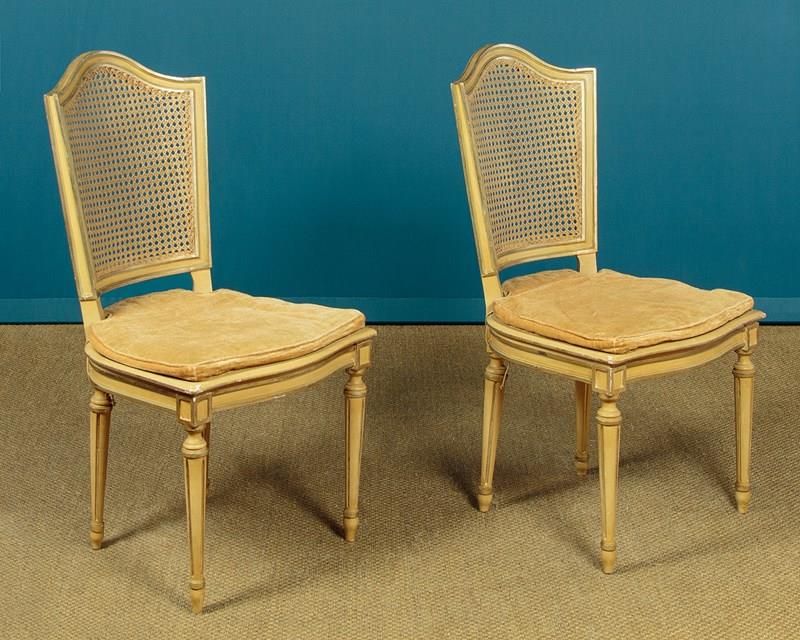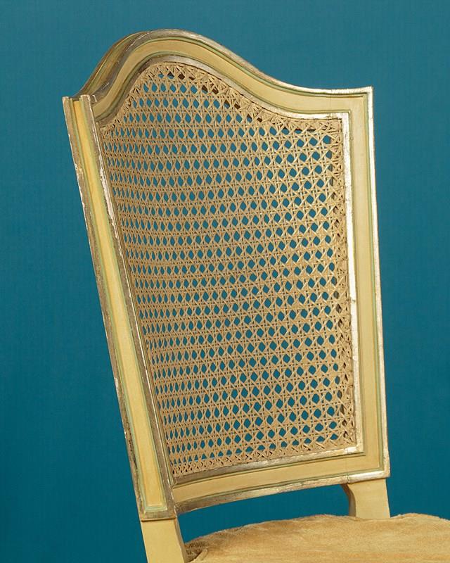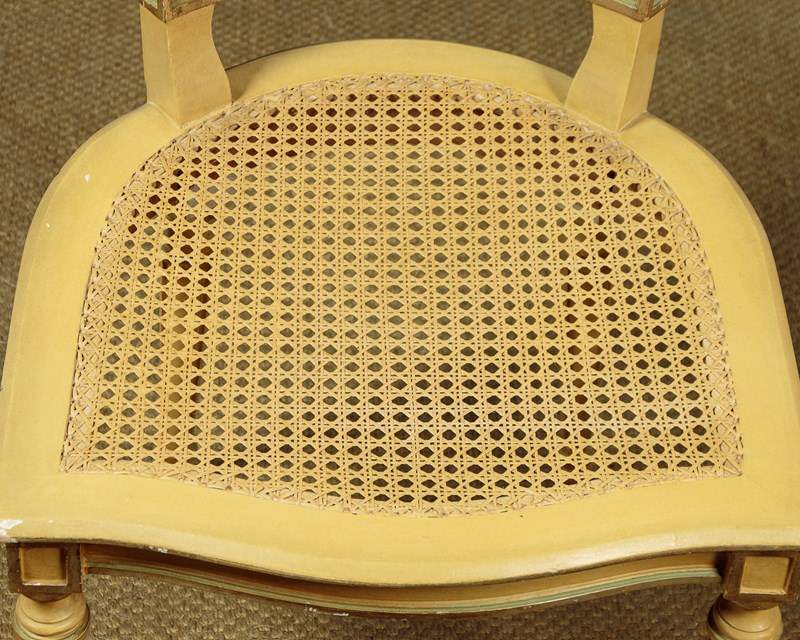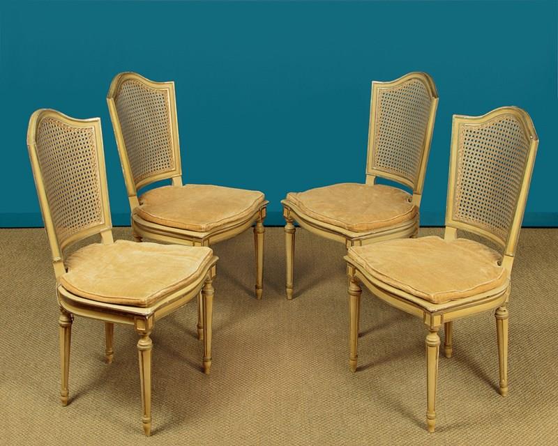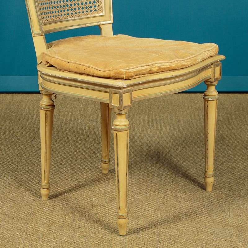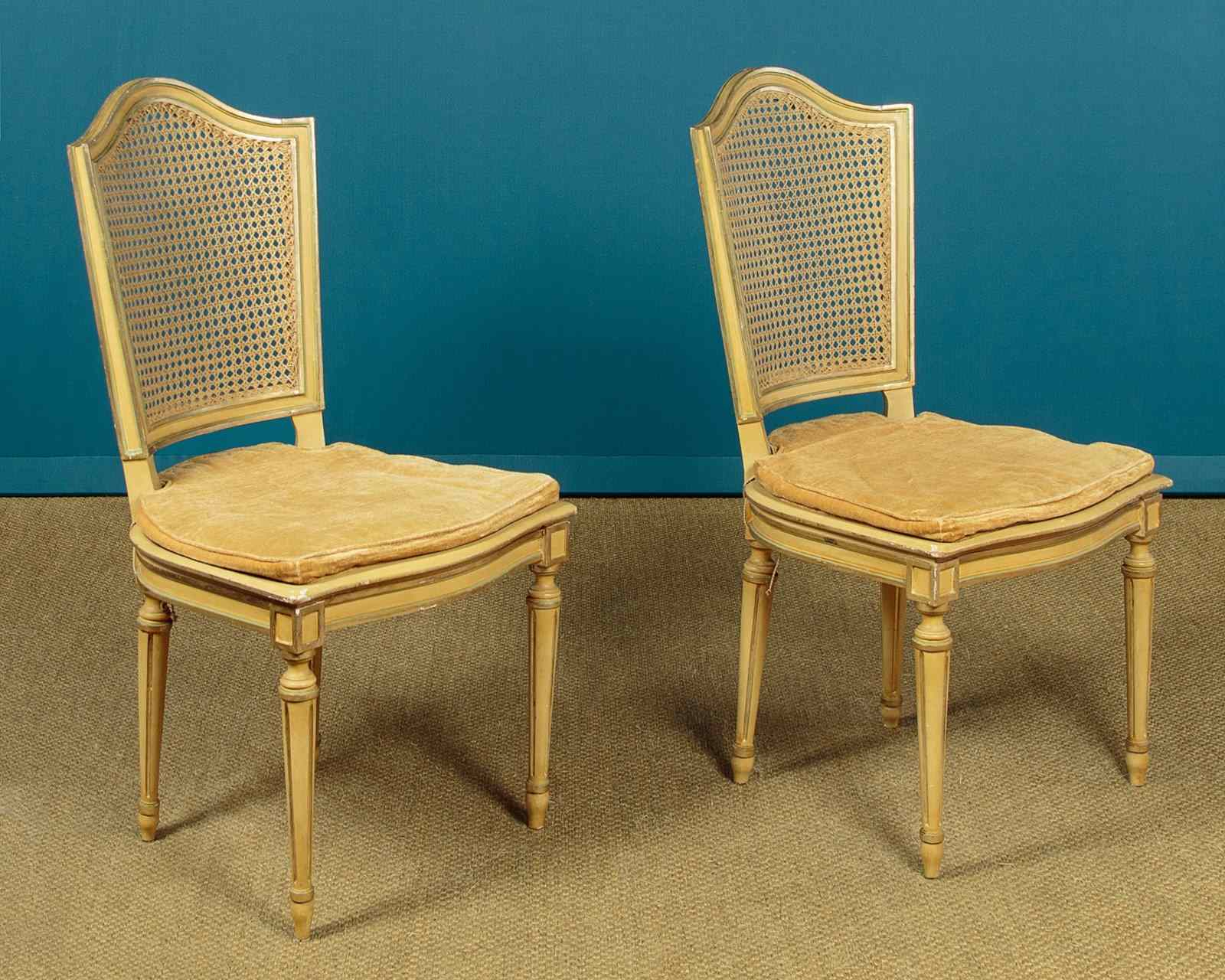 Set of four French painted wooden dining chairs c.1960. Curved backrests with a shaped top rail over a canework panel. Cane seats with loose seat pads. Moulded wooden frames with gilded and pale green detail against the pale yellow ground. Tapering turned and fluted legs front and rear. Minor wear to the paintwork, otherwise very good original condition.