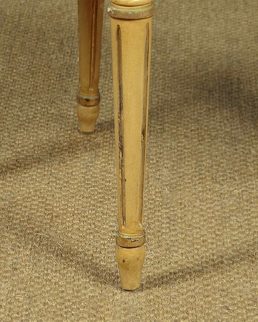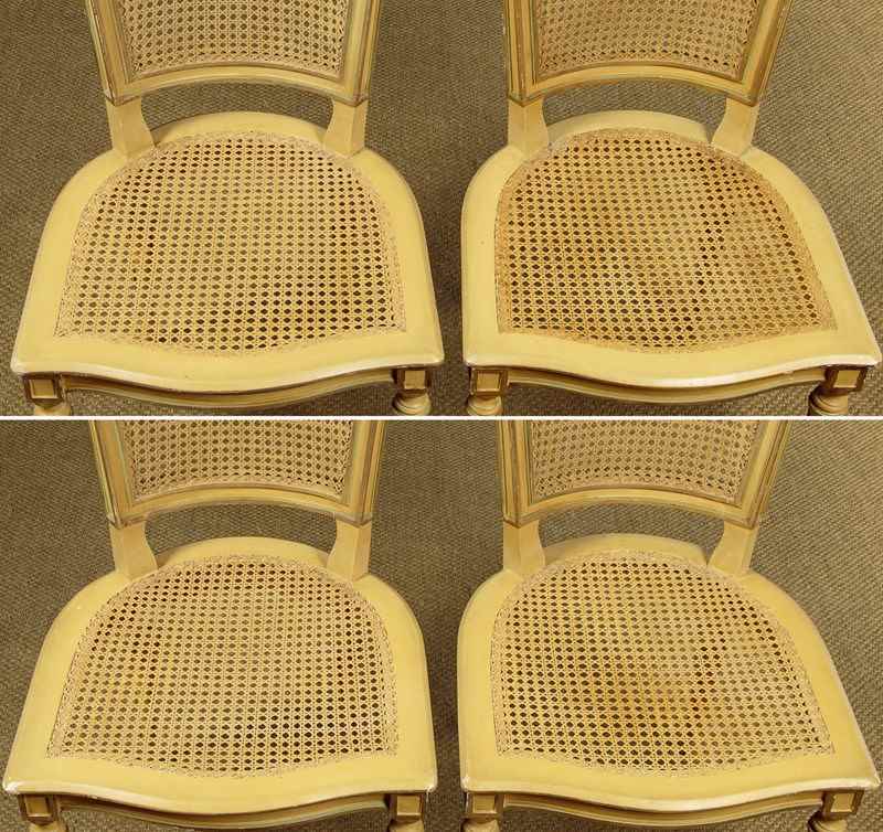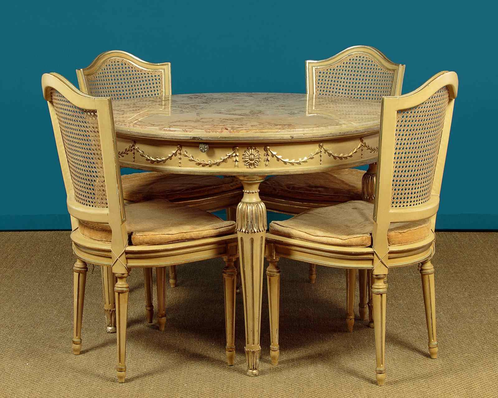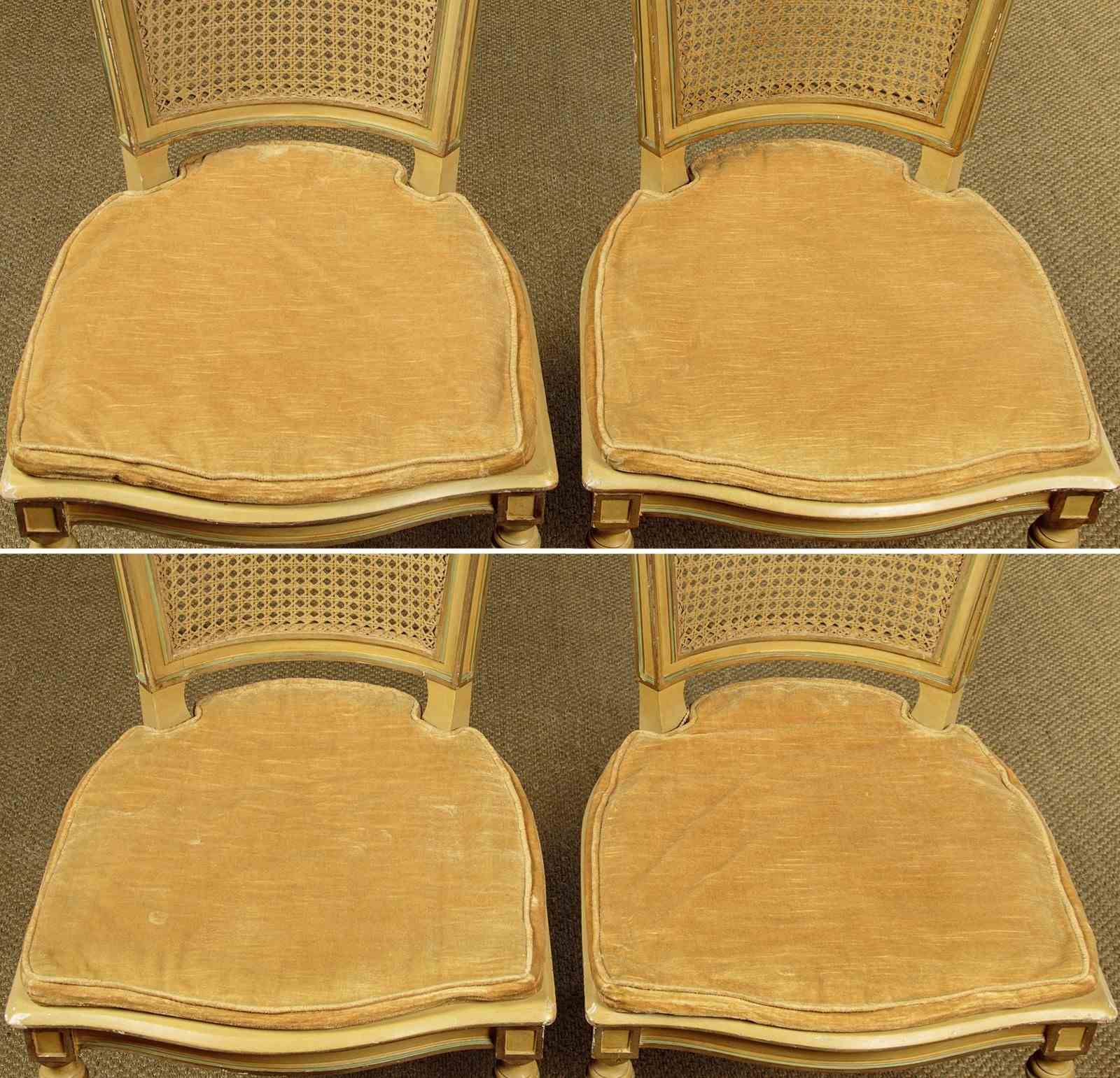 Set of four French painted wooden dining chairs c.1960. Curved backrests with a shaped top rail over a canework panel. Cane seats with loose seat pads. Moulded wooden frames with gilded and pale green detail against the pale yellow ground. Tapering turned and fluted legs front and rear. Minor wear to the paintwork, otherwise very good original condition.