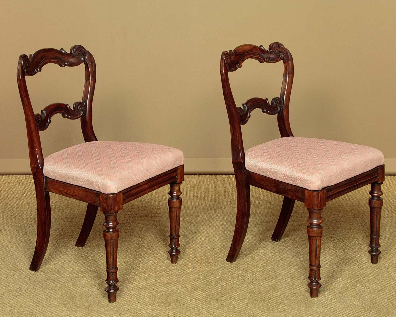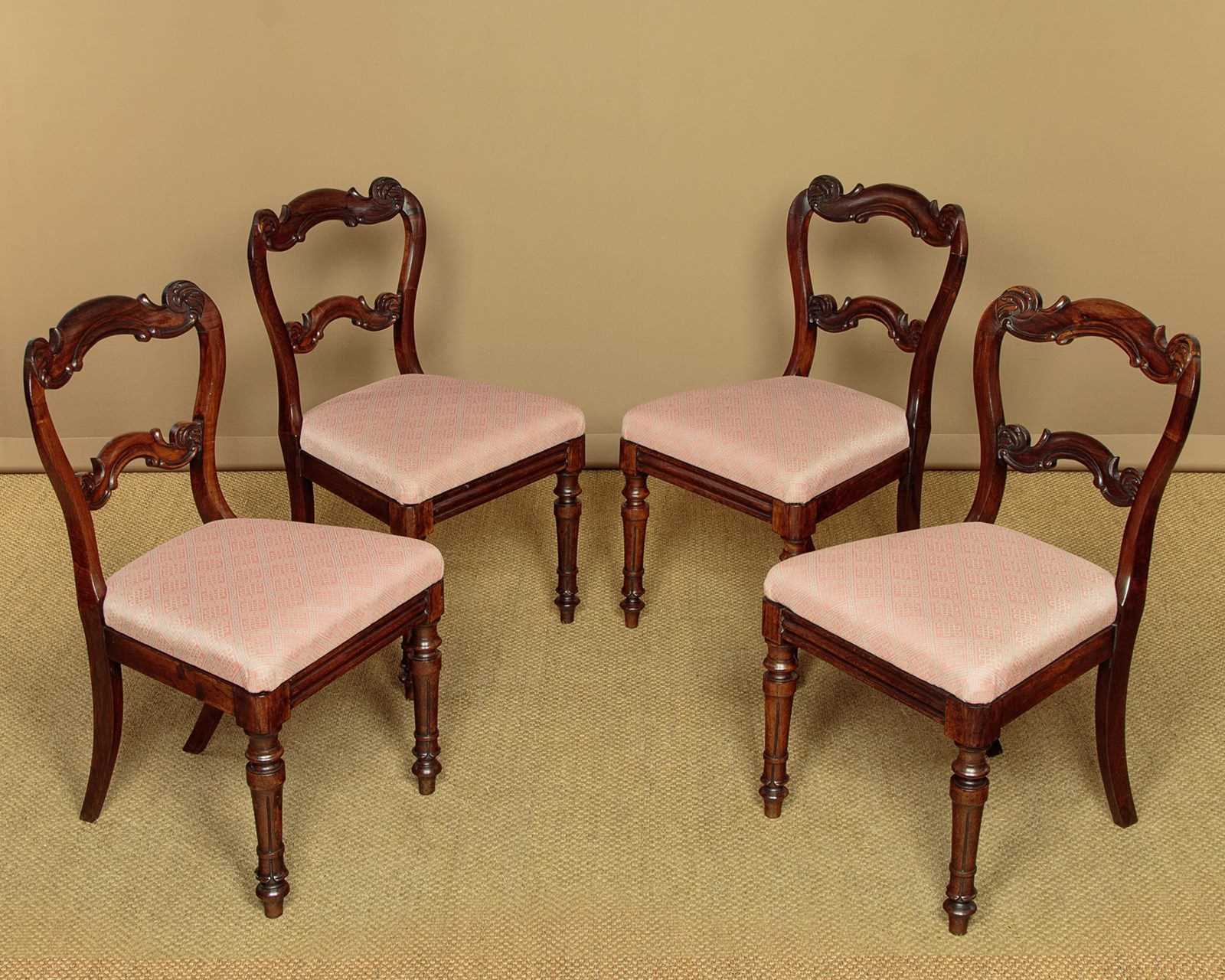 Set of four mid 19th.c. rosewood dining chairs c.1860. Shapely backrest in well figured solid rosewood with carved detail to the cresting rails and stretchers. Removable seat pads upholstered in a woven fabric. Seat height 17". Moulded rail to the front edge below the seat. Raised on good turned and segmented front legs. Very good colour and condition, cleaned and waxed in our workshops with serviceable upholstery.