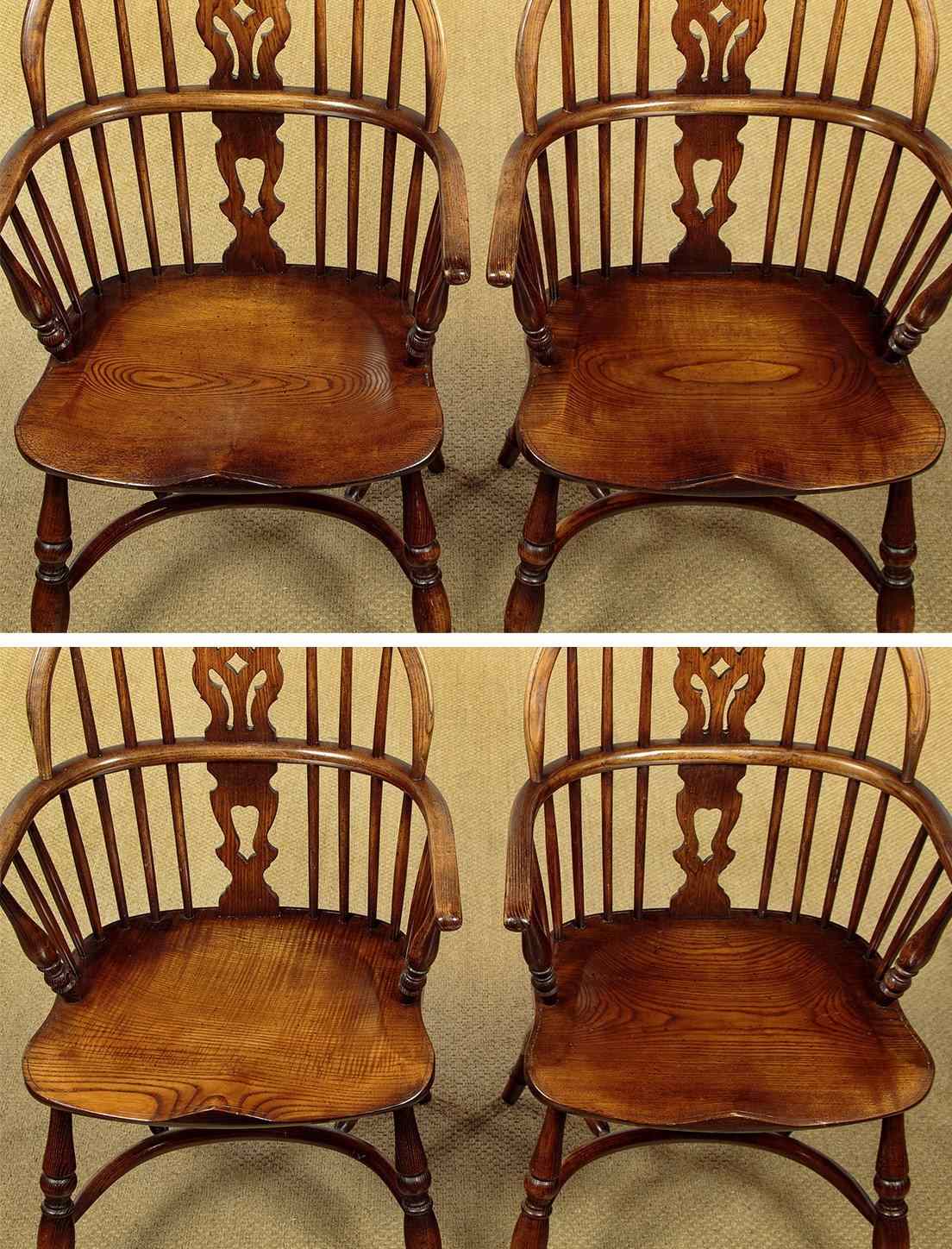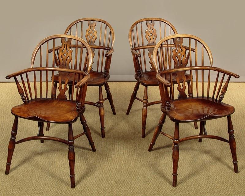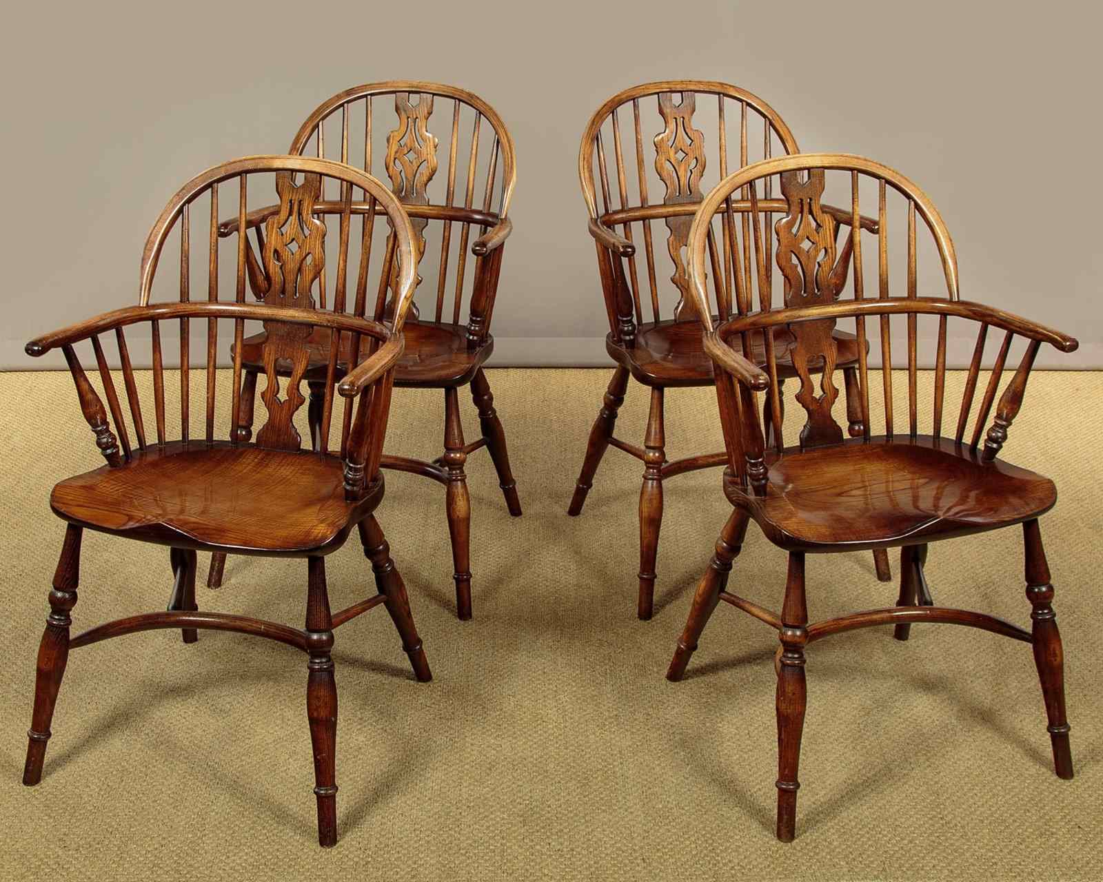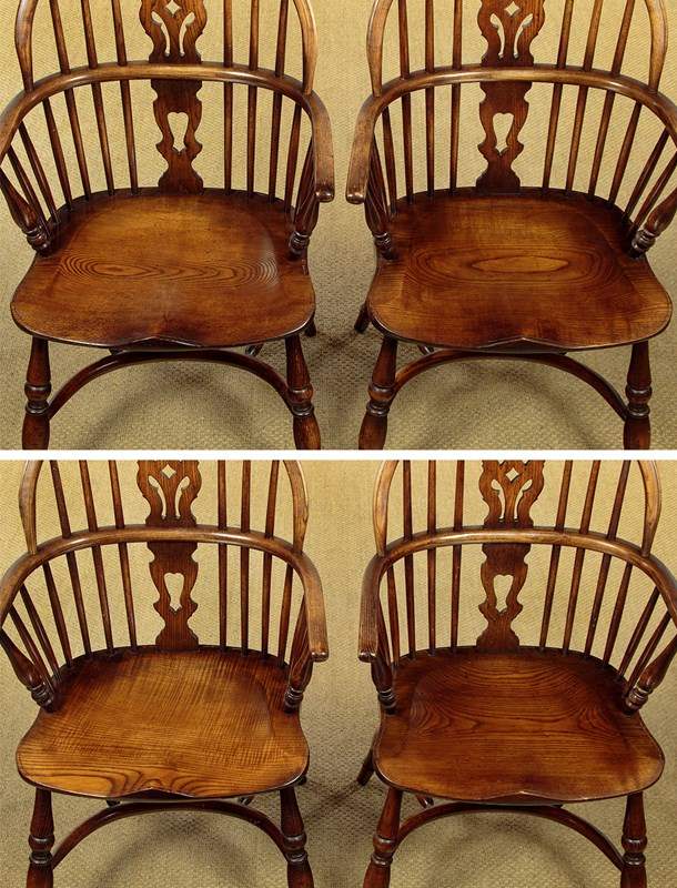 Good quality set of four Windsor armchairs in ash. Steamed top rail and arms joined with shaped and pierced back splats and slim spindles. Shaped detail to the arm terminals, raised on turned supports. Over single piece shaped 'saddle' seats (height 18"). On turned legs, splayed for stability and joined with curving crinoline stretchers. Very good colour and condition.