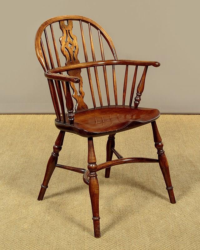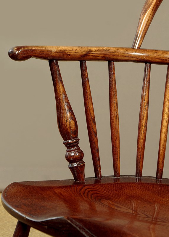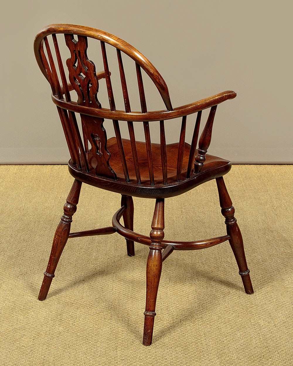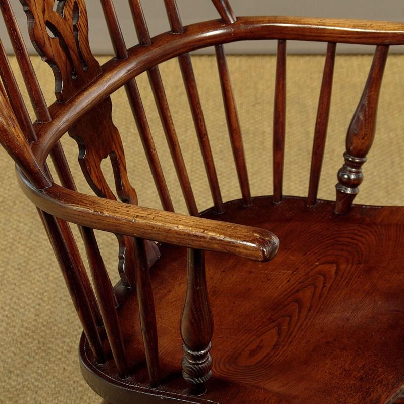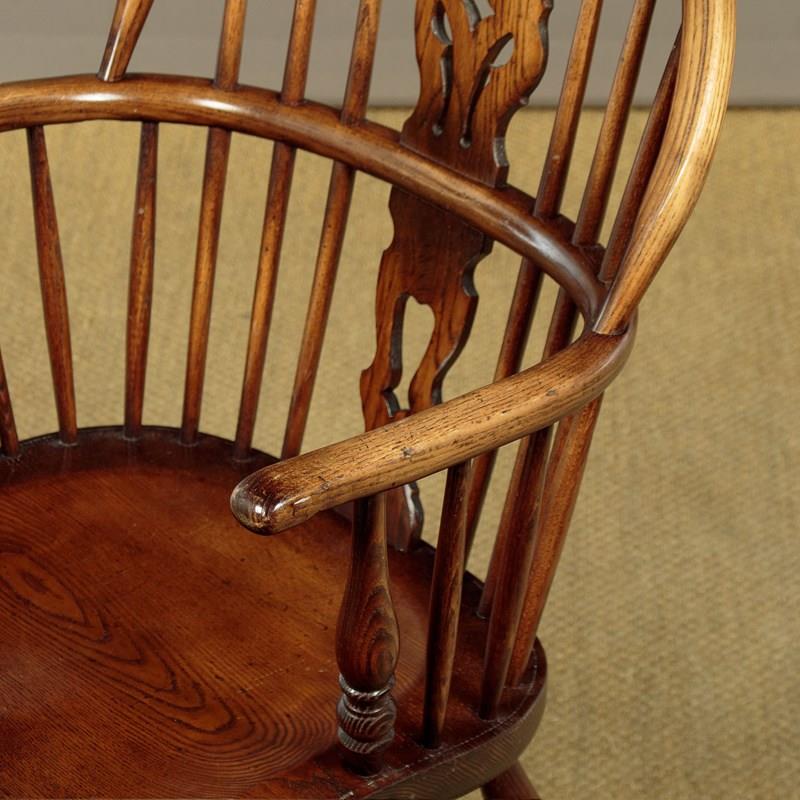 Good quality set of four Windsor armchairs in ash. Steamed top rail and arms joined with shaped and pierced back splats and slim spindles. Shaped detail to the arm terminals, raised on turned supports. Over single piece shaped 'saddle' seats (height 18"). On turned legs, splayed for stability and joined with curving crinoline stretchers. Very good colour and condition.