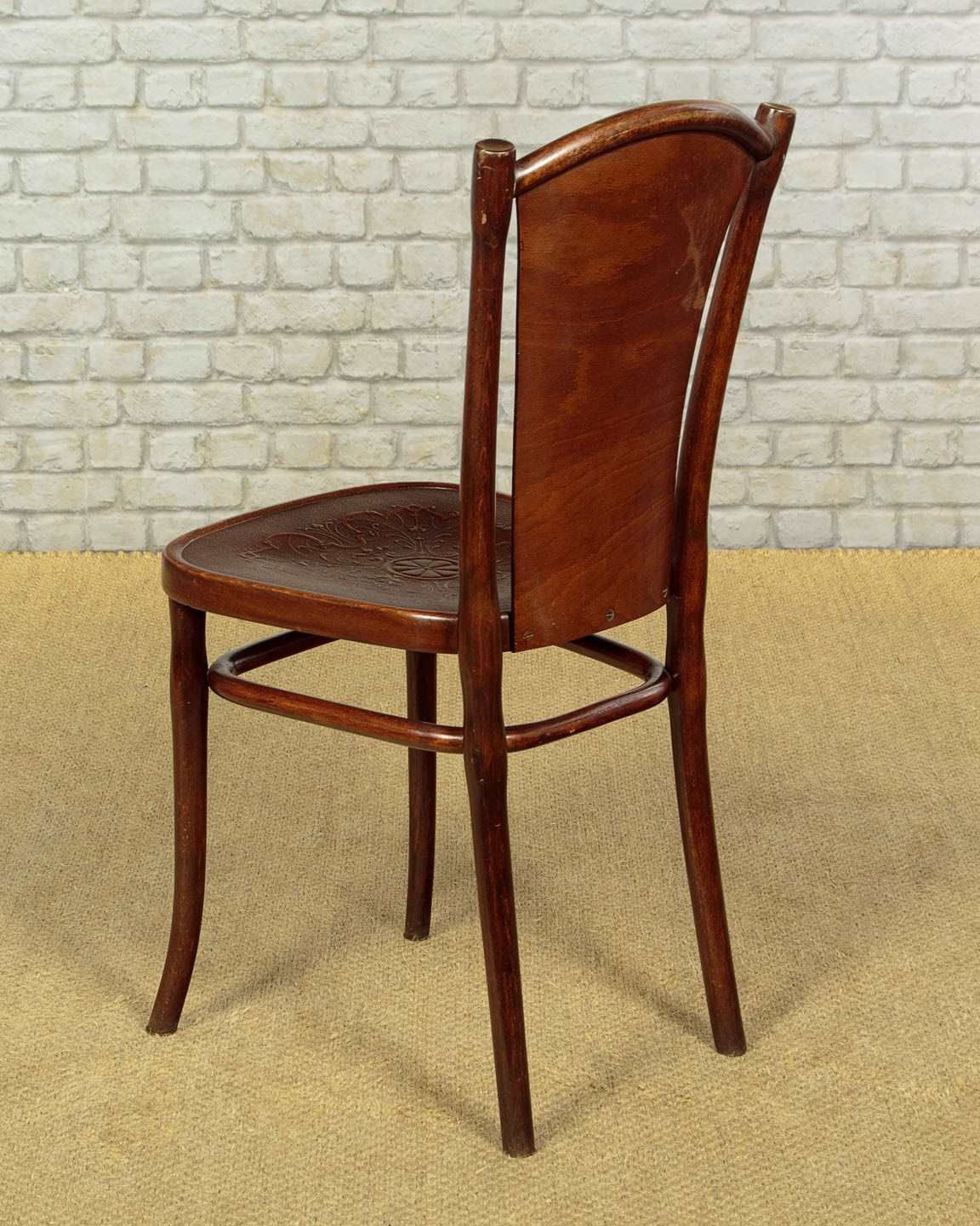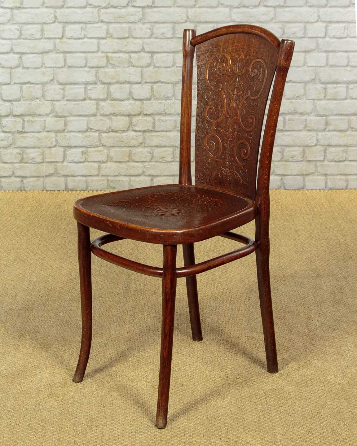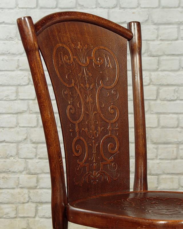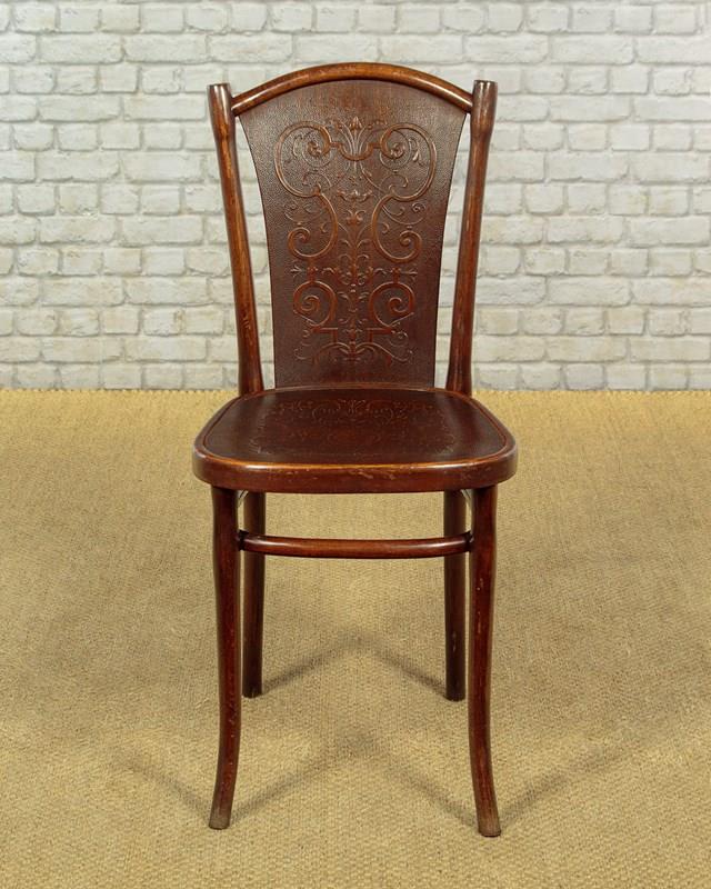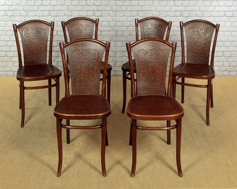 Superb set of six bentwood bistro dining chairs by Thonet, the celebrated inventors of bentwood furniture, c.1900. Simple beechwood frames with backrest and seat panels featuring elaborate pressed decoration. Legs swept slightly outwards for stability and joined with a hoop stretcher. Paper labels for Thonet of Wien (Vienna) to the underside. Excellent colour and condition, cleaned and waxed in our workshops.