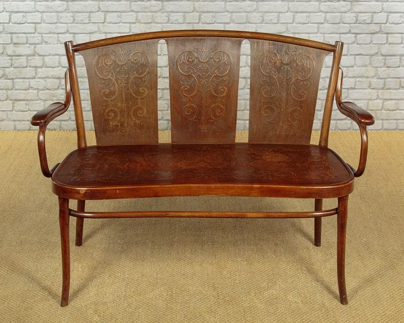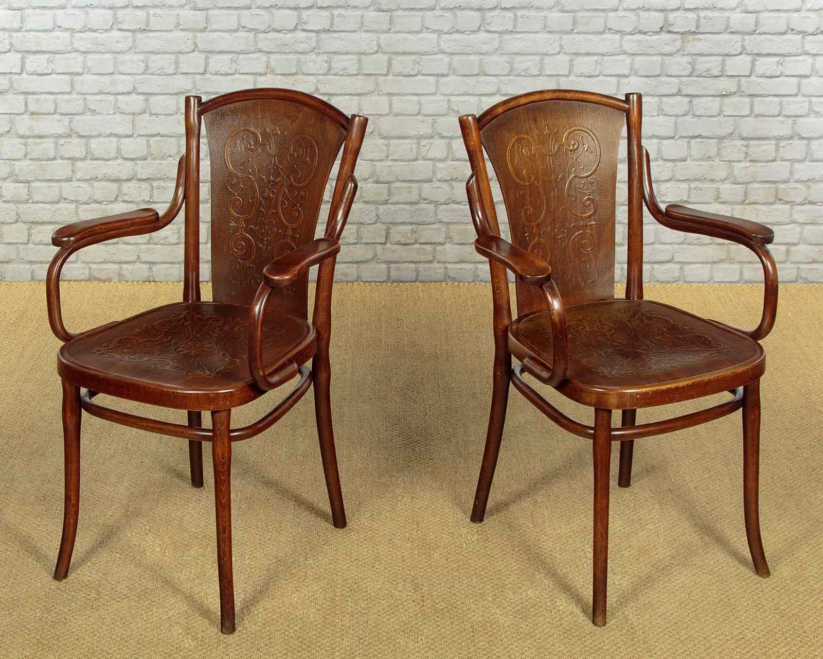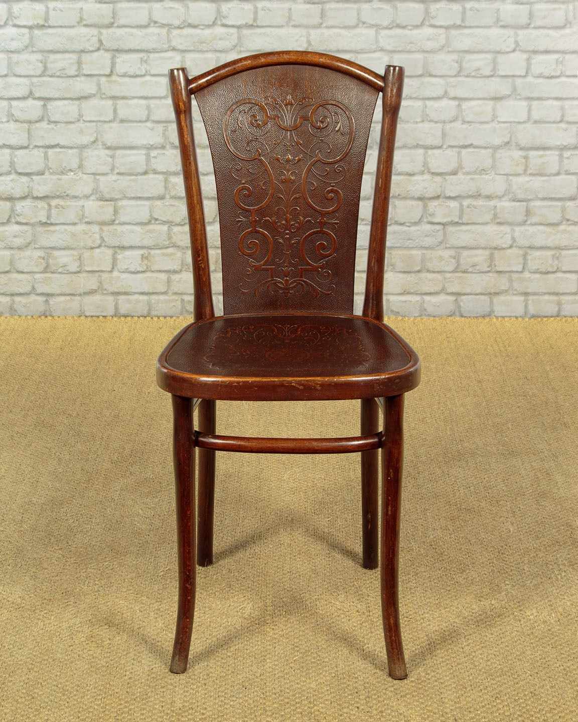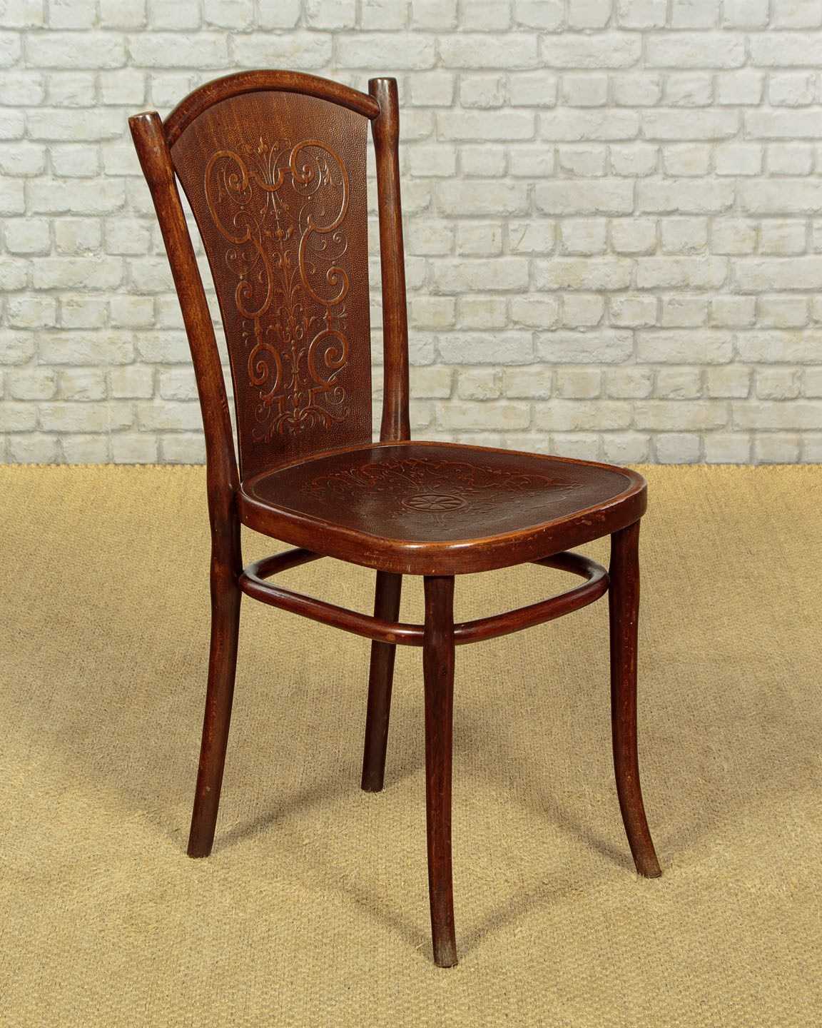 Superb set of six bentwood bistro dining chairs by Thonet, the celebrated inventors of bentwood furniture, c.1900. Simple beechwood frames with backrest and seat panels featuring elaborate pressed decoration. Legs swept slightly outwards for stability and joined with a hoop stretcher. Paper labels for Thonet of Wien (Vienna) to the underside. Excellent colour and condition, cleaned and waxed in our workshops.
