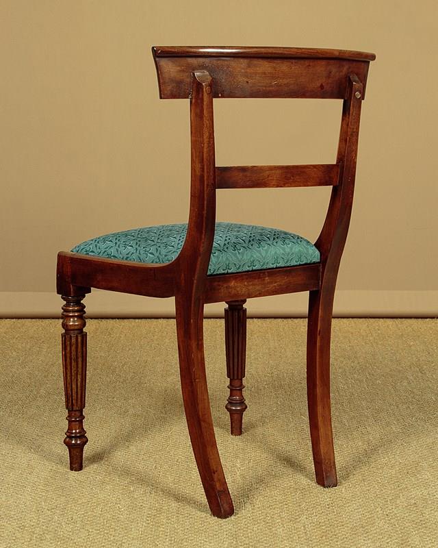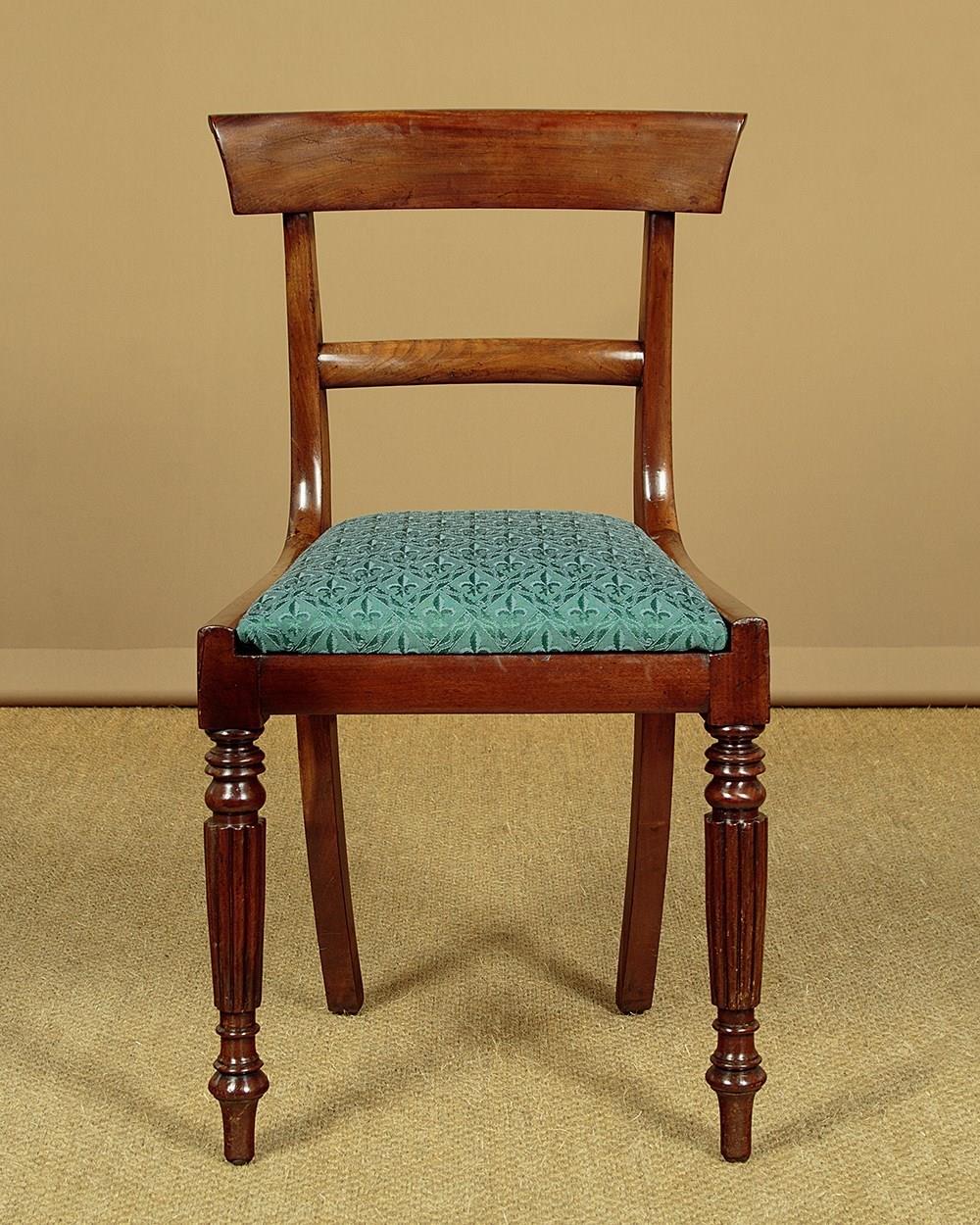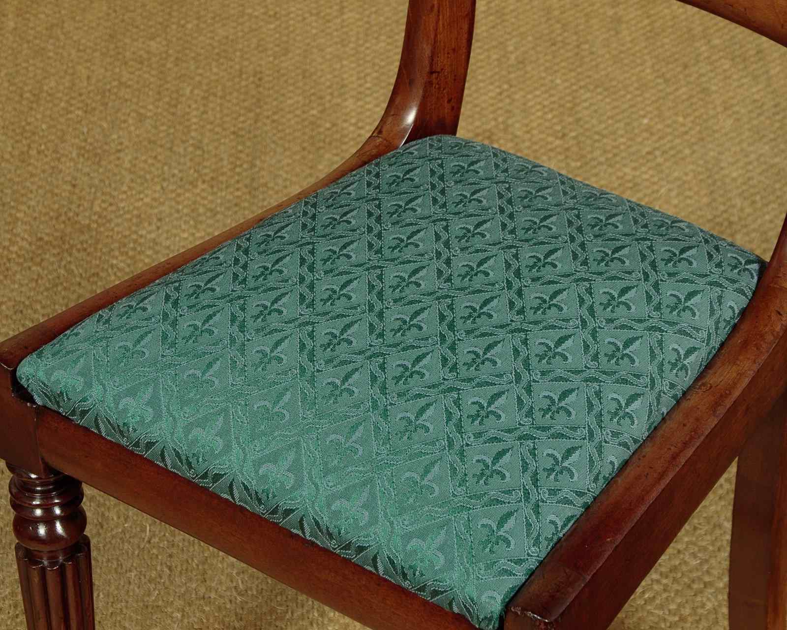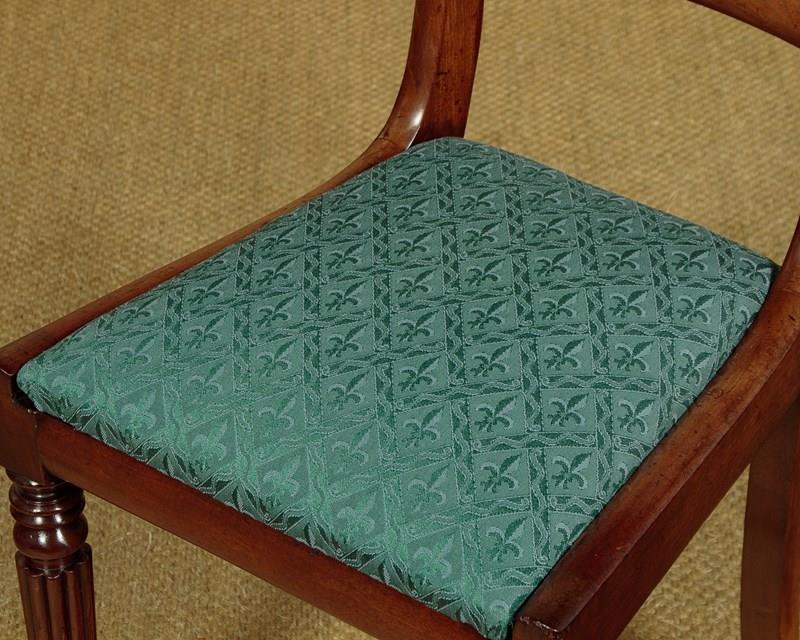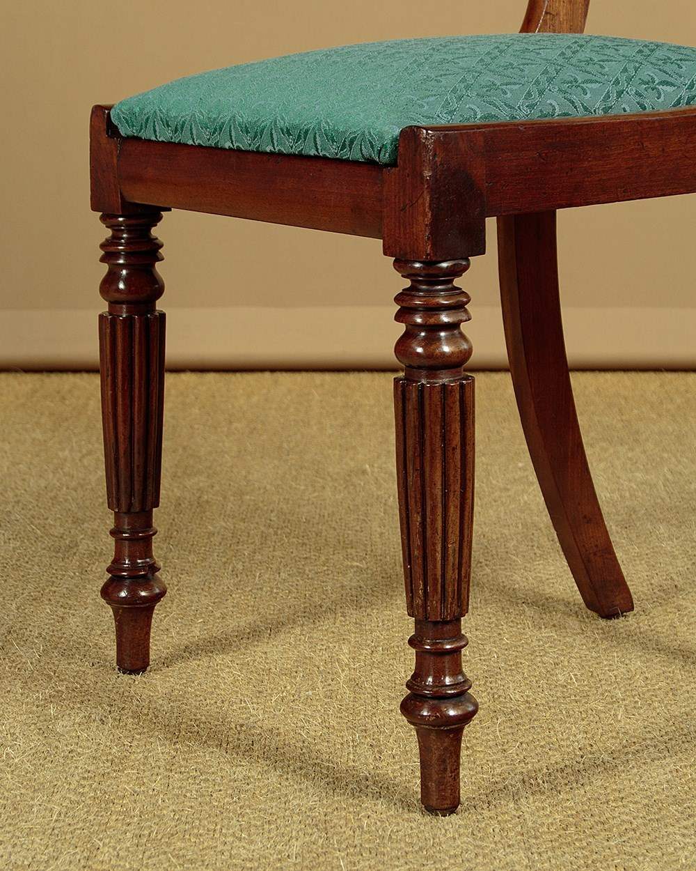 Set of six William IV mahogany dining chairs c.1835. Solid mahogany frames with broad curved back rests with rollover tops and a curved stretcher below. Loose seat pads freshly upholstered in a green flat weave with a fleur-de-lis pattern. Raised on crisply turned front and reeded front legs in the manner of Gillows of Lancaster. Excellent colour and condition, cleaned and waxed in our workshops.