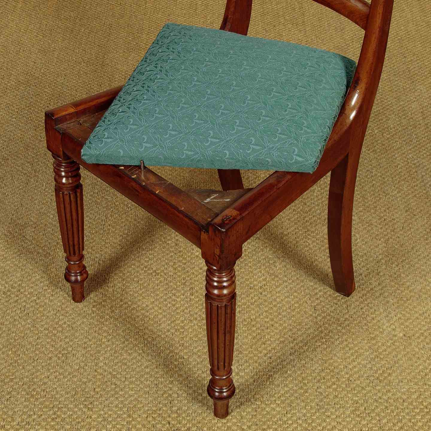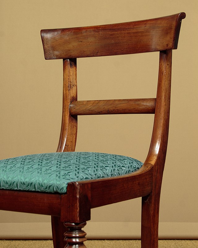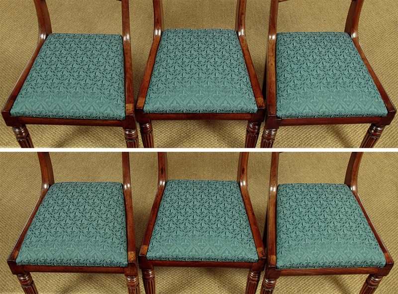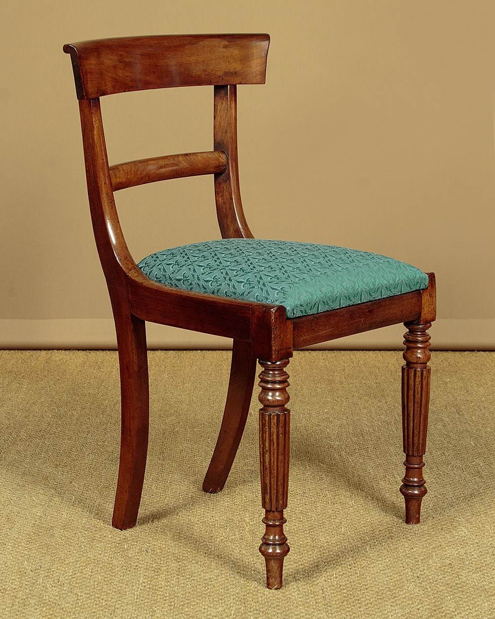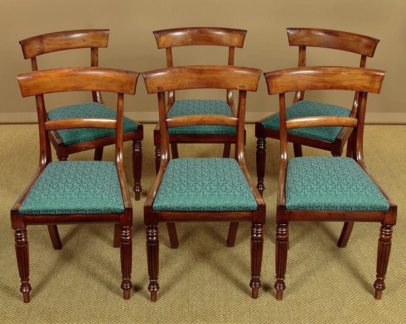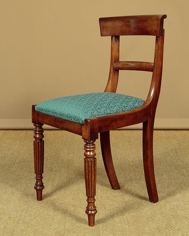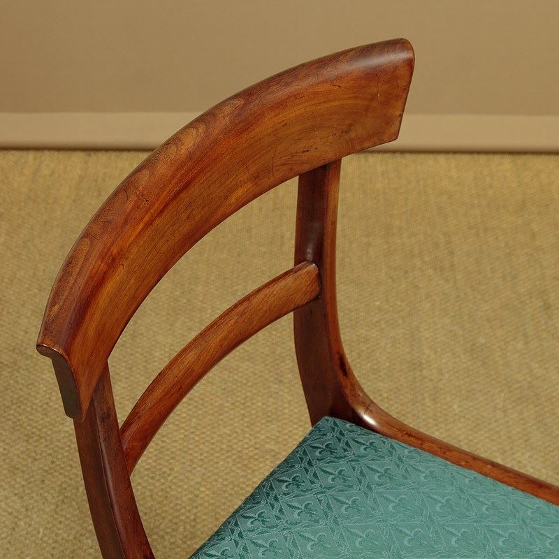 Set of six William IV mahogany dining chairs c.1835. Solid mahogany frames with broad curved back rests with rollover tops and a curved stretcher below. Loose seat pads freshly upholstered in a green flat weave with a fleur-de-lis pattern. Raised on crisply turned front and reeded front legs in the manner of Gillows of Lancaster. Excellent colour and condition, cleaned and waxed in our workshops.