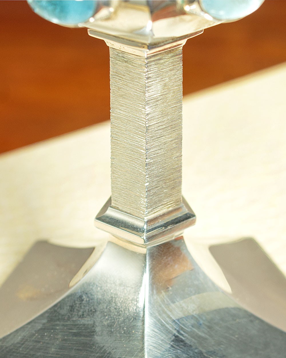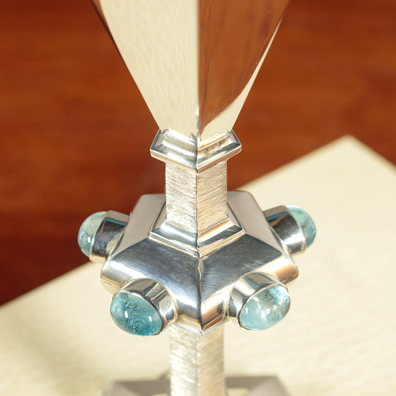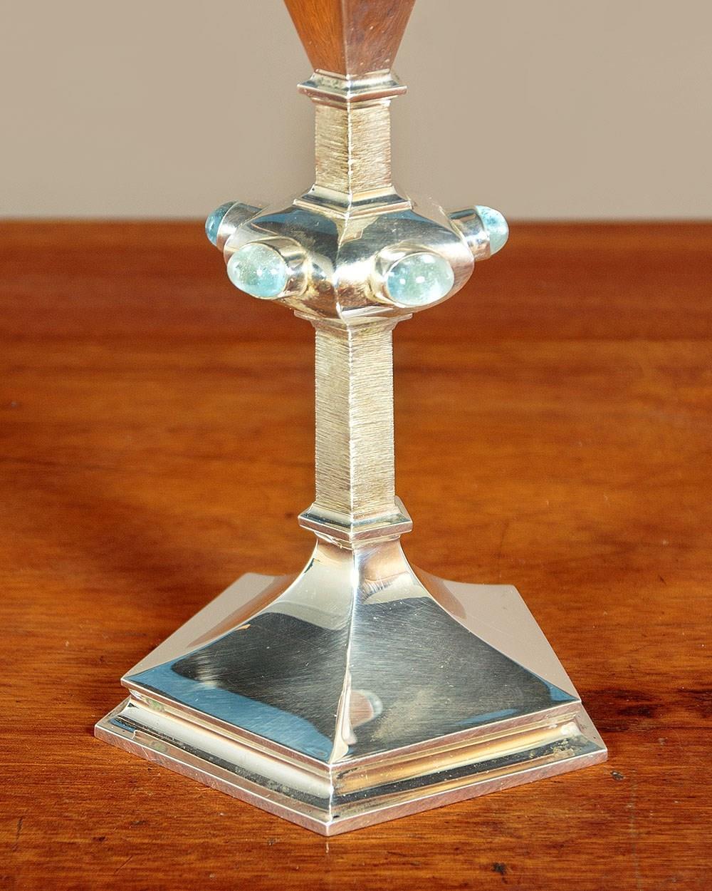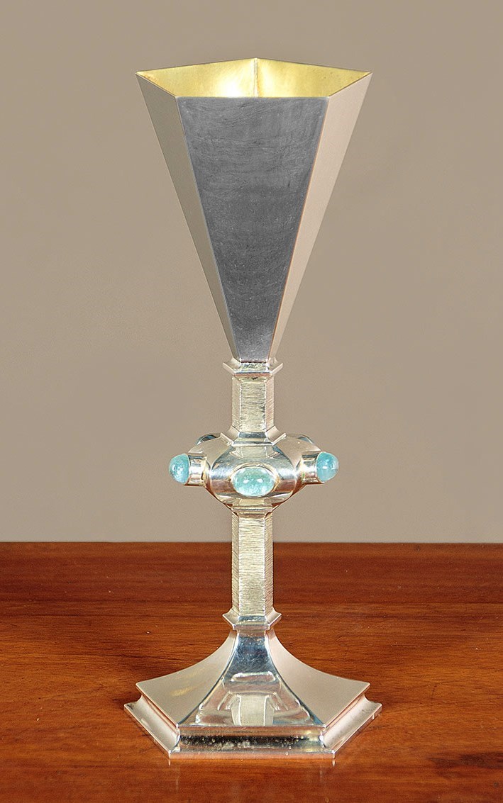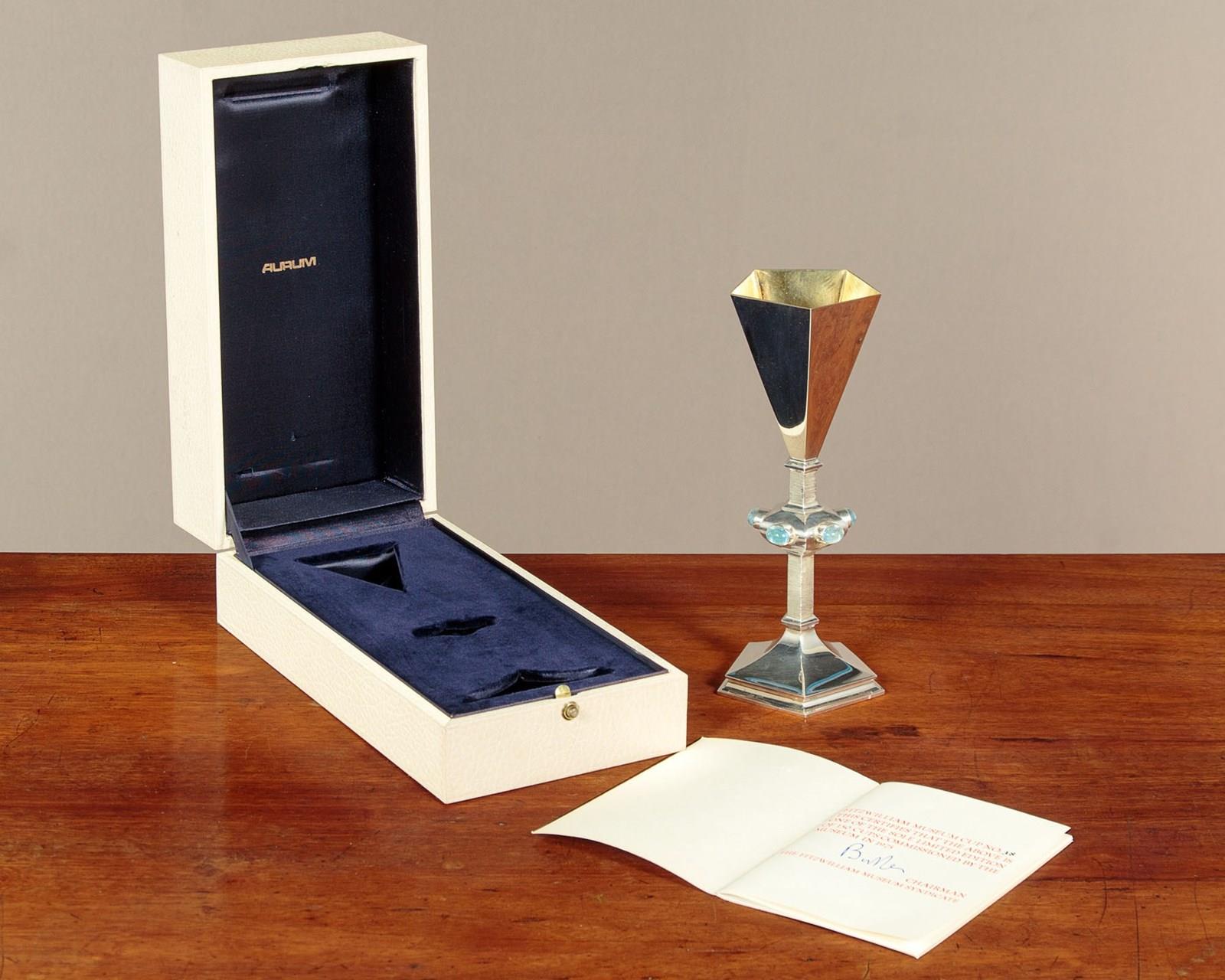 Beautiful 20th.c. English silver goblet or cup hallmarked London 1975. Commissioned as an edition of 150 by the Fitzwilliam museum Cambridge and designed by the celebrated British silversmith Jocelyn Burton (1946 - 2020) for Aurum designs. Weight 12oz. Standing 9" tall with a tapering pentagonal bowl with gilded interior on a stem with scored surface texture and a 'knot' set with five pale blue topaz cabochons. Flared base stamped on the underside with a full set of hallmarks, the Fitzwilliam crest and numbered 38/150.