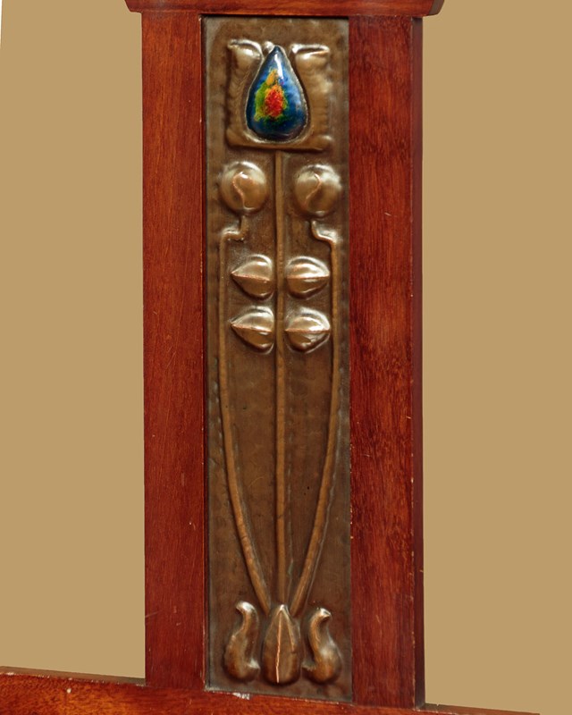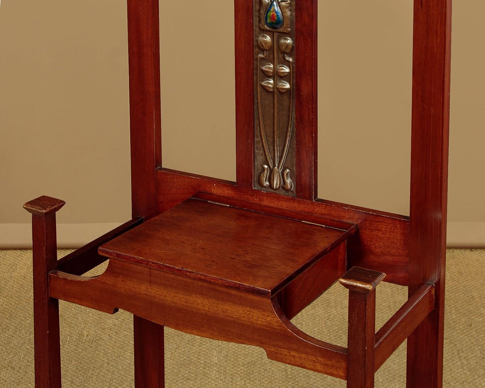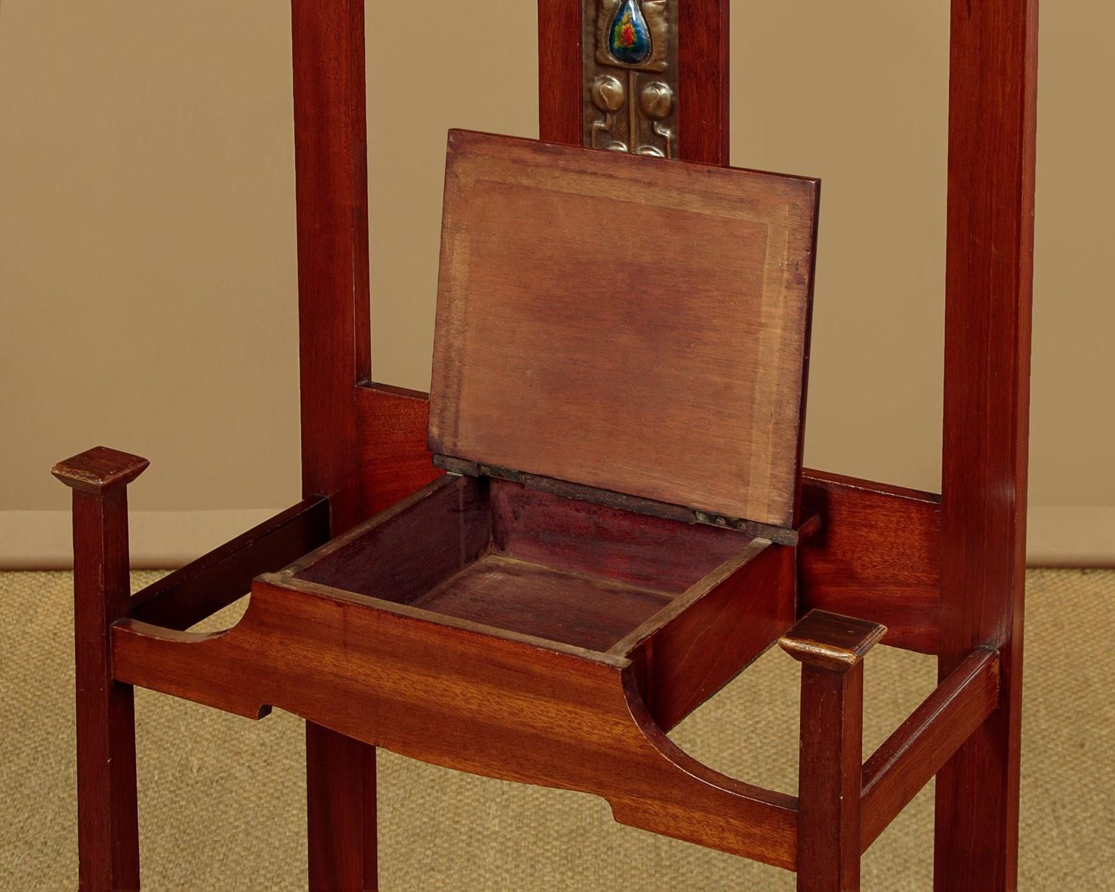 Small Arts & Crafts or Art Nouveau walnut hall stand by the acclaimed 'cabinet 'Art Furniture' makers Shapland & Petter of Barnstaple c.1900. Just 29½” wide. With seven double hooks for hats and coats etc. arranged on a solid walnut frame around a central mirror and shelf. Over the centre splat pierced with a heart shaped cutaway above a beautiful repoussé copper panel, a typical signature detail of Shapland & Petter’s furniture, featuring a stylized plant motif with enamelled detail. Small glove box with a lift-up lid flanked on each side with stick or umbrella stands with original removable drip trays in the base. Flared square tops to the front and rear stiles, repeated as feet at the front. Clearly stamped with the serial number R1180 on the rear. Excellent colour and condition with replacement hooks.