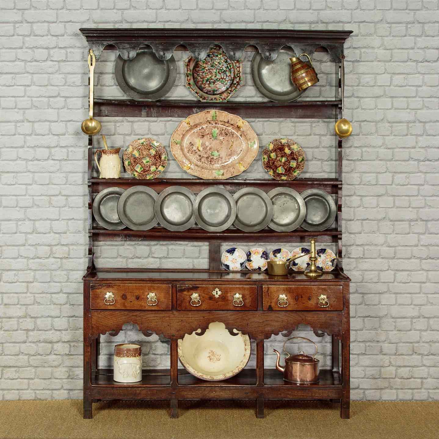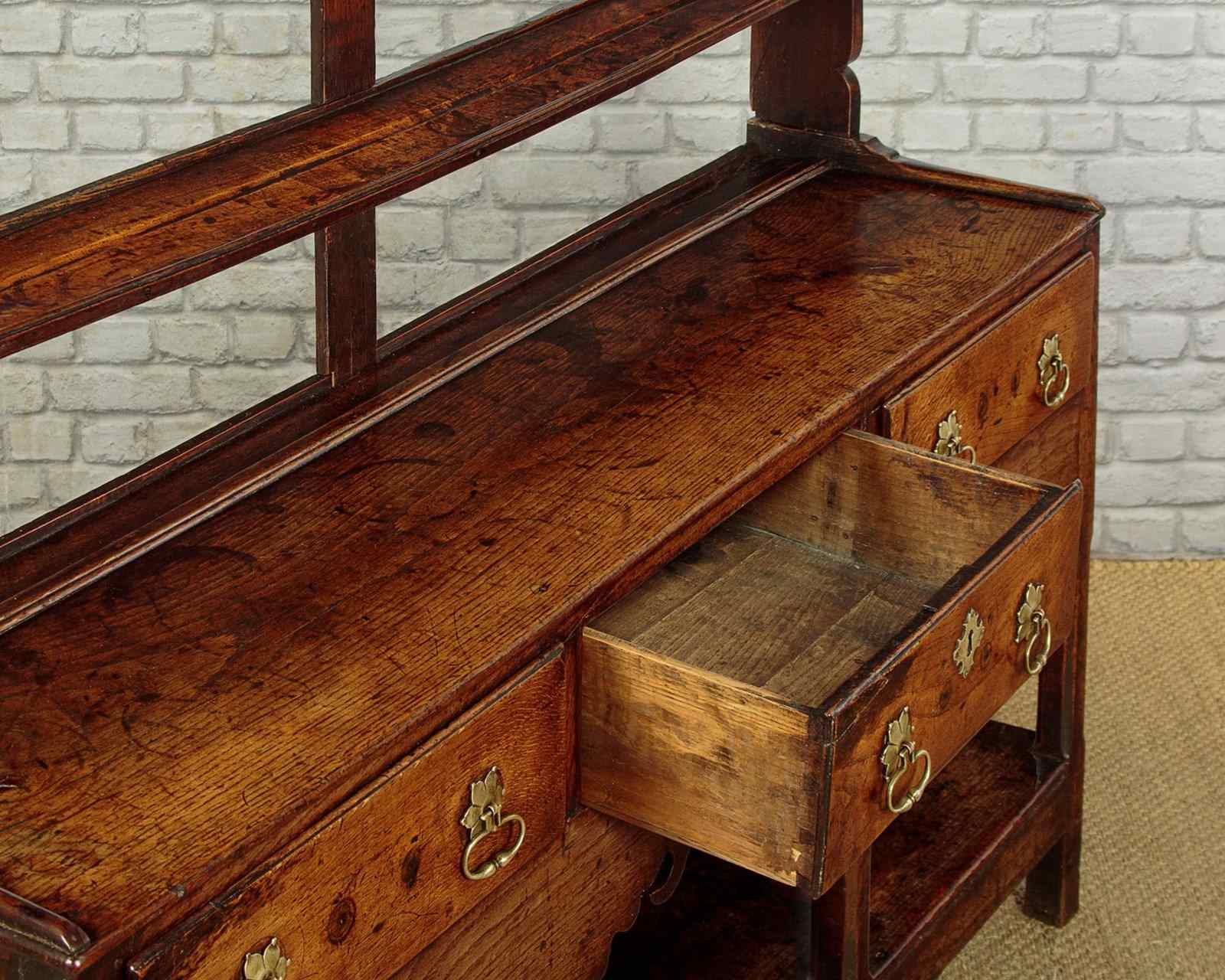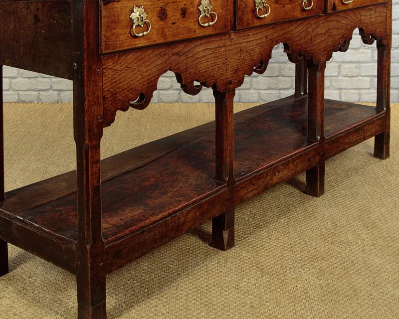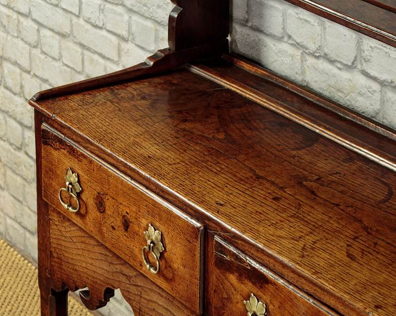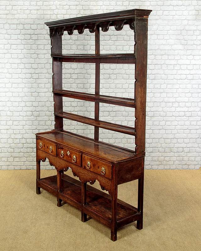 Delightful little Welsh dresser with open rack and potboard, mid Wales c.1800. Open back plate rack with a moulded cornice and attractive wavy frieze with iron cup hooks over three shelves, each with a groove and support for displaying plates etc. Note the shaped detail to the sides. Over a low base (28") with three drawers. Single plank top with a raised moulding along the back edge to hold plates and long 'shoes' at the sides. Moulded edge to the drawer fronts with later brass handles and ash drawer linings. Particularly attractive elaborately shaped apron below the drawers. Raised on chamfered square legs front and rear joined with an open potboard display shelf with the original oak boards. Very good condition with some earlier repairs and restorations. Superb colour and patina. Cleaned and waxed in our workshops.