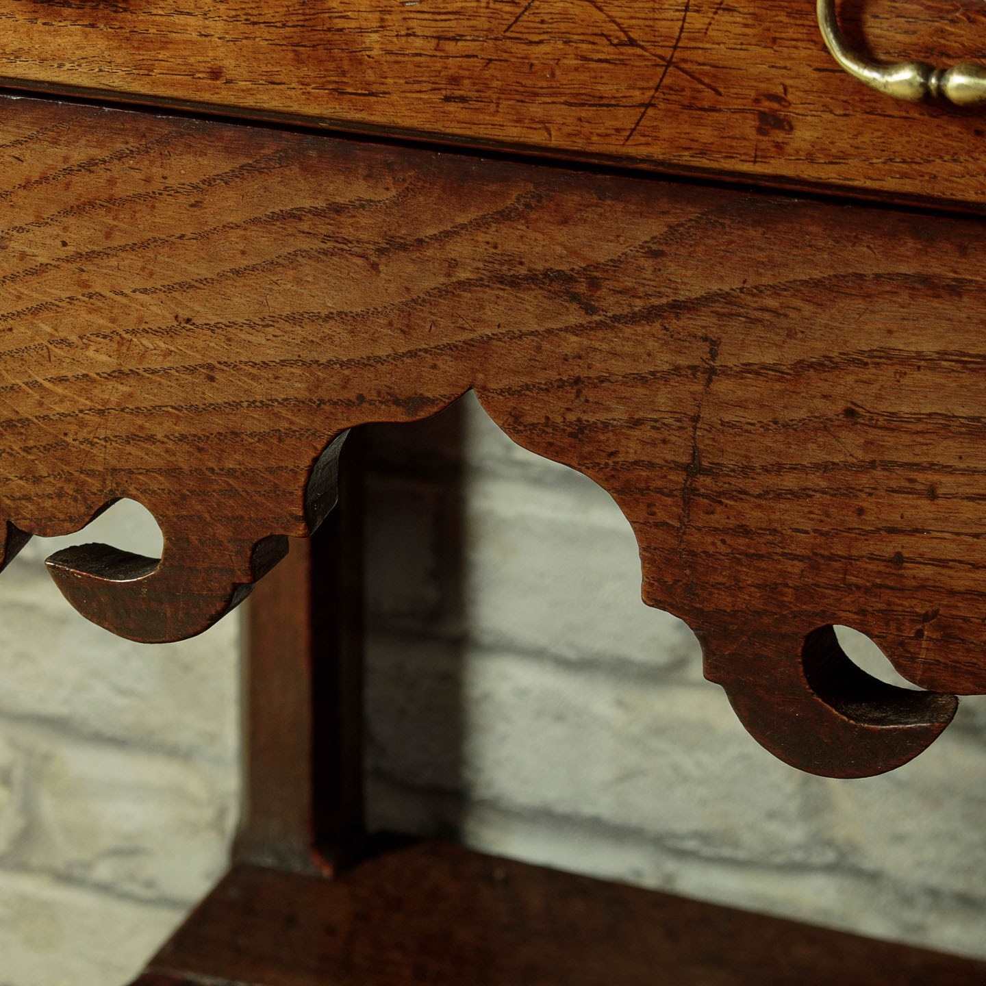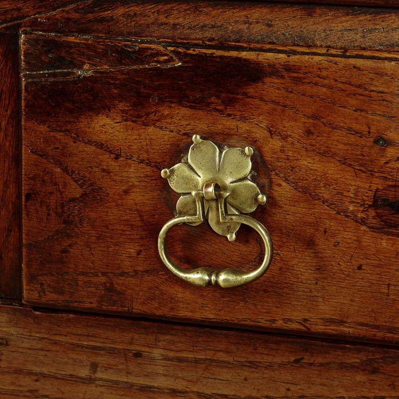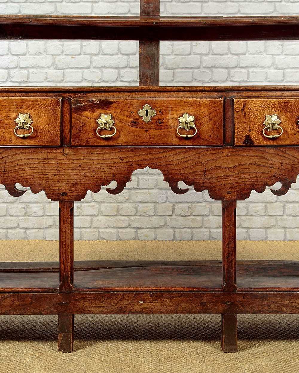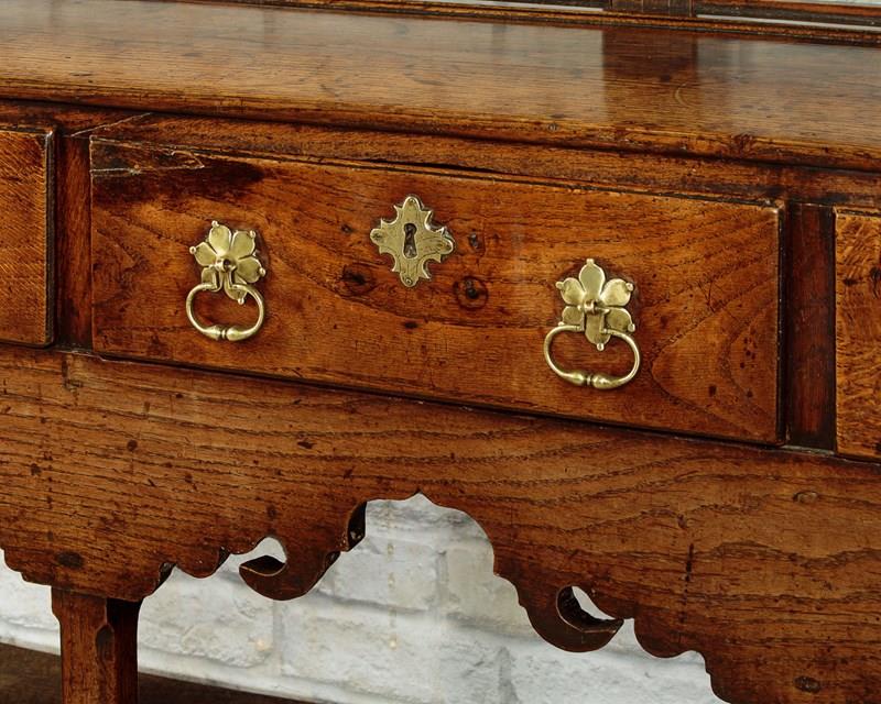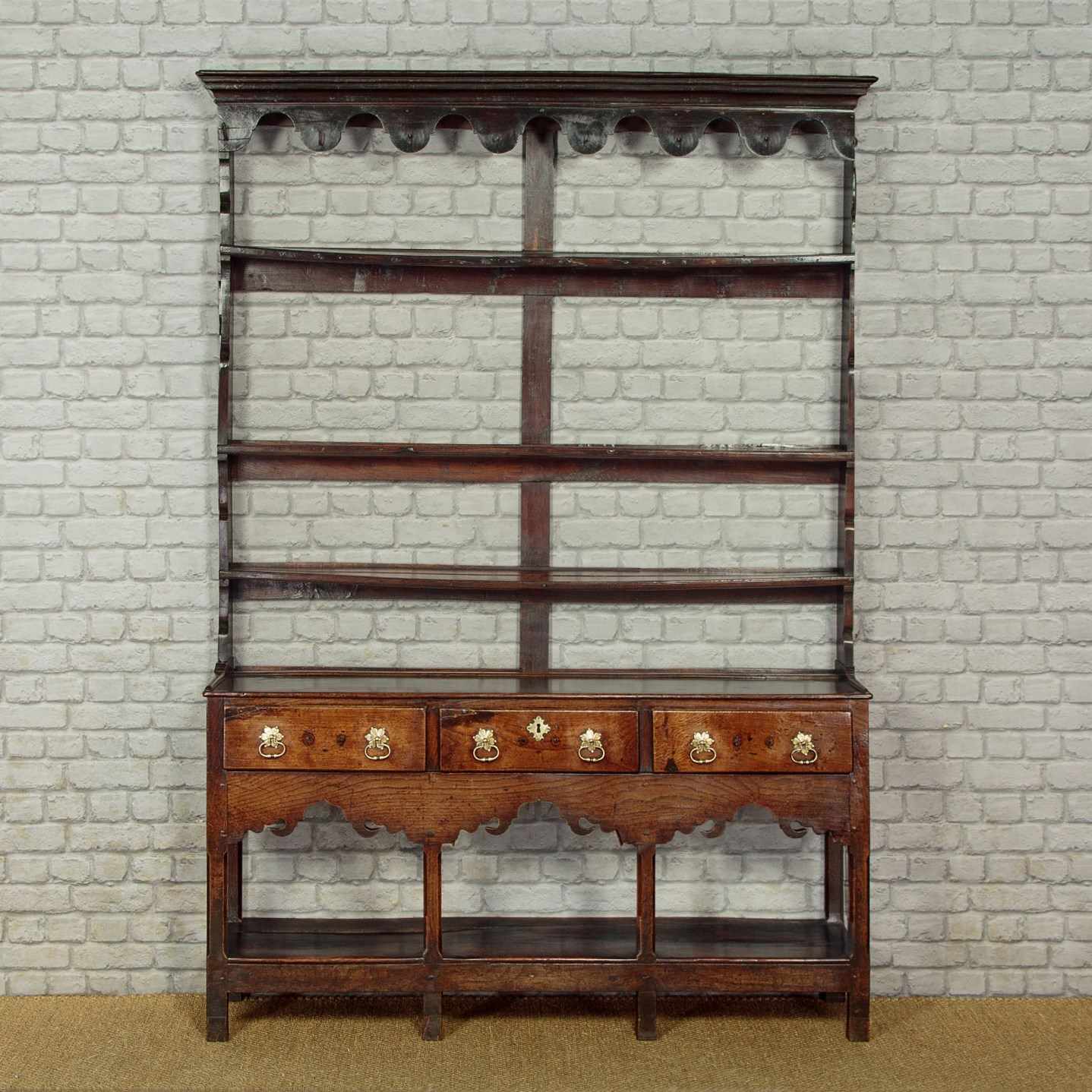 Delightful little Welsh dresser with open rack and potboard, mid Wales c.1800. Open back plate rack with a moulded cornice and attractive wavy frieze with iron cup hooks over three shelves, each with a groove and support for displaying plates etc. Note the shaped detail to the sides. Over a low base (28") with three drawers. Single plank top with a raised moulding along the back edge to hold plates and long 'shoes' at the sides. Moulded edge to the drawer fronts with later brass handles and ash drawer linings. Particularly attractive elaborately shaped apron below the drawers. Raised on chamfered square legs front and rear joined with an open potboard display shelf with the original oak boards. Very good condition with some earlier repairs and restorations. Superb colour and patina. Cleaned and waxed in our workshops.