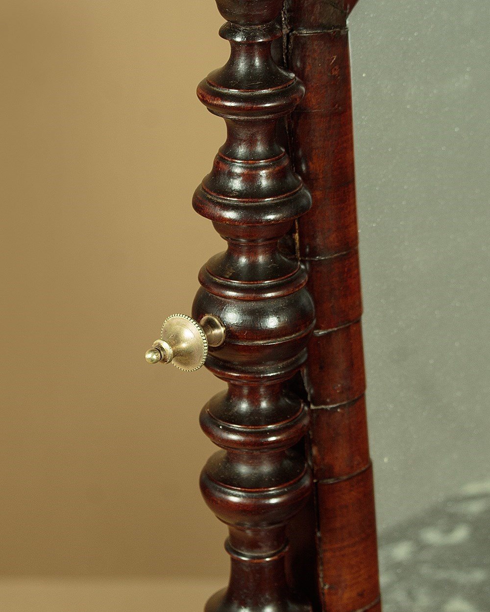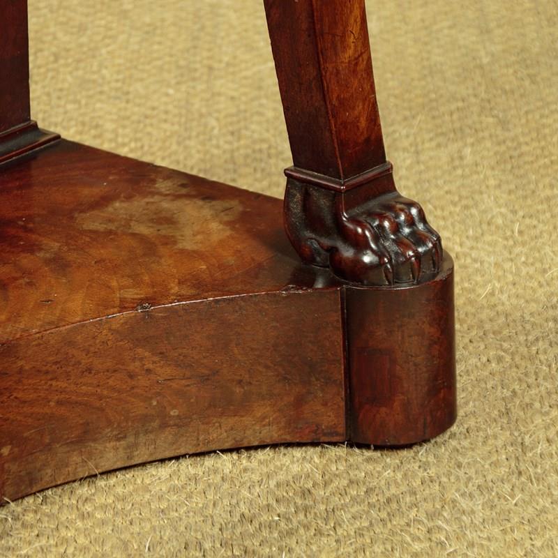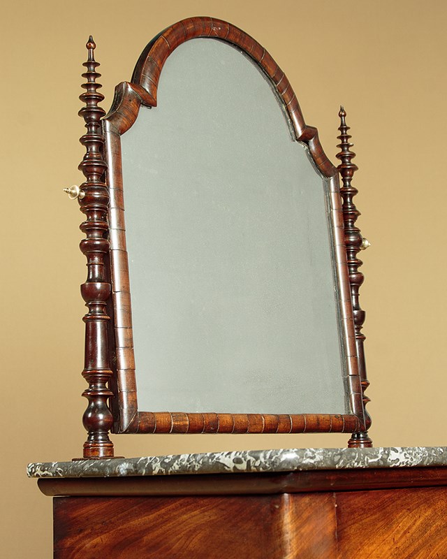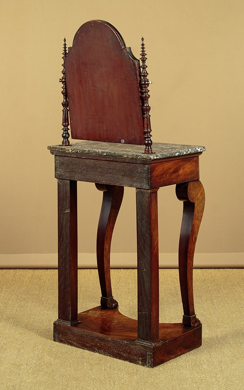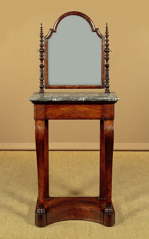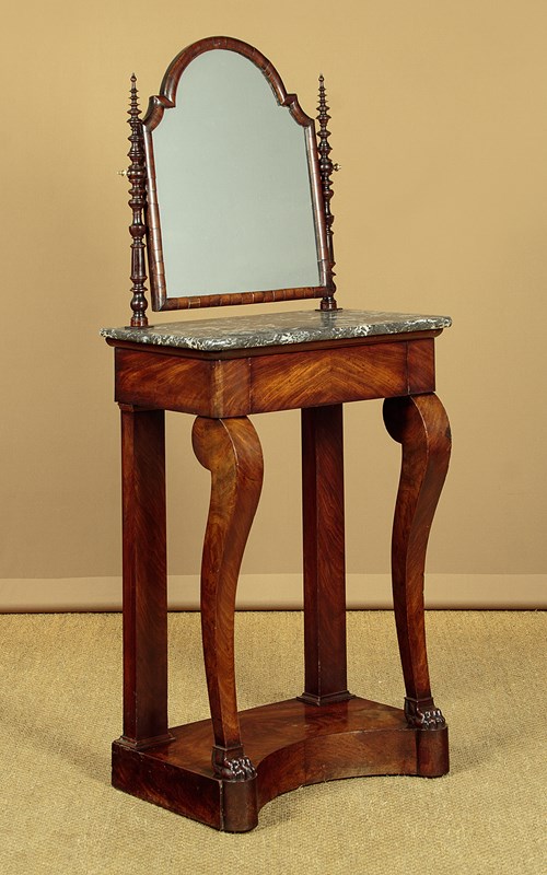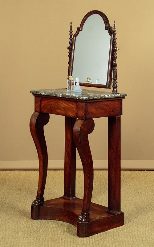 Unusual little early 19th.c. French mahogany dressing table c.1830. Useful slim dimensions, just 22½" wide. Original 14½" x 19" mirror plate within an ogee shaped frame in crossbanded mahogany. Angle adjustable on fine bobbin turned columns with pointed finials and threaded brass fittings. Well figured grey marble table top over a single drawer. Flame mahogany veneered base with tapering cabriole front legs with carved claw feet. Raised on a plinth veneered to match and with a concave front edge. Some wear and repair to the veneers and the mirror is a little clouded (could be replaced if preferred). Generally very good condition, cleaned and waxed in our workshops.