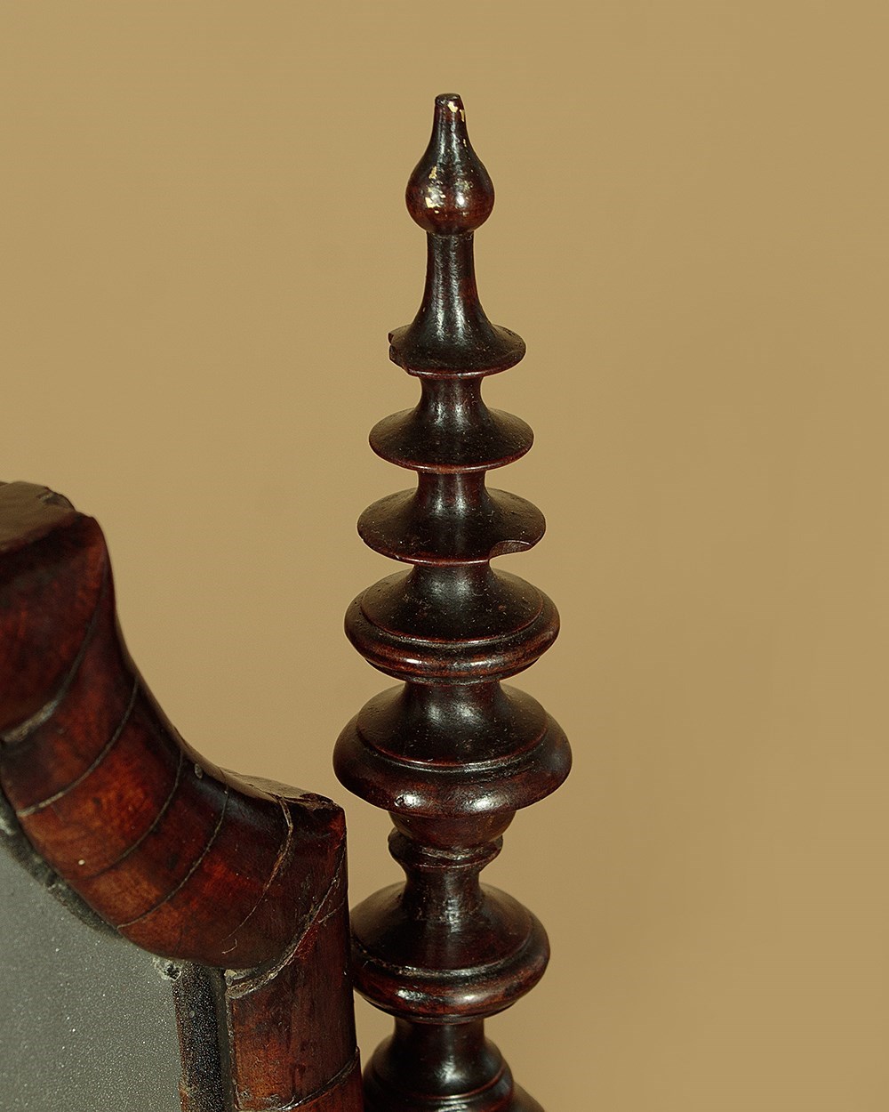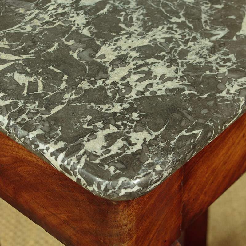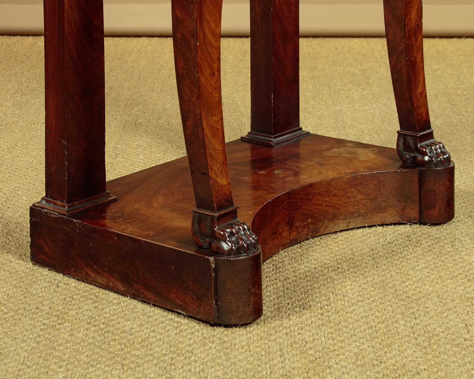 Unusual little early 19th.c. French mahogany dressing table c.1830. Useful slim dimensions, just 22½" wide. Original 14½" x 19" mirror plate within an ogee shaped frame in crossbanded mahogany. Angle adjustable on fine bobbin turned columns with pointed finials and threaded brass fittings. Well figured grey marble table top over a single drawer. Flame mahogany veneered base with tapering cabriole front legs with carved claw feet. Raised on a plinth veneered to match and with a concave front edge. Some wear and repair to the veneers and the mirror is a little clouded (could be replaced if preferred). Generally very good condition, cleaned and waxed in our workshops.