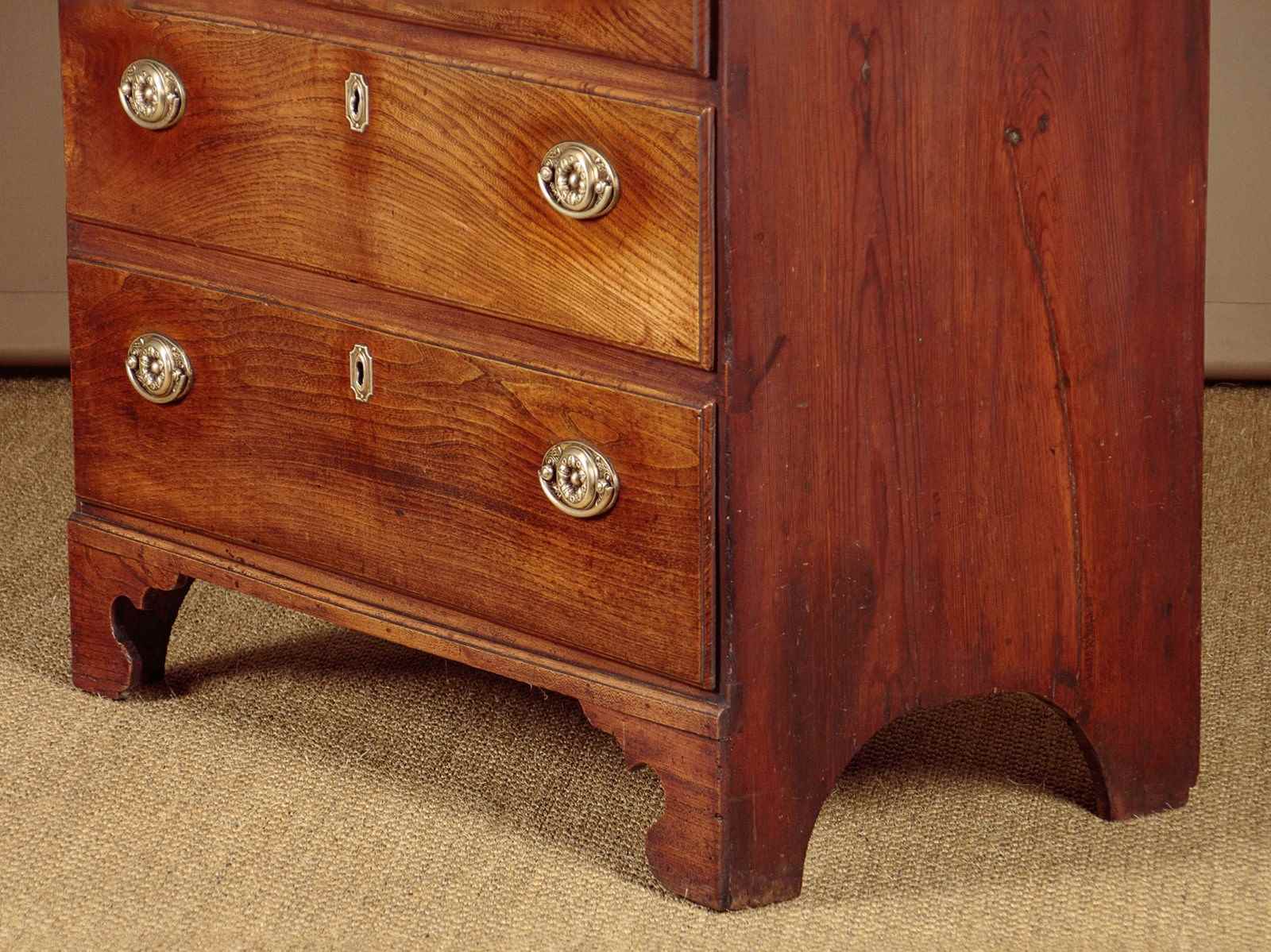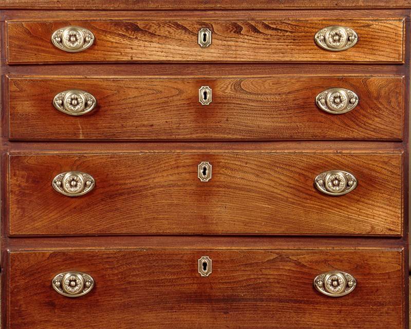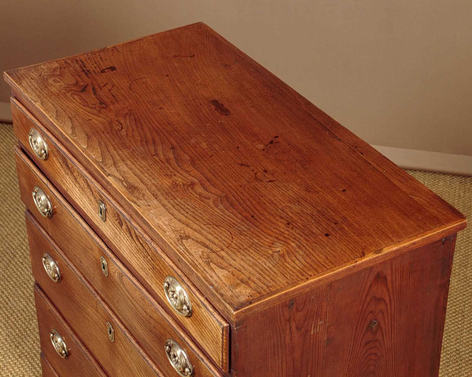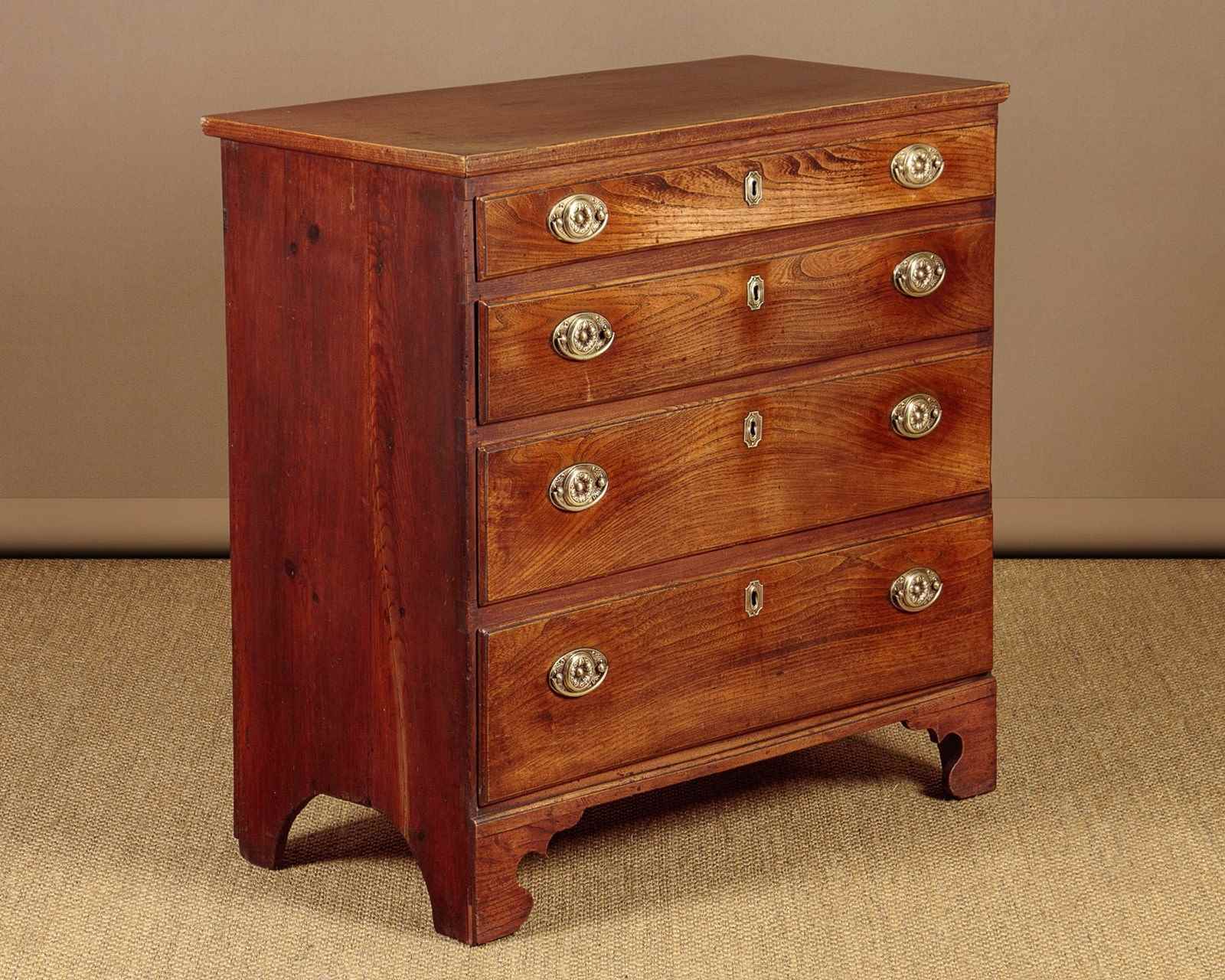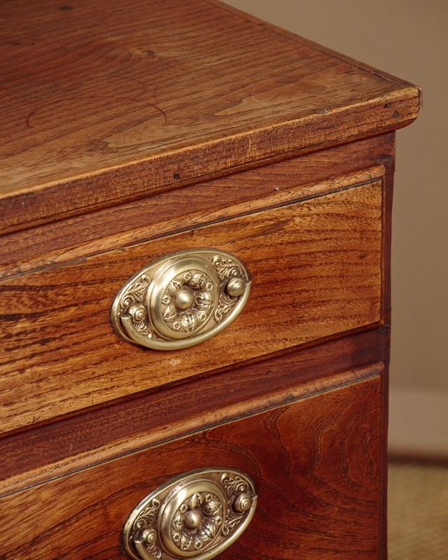 Small George III chest of drawers in elm c.1820. A charming piece of Georgian country furniture and useful small size, just 37" wide. Elm top with an applied edge over four drawers of graduated height. Solid elm drawer fronts of particularly attractive grain with moulded edges and period brass handles and escutcheons. Raised on shaped bracket feet at the front. Single piece pine sides with a shaped detail at the bottom to form the feet. Some old wear, generally very good condition and lovely honey coloured timber. Cleaned and waxed in our workshops.
