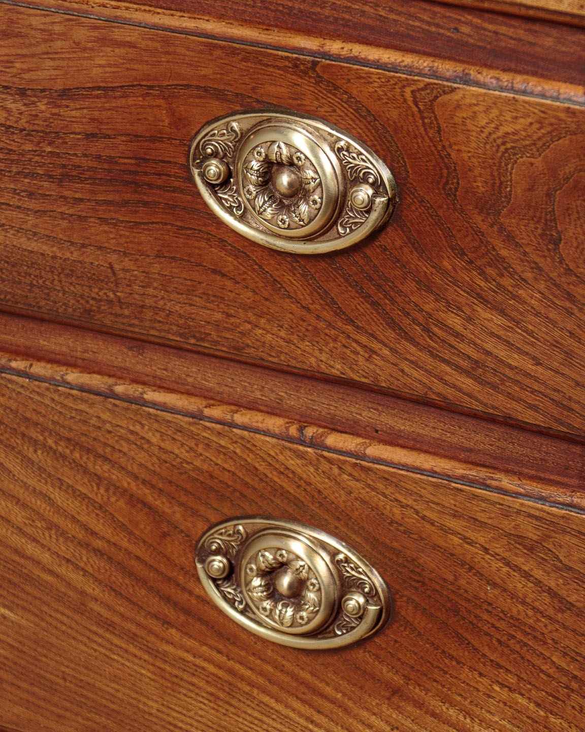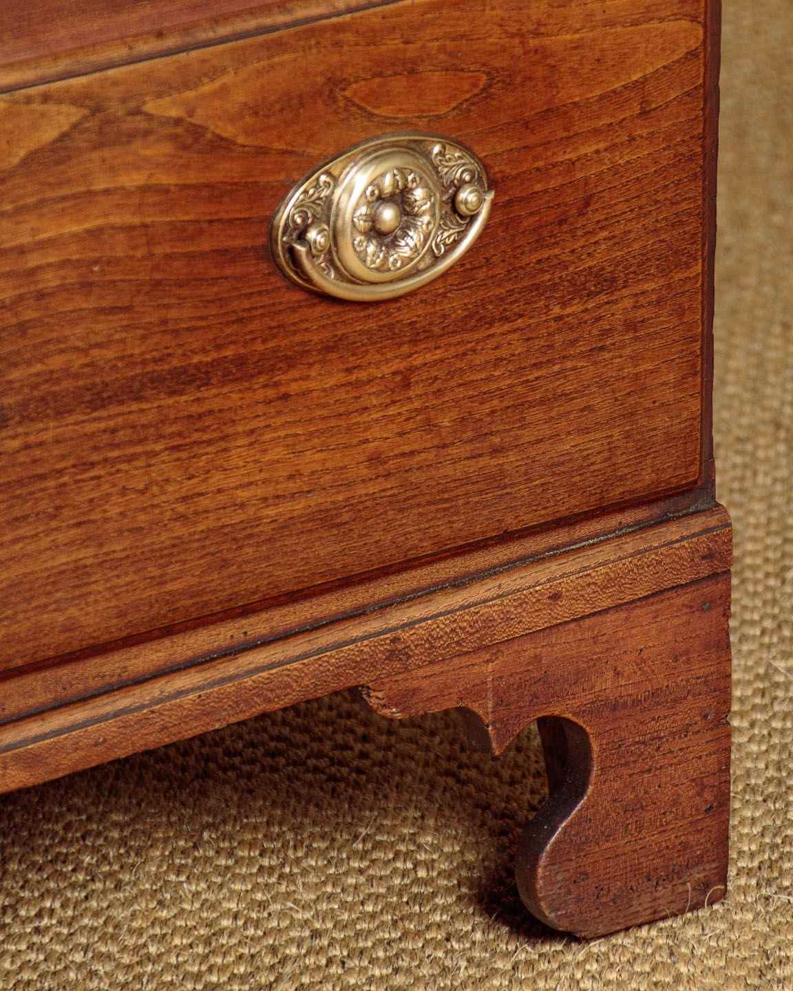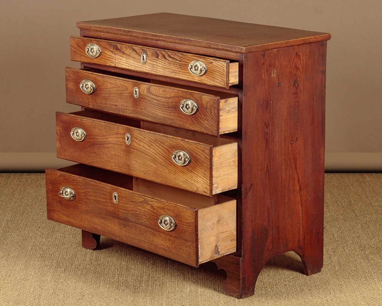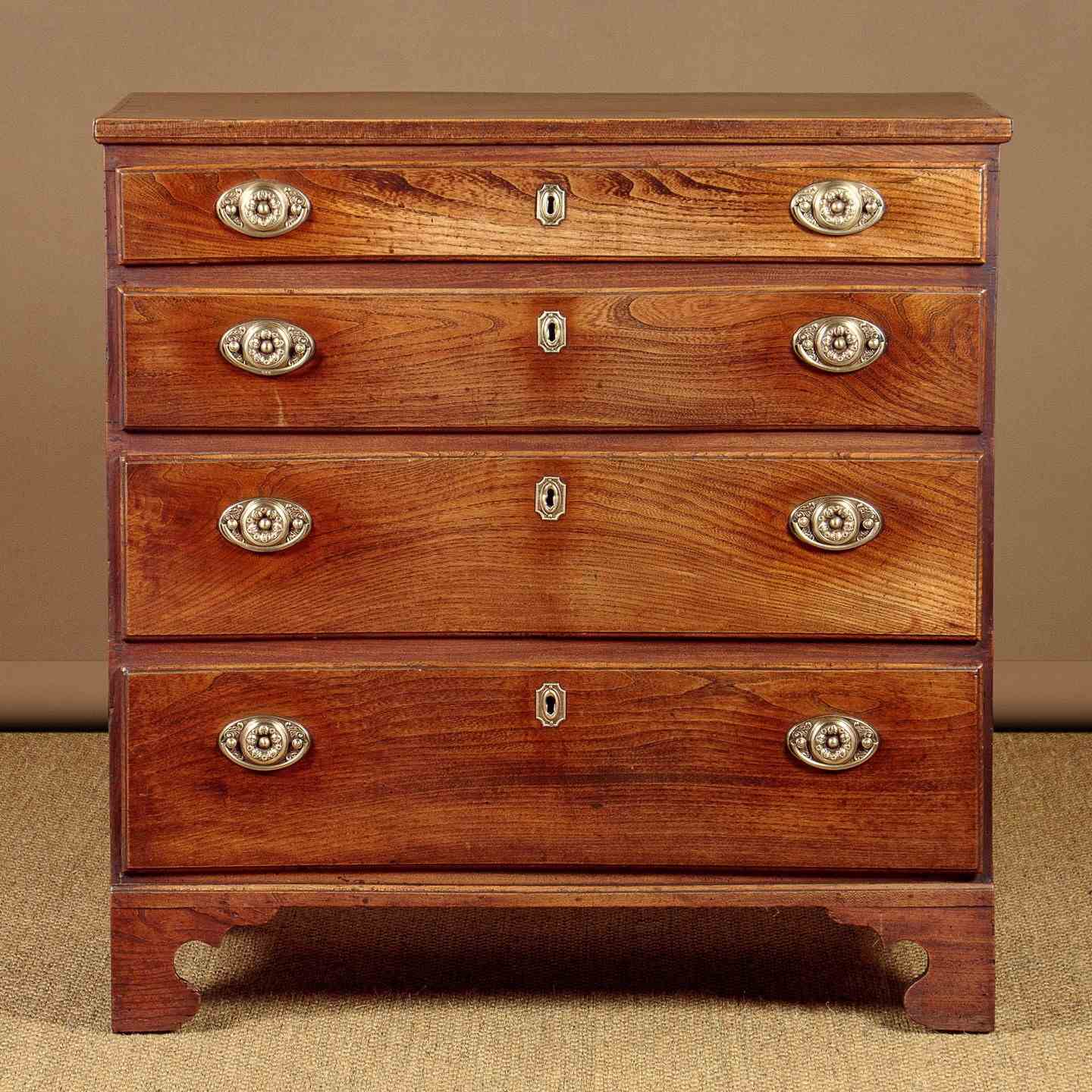 Small George III chest of drawers in elm c.1820. A charming piece of Georgian country furniture and useful small size, just 37" wide. Elm top with an applied edge over four drawers of graduated height. Solid elm drawer fronts of particularly attractive grain with moulded edges and period brass handles and escutcheons. Raised on shaped bracket feet at the front. Single piece pine sides with a shaped detail at the bottom to form the feet. Some old wear, generally very good condition and lovely honey coloured timber. Cleaned and waxed in our workshops.