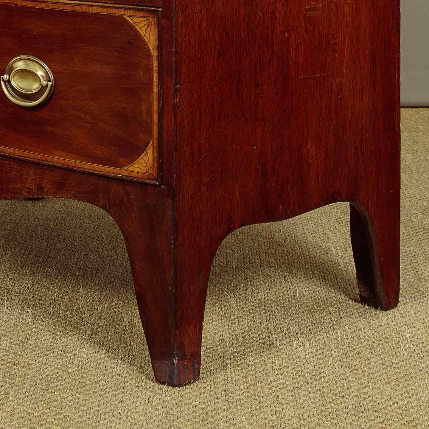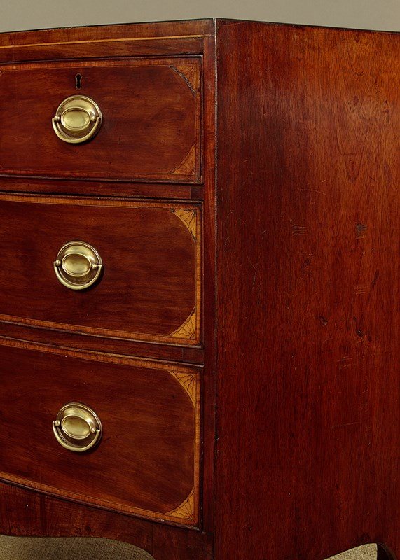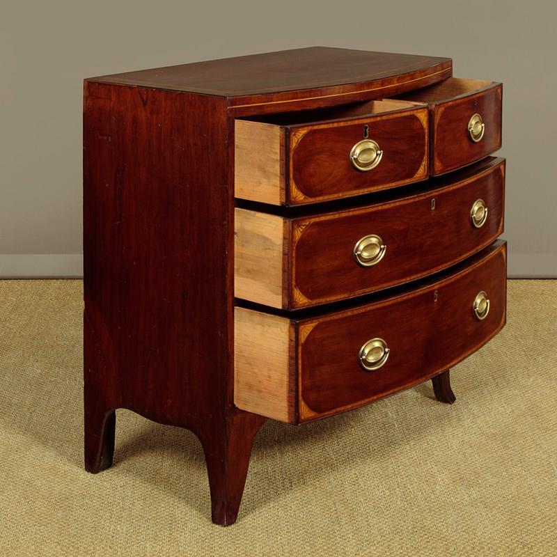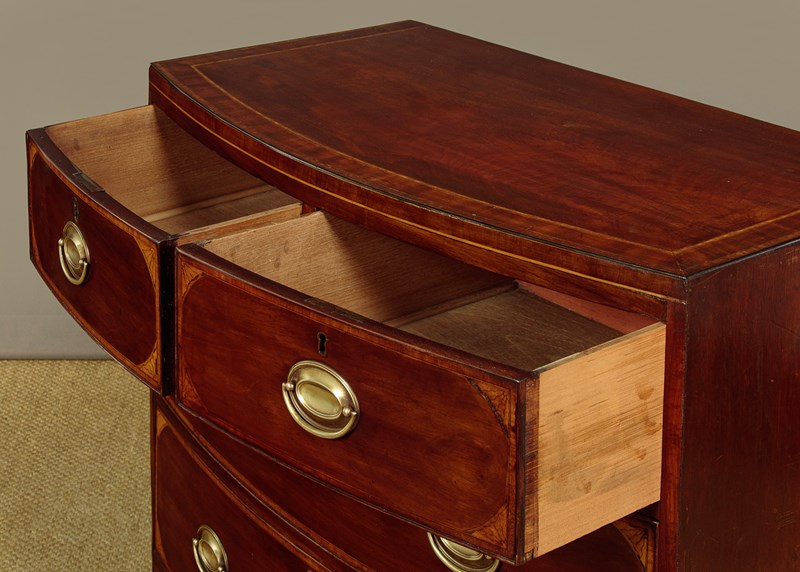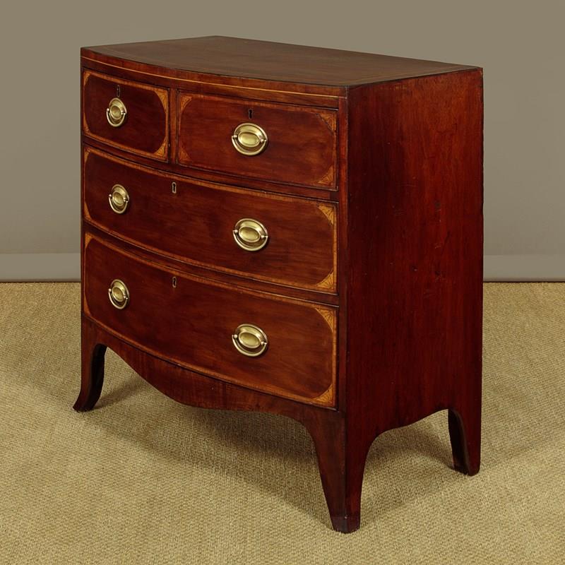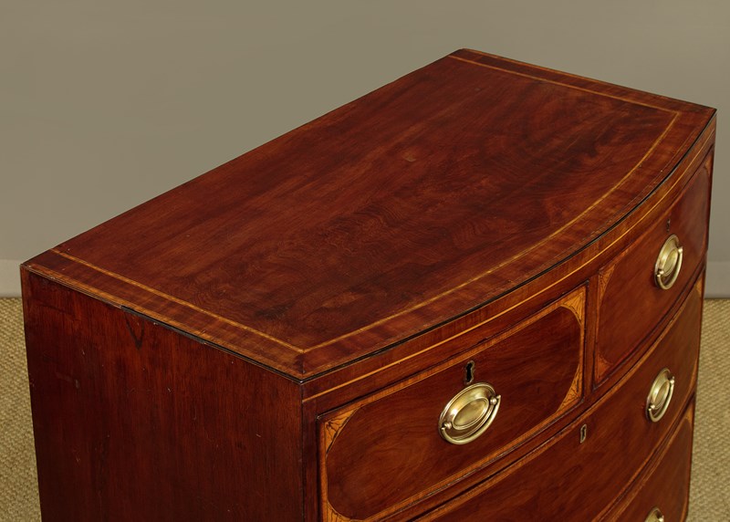 Charming little George III bow front mahogany chest of drawers c.1810. Useful small size, just 36" wide at the feet. Caddy top (with no overhang or applied mouldings) in well figured flame mahogany with inlaid bands of satinwood and mahogany crossbanding and ebony inlaid stringing to the edge. Over two short and two long drawers of graduated height. Cockbeaded drawer fronts with inlaid crossbanding and lovely inlaid marquetry spandrels at the corners. The brass handles are later though of the right style for the period. Shaped apron to the front and sides with slightly out-swept front feet. Solid mahogany sides and drawer linings. Very good colour and condition, cleaned and waxed in our workshops.