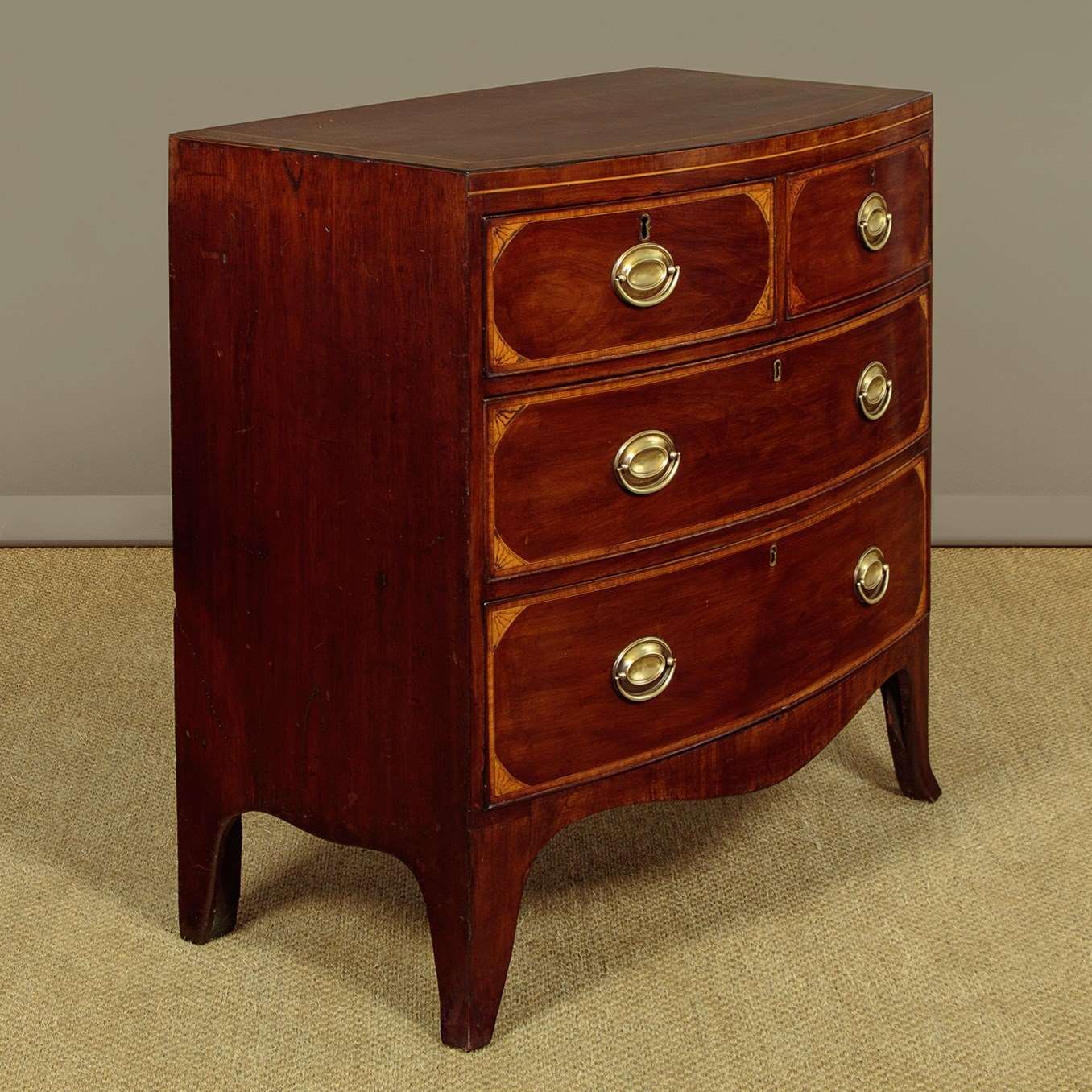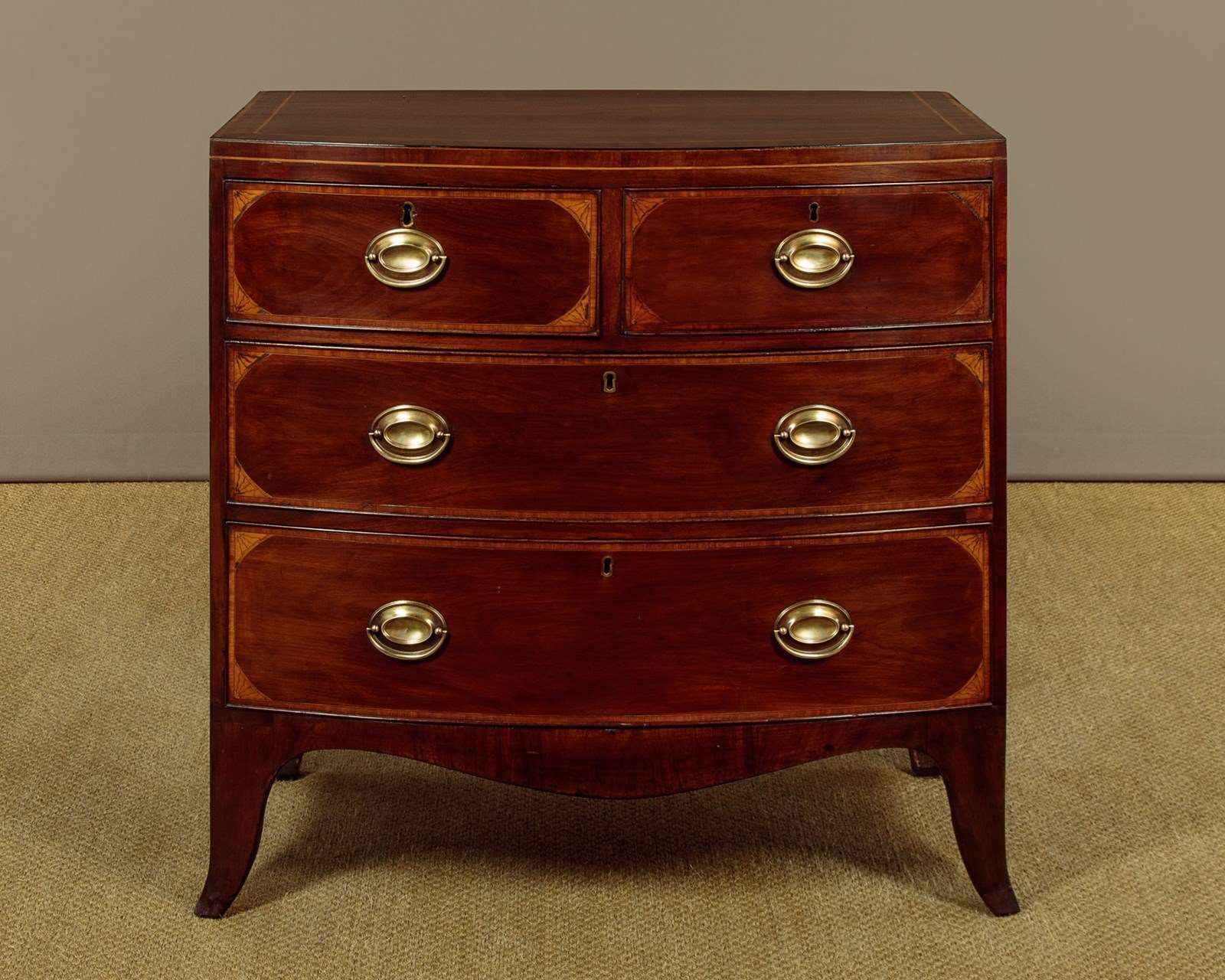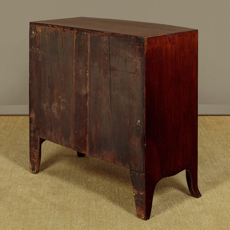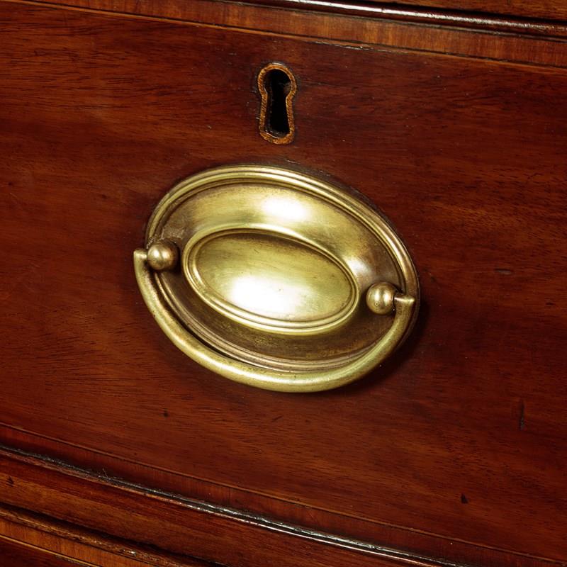 Charming little George III bow front mahogany chest of drawers c.1810. Useful small size, just 36" wide at the feet. Caddy top (with no overhang or applied mouldings) in well figured flame mahogany with inlaid bands of satinwood and mahogany crossbanding and ebony inlaid stringing to the edge. Over two short and two long drawers of graduated height. Cockbeaded drawer fronts with inlaid crossbanding and lovely inlaid marquetry spandrels at the corners. The brass handles are later though of the right style for the period. Shaped apron to the front and sides with slightly out-swept front feet. Solid mahogany sides and drawer linings. Very good colour and condition, cleaned and waxed in our workshops.