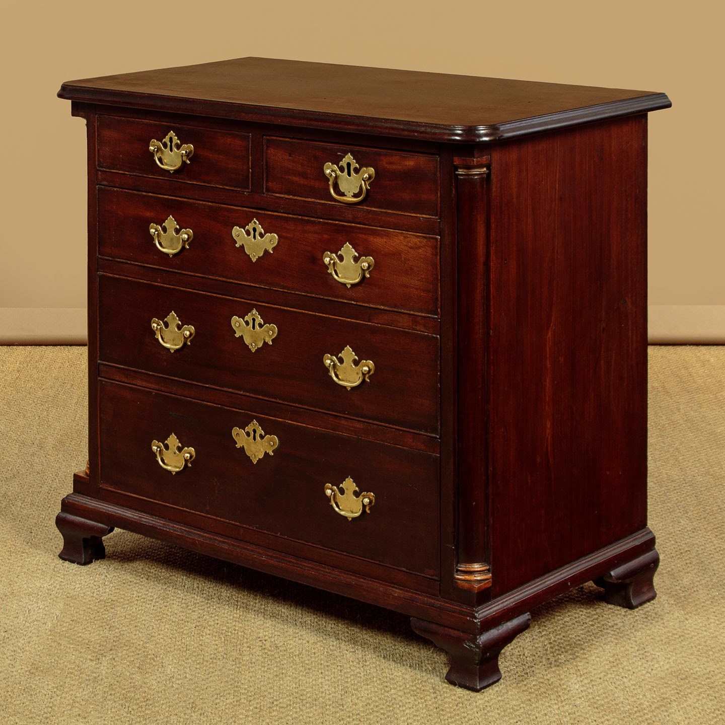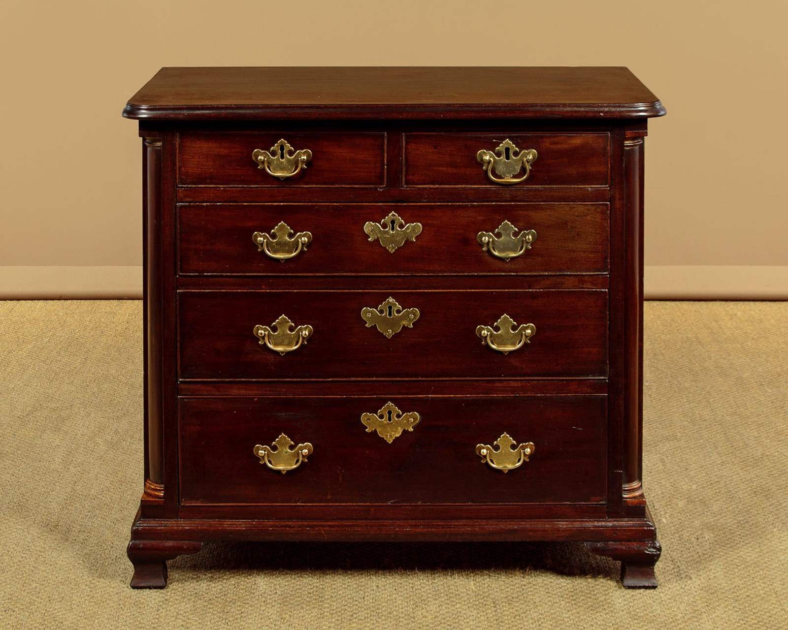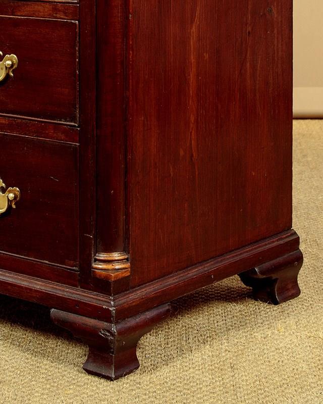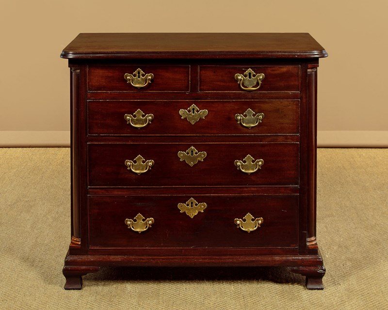 Small George III mahogany bachelor's chest of drawers c.1780. Just 32" wide. Single piece solid mahogany top with a moulded edge. Over two short drawers and three long drawers of graduated height. Solid mahogany drawer fronts with cockbeaded edges and the original brass handles (one replacement grip and pommels) and lockplates. Flanked with turned quarter columns with contrasting wooden capitals and bases. Ogee moulding around the base and raised on short shaped bracket feet. Solid mahogany sides and oak drawer linings. Excellent colour and condition, restored cleaned and waxed in our workshops.