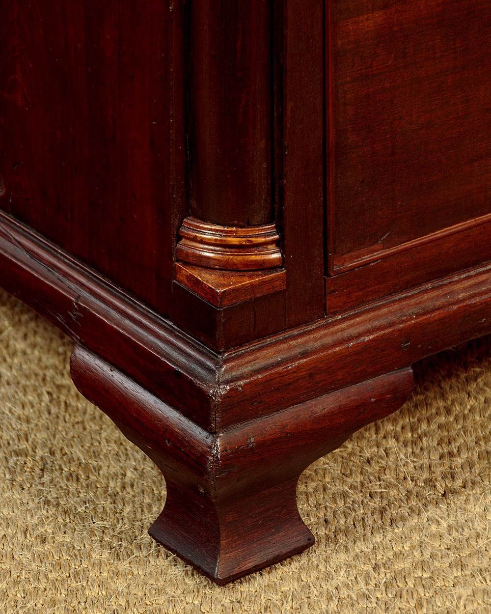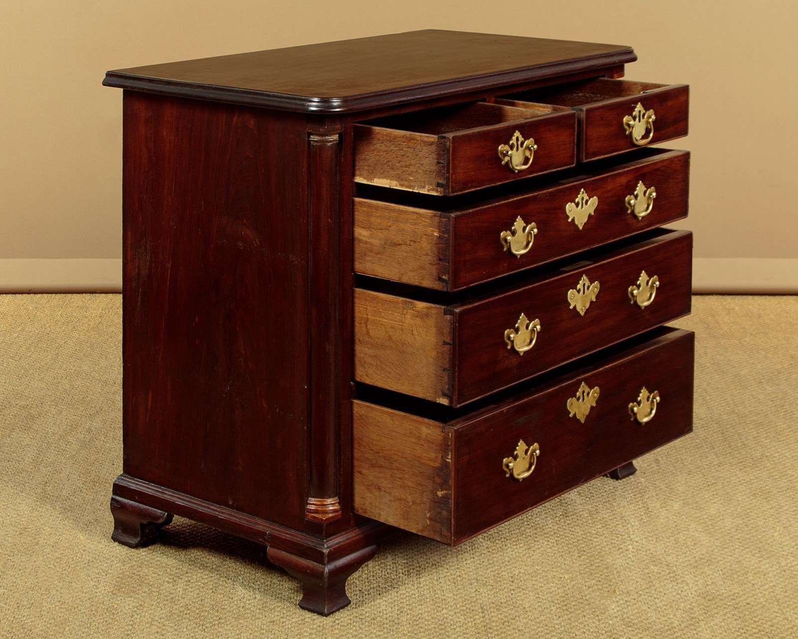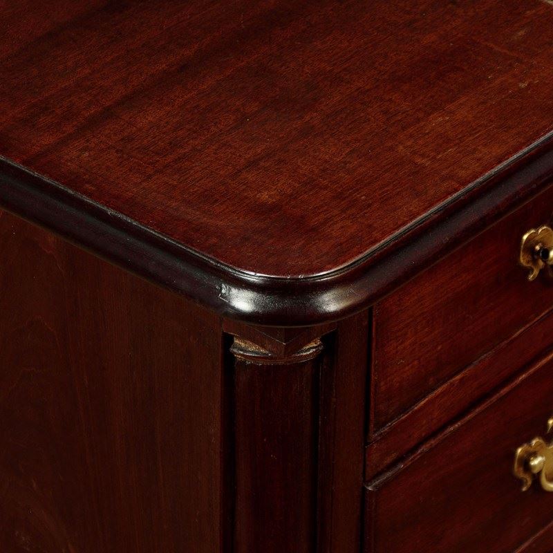 Small George III mahogany bachelor's chest of drawers c.1780. Just 32" wide. Single piece solid mahogany top with a moulded edge. Over two short drawers and three long drawers of graduated height. Solid mahogany drawer fronts with cockbeaded edges and the original brass handles (one replacement grip and pommels) and lockplates. Flanked with turned quarter columns with contrasting wooden capitals and bases. Ogee moulding around the base and raised on short shaped bracket feet. Solid mahogany sides and oak drawer linings. Excellent colour and condition, restored cleaned and waxed in our workshops.