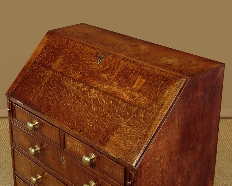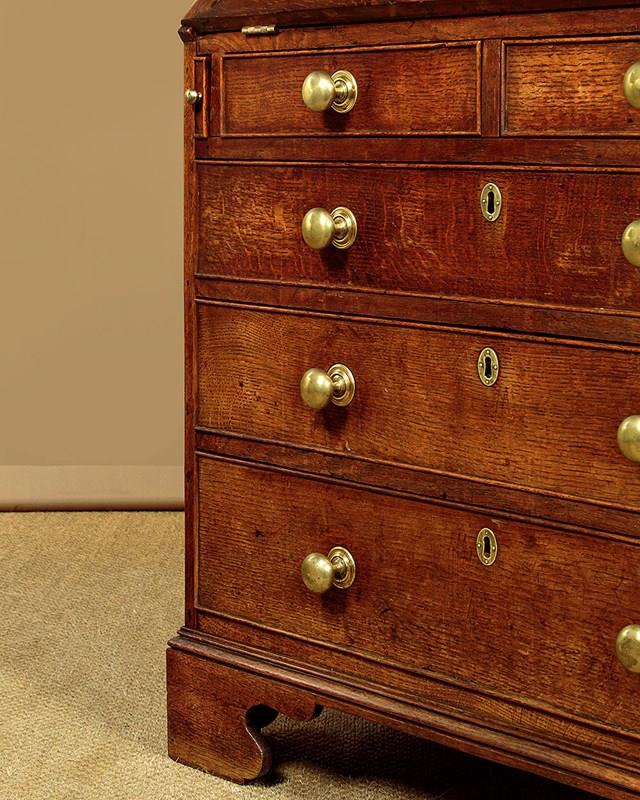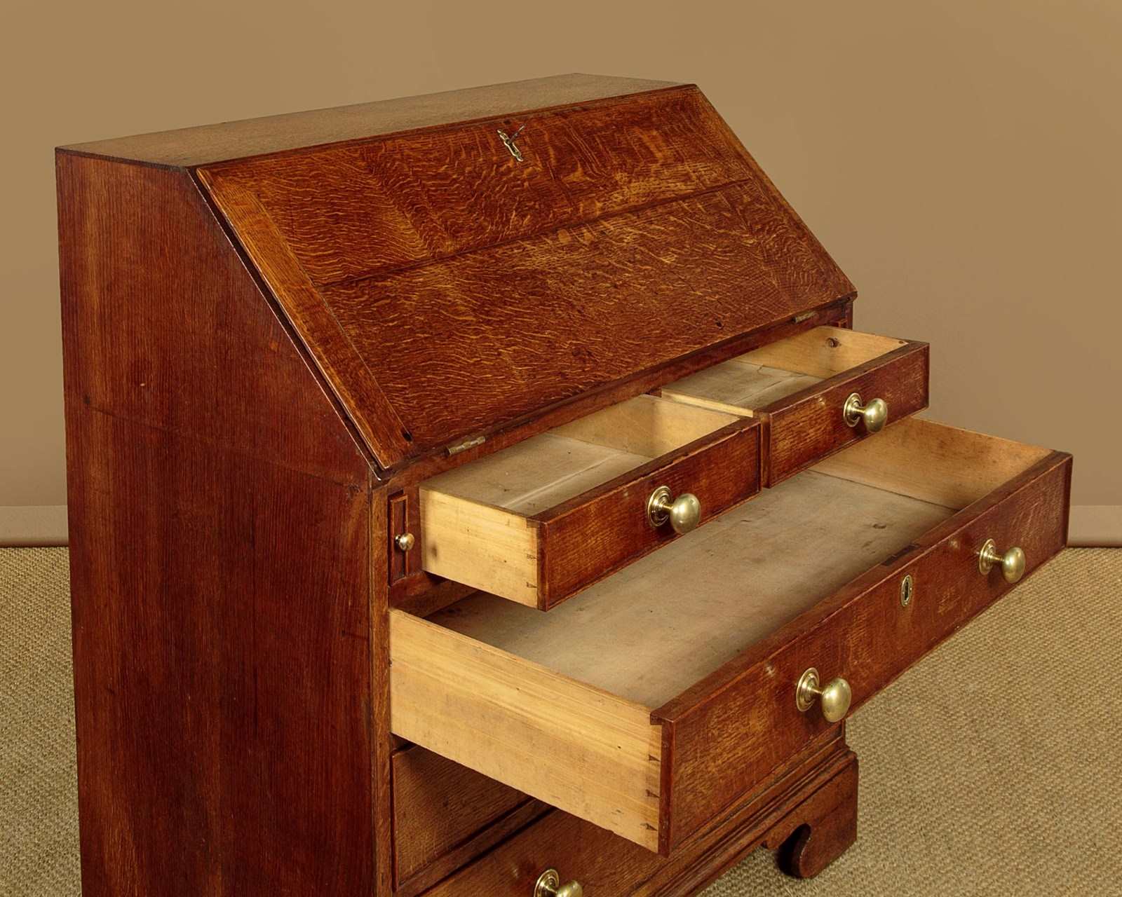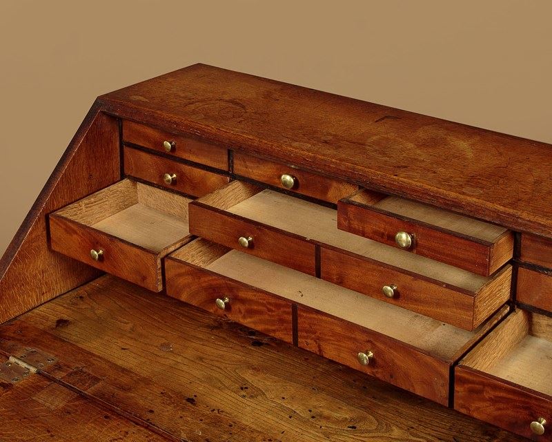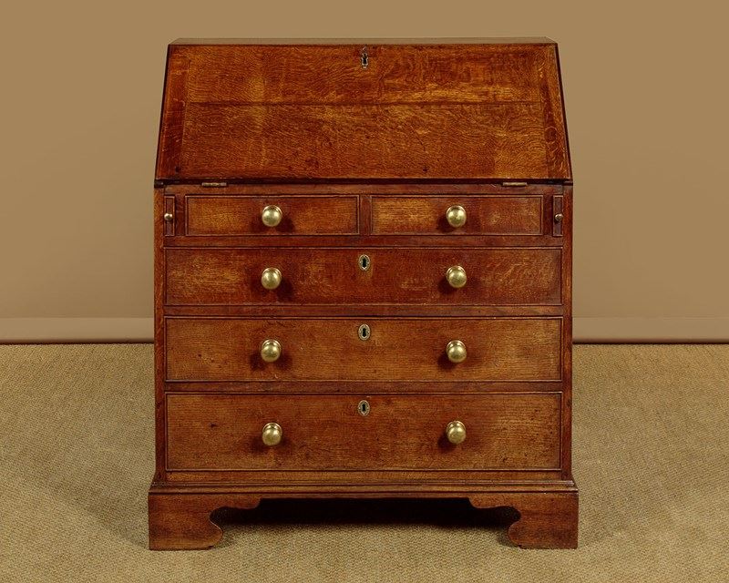 Delightful little George III country made oak bureau or writing desk c.1800. Useful small size, just 37" wide at the base. Open the fall to make a good sized work surface (height 31") with pigeon holes and ten small mahogany fronted stationery drawers above. Two short and three long drawers of graduated height below the desk. Oak drawer fronts with cockbeaded edges and large brass knobs. Moulded trim around the base and raised on shaped bracket feet at the front and sides. Solid oak sides, unusual lime wood drawer linings, note also the elm board used in the base of the bureau interior. Excellent colour and condition, restored cleaned and waxed in our workshops. Key supplied.