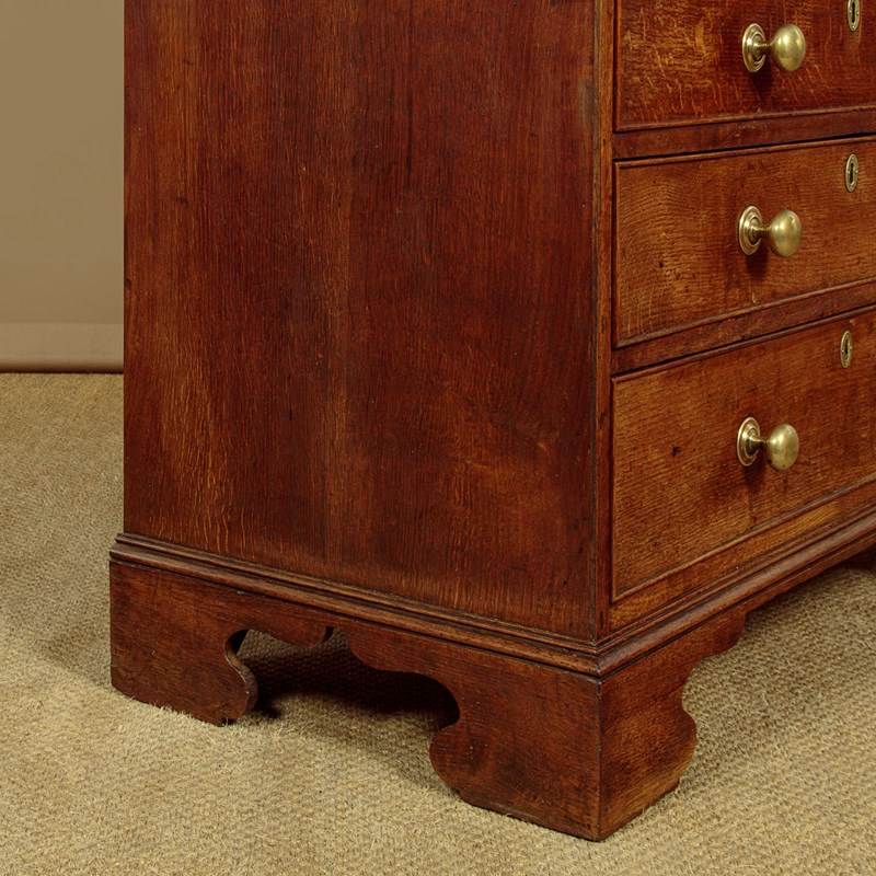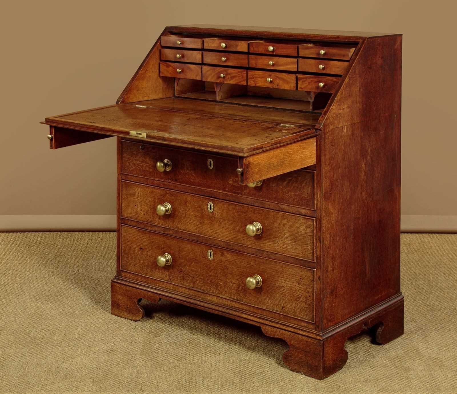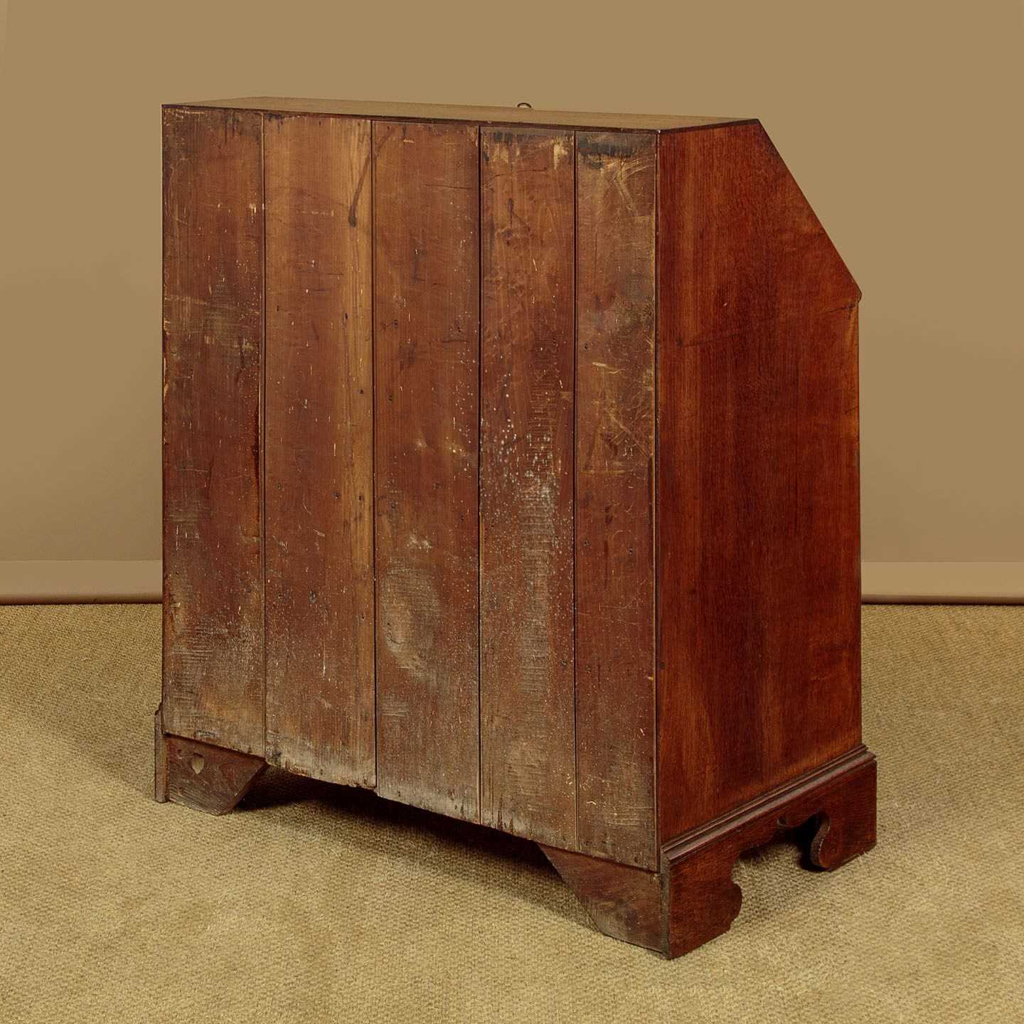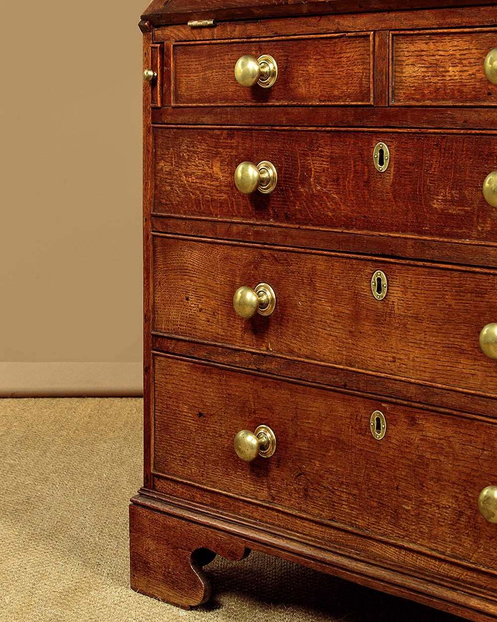 Delightful little George III country made oak bureau or writing desk c.1800. Useful small size, just 37" wide at the base. Open the fall to make a good sized work surface (height 31") with pigeon holes and ten small mahogany fronted stationery drawers above. Two short and three long drawers of graduated height below the desk. Oak drawer fronts with cockbeaded edges and large brass knobs. Moulded trim around the base and raised on shaped bracket feet at the front and sides. Solid oak sides, unusual lime wood drawer linings, note also the elm board used in the base of the bureau interior. Excellent colour and condition, restored cleaned and waxed in our workshops. Key supplied.