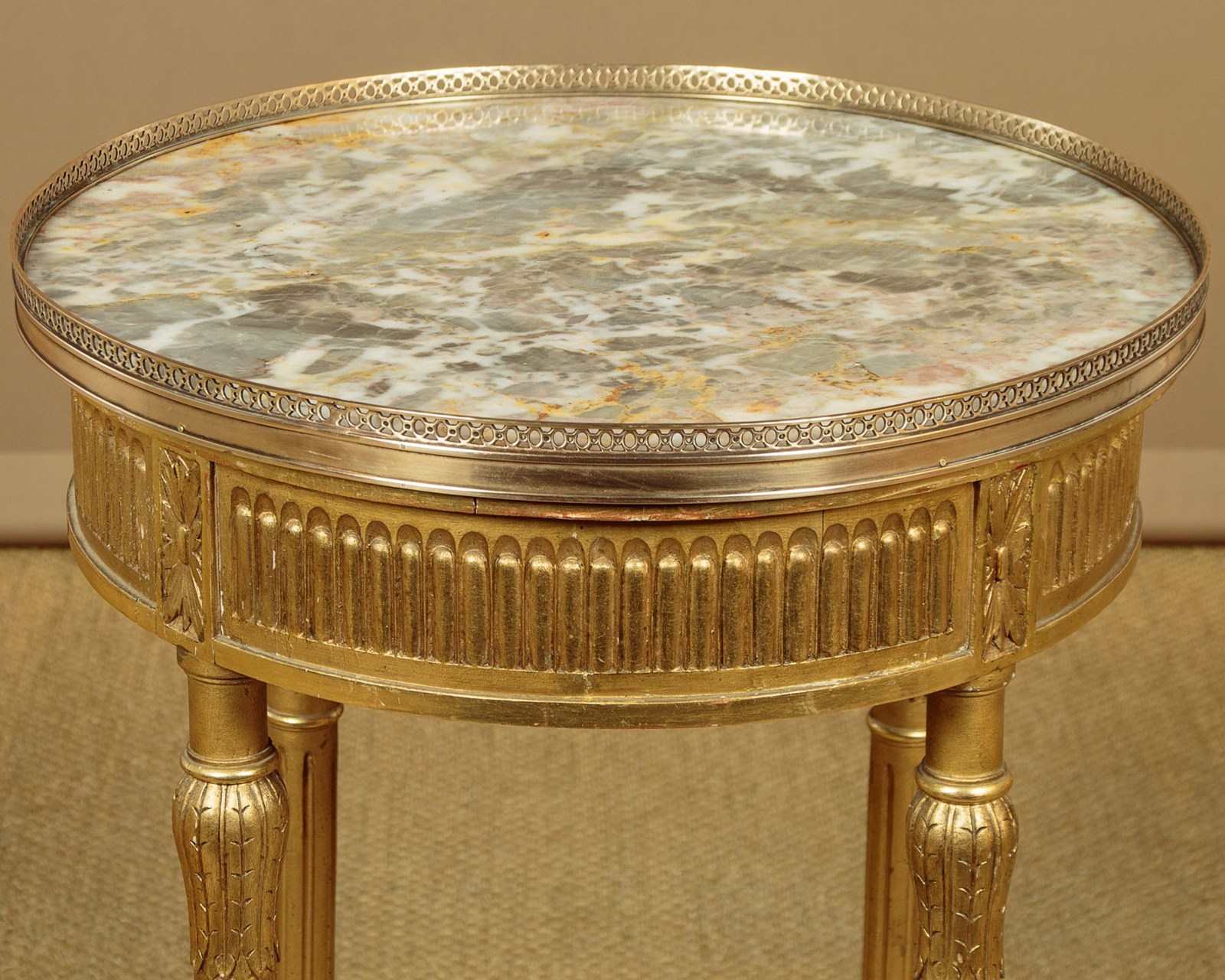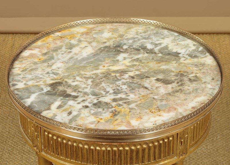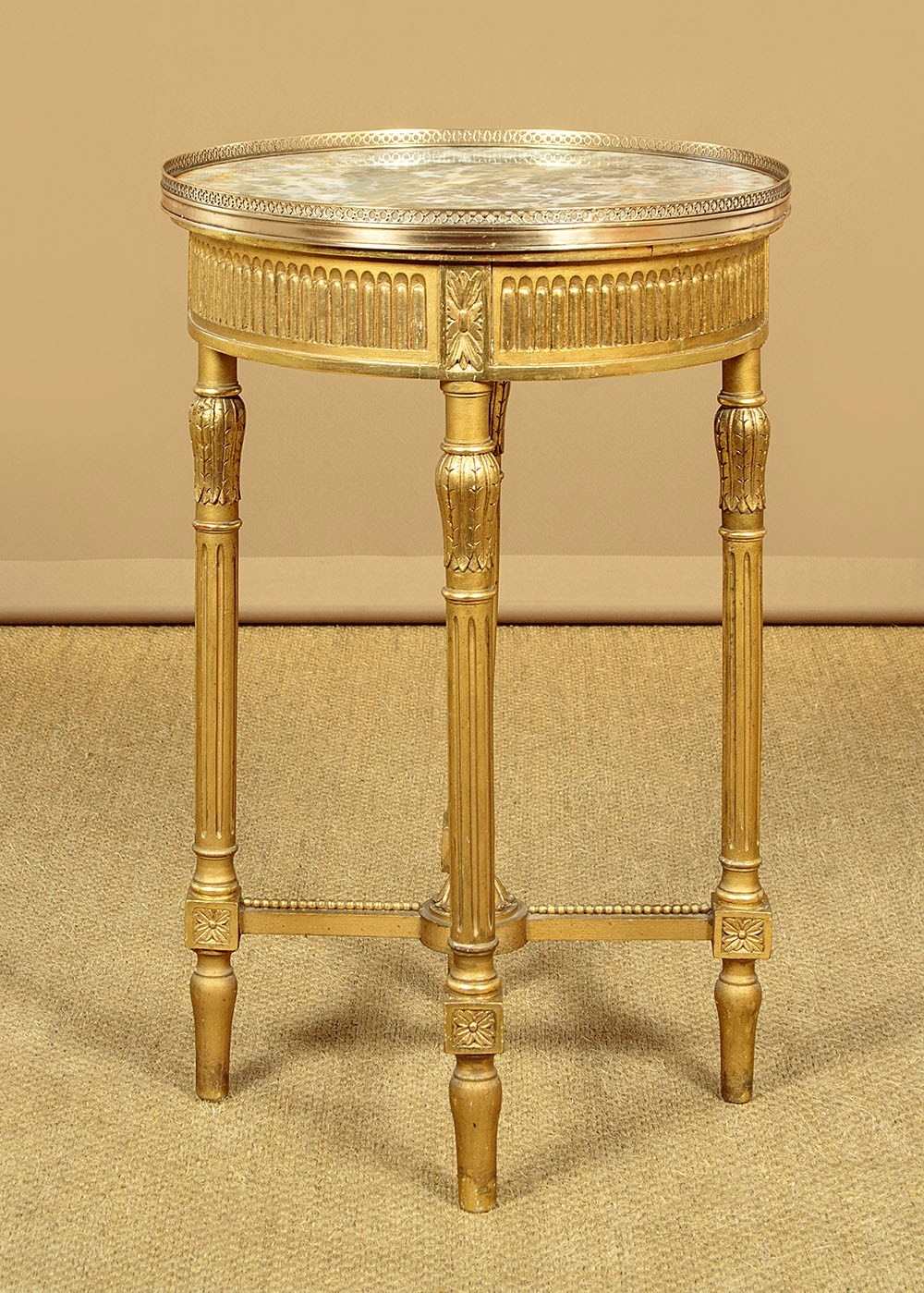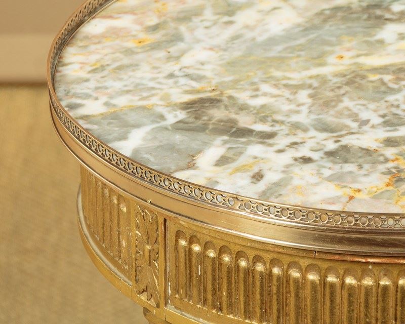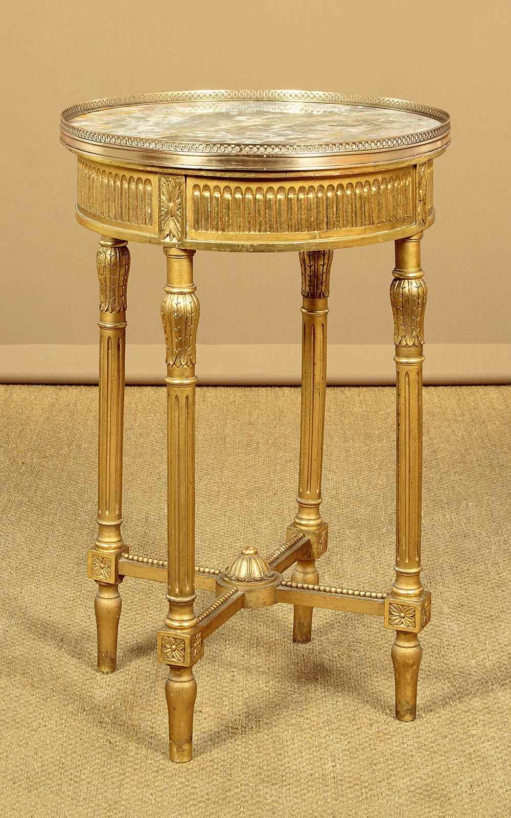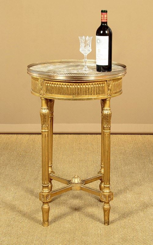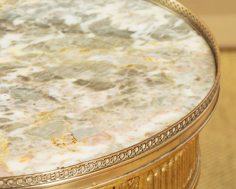 Elegant little giltwood and marble top wine table c.1930. 20" diameter marble top with a raised and pierced brass gallery around the edge. On a carved and gilded wooden base with a reeded frieze over turned and fluted legs joined with crossed stretchers. Good condition, cleaned and waxed in our workshops.