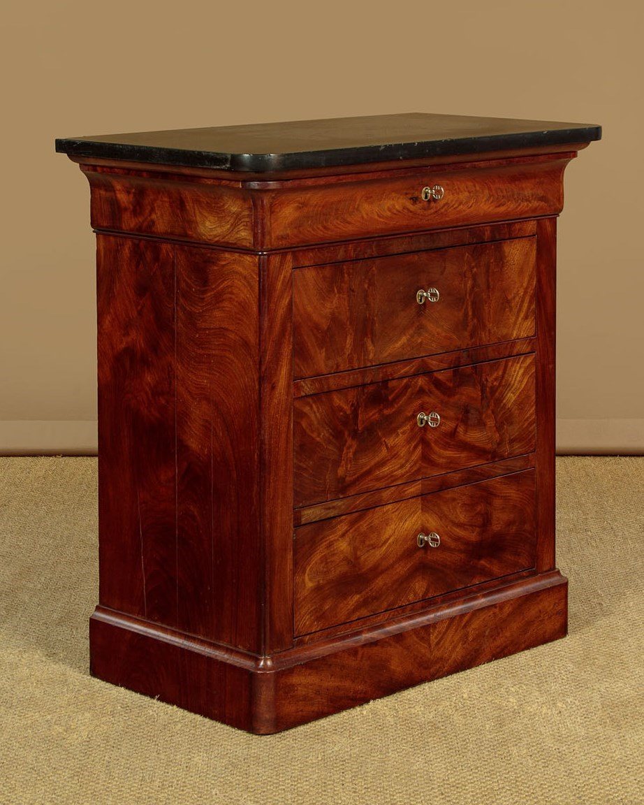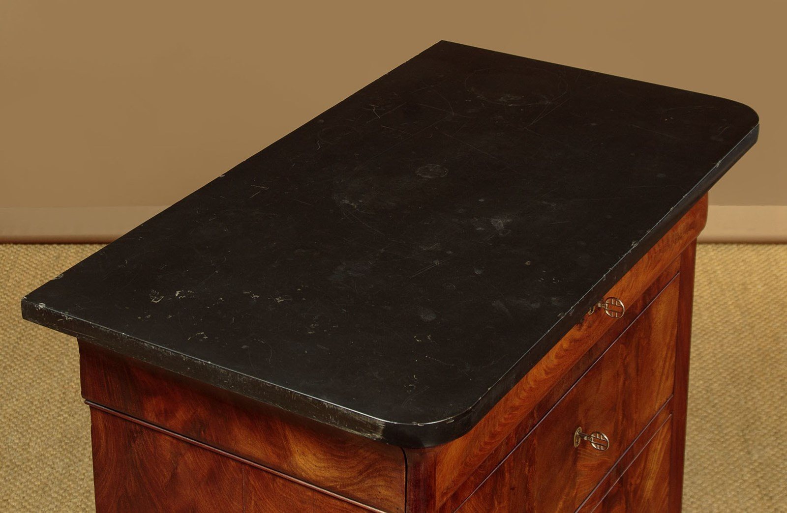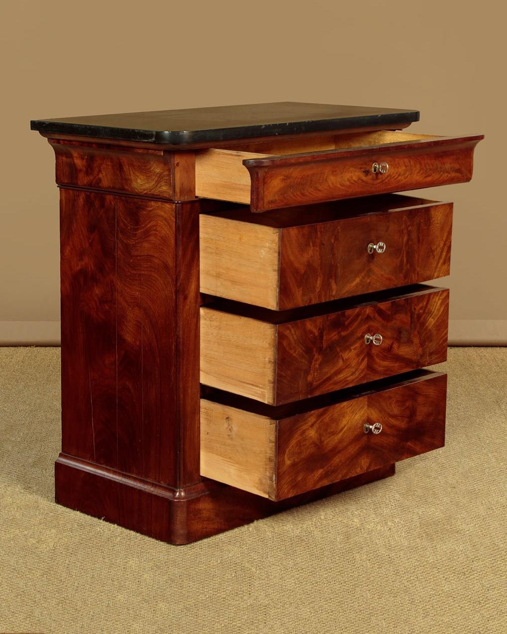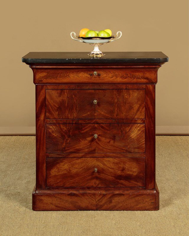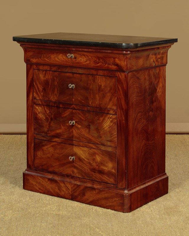 Unusually small French Louis Philippe mahogany commode or chest of drawers c.1840. Just 32½" wide. Original black slate top with rounded front corners over a chest of four drawers. Shallower top drawer with a shaped front continued on the cabinet sides. Attractively figured and symmetrically arranged flame mahogany veneers across the drawer fronts, with inlaid brass escutcheons. Mahogany veneered sides and raised on a moulded plinth. Some small chips to the edges of the marble and repairs to the veneers. Generally very good colour and condition, cleaned and waxed in our workshops. Keys supplied.