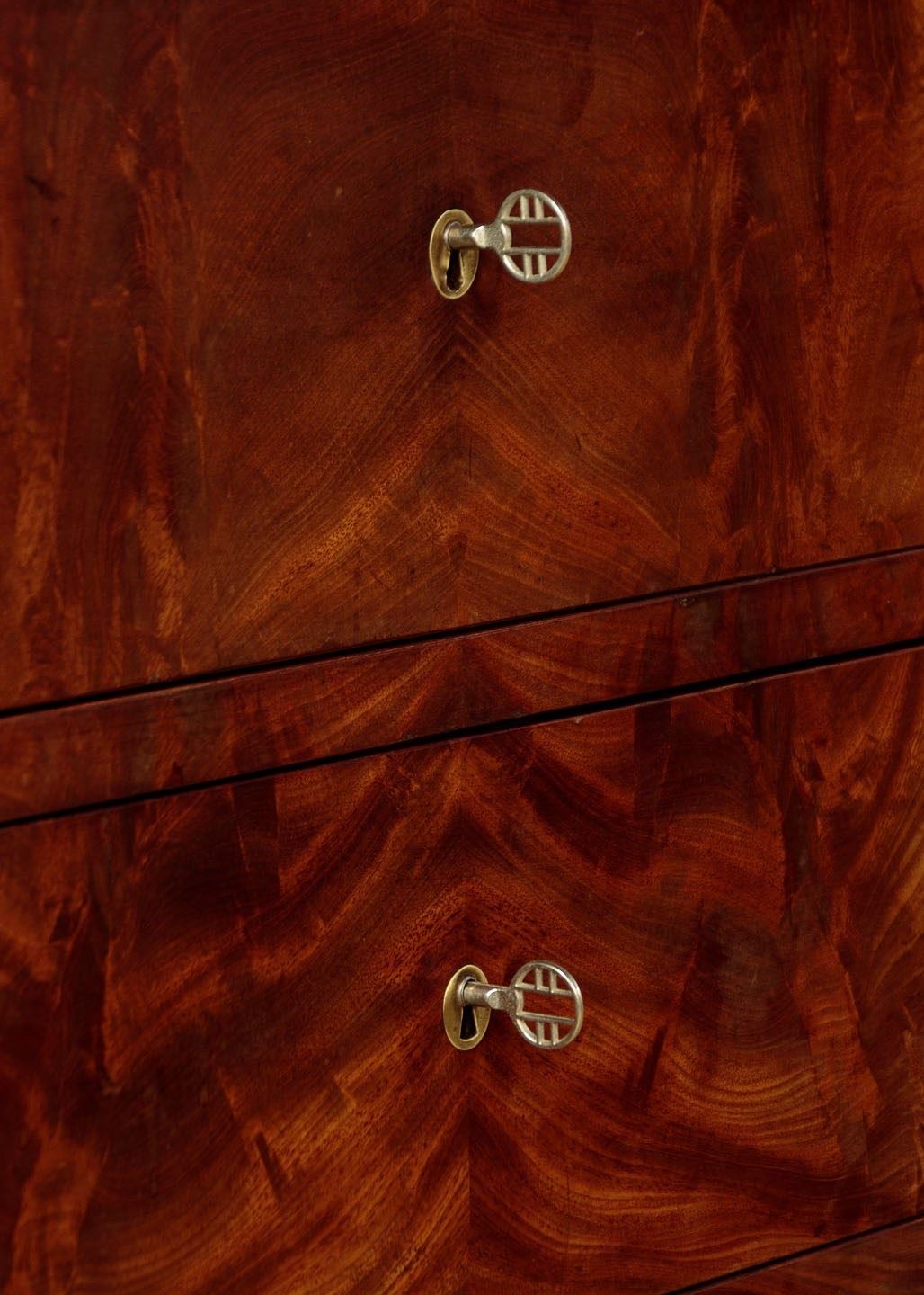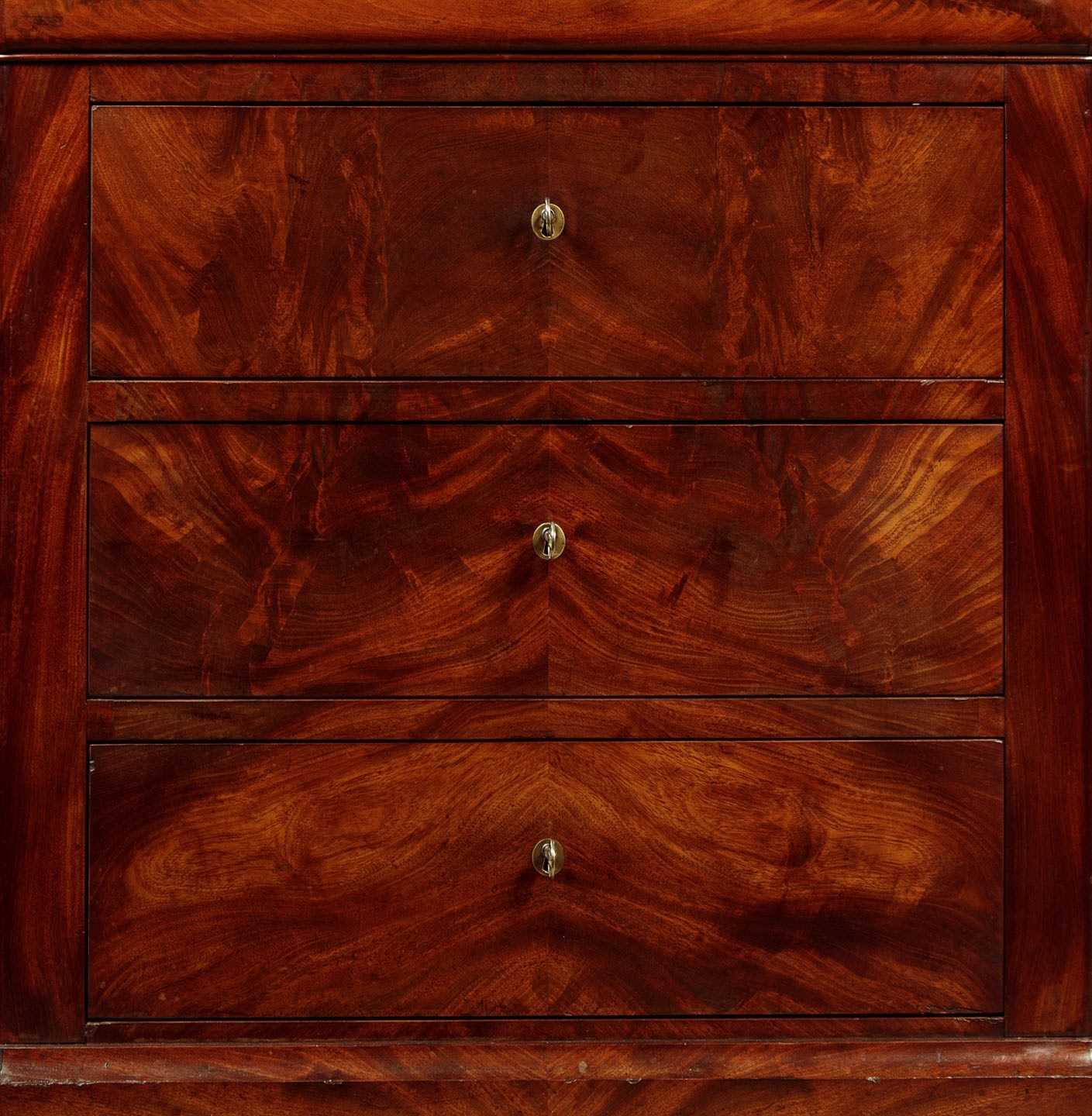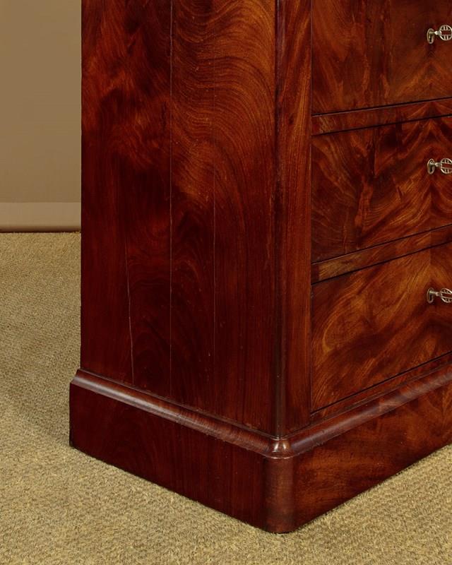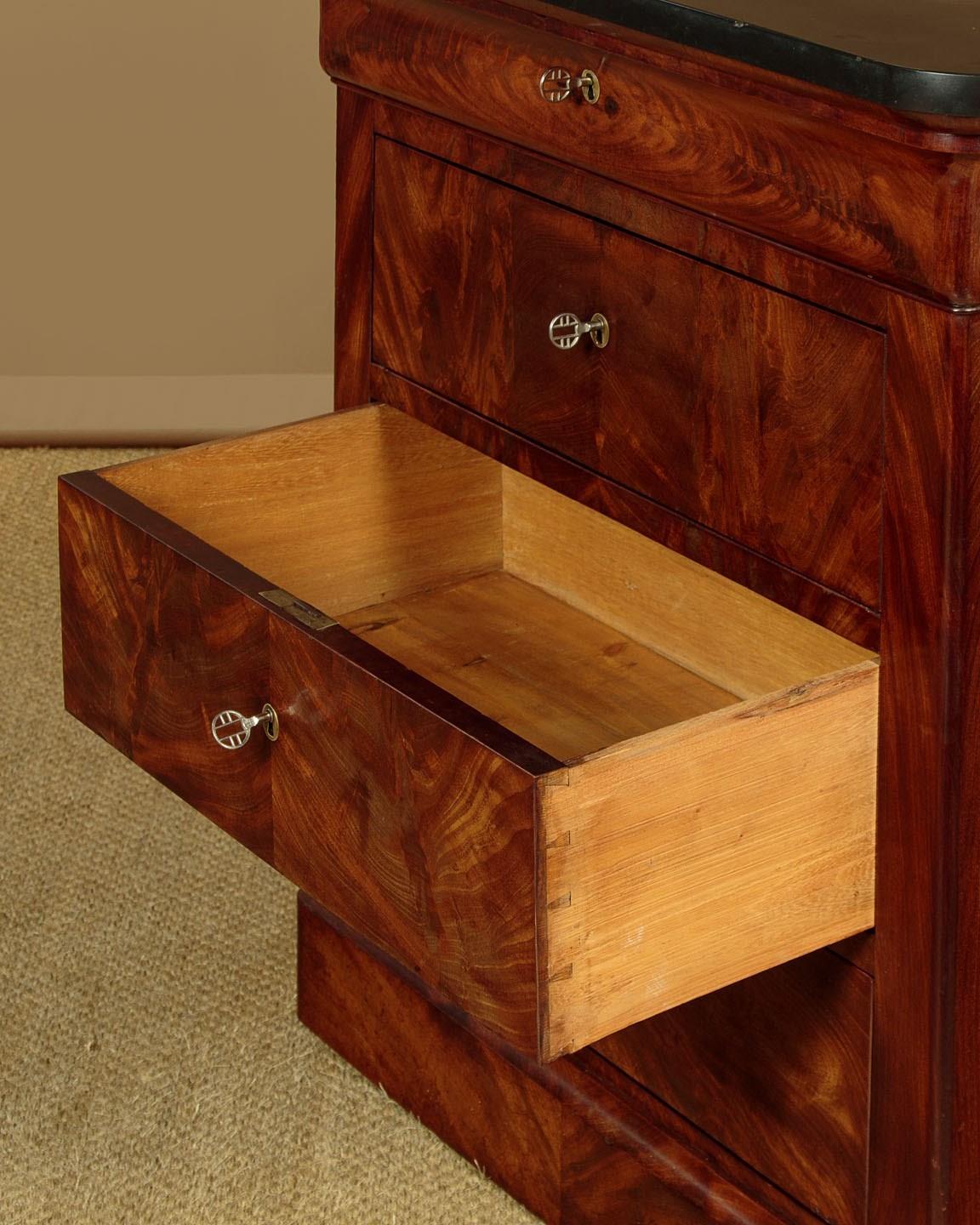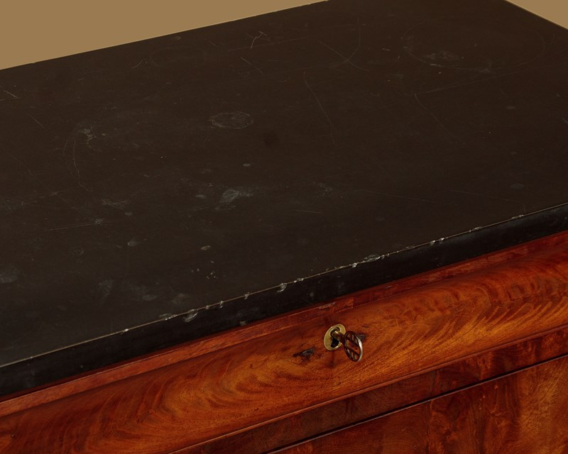Unusually small French Louis Philippe mahogany commode or chest of drawers c.1840. Just 32½" wide. Original black slate top with rounded front corners over a chest of four drawers. Shallower top drawer with a shaped front continued on the cabinet sides. Attractively figured and symmetrically arranged flame mahogany veneers across the drawer fronts, with inlaid brass escutcheons. Mahogany veneered sides and raised on a moulded plinth. Some small chips to the edges of the marble and repairs to the veneers. Generally very good colour and condition, cleaned and waxed in our workshops. Keys supplied.