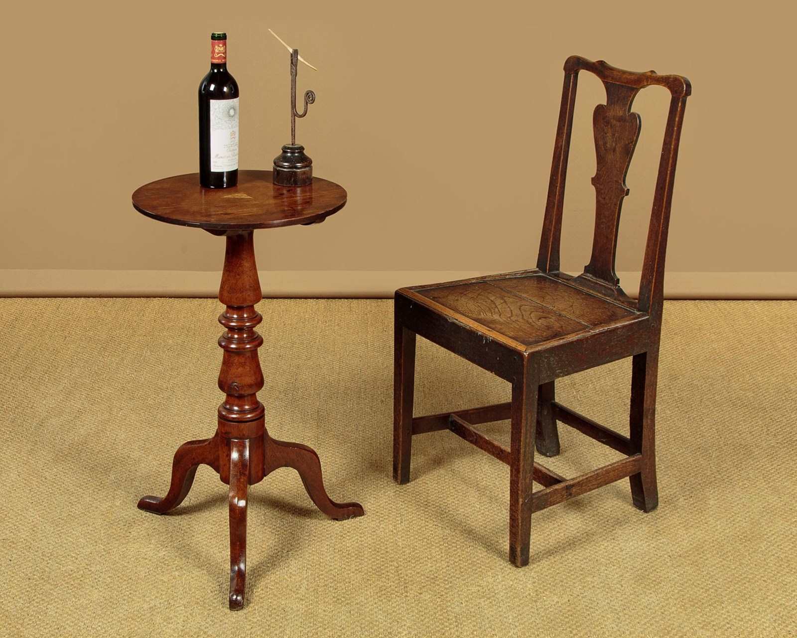 Useful little mid 19th.c. mahogany tilt-top tripod wine table c.1860. 16½" diameter top on a good turned column and shaped tripod legs all in solid mahogany. Top can be tipped to horizontal when not in use, locking into place with a brass catch. Old patched repair to centre of the top. Good colour and condition, cleaned and waxed in our workshops.