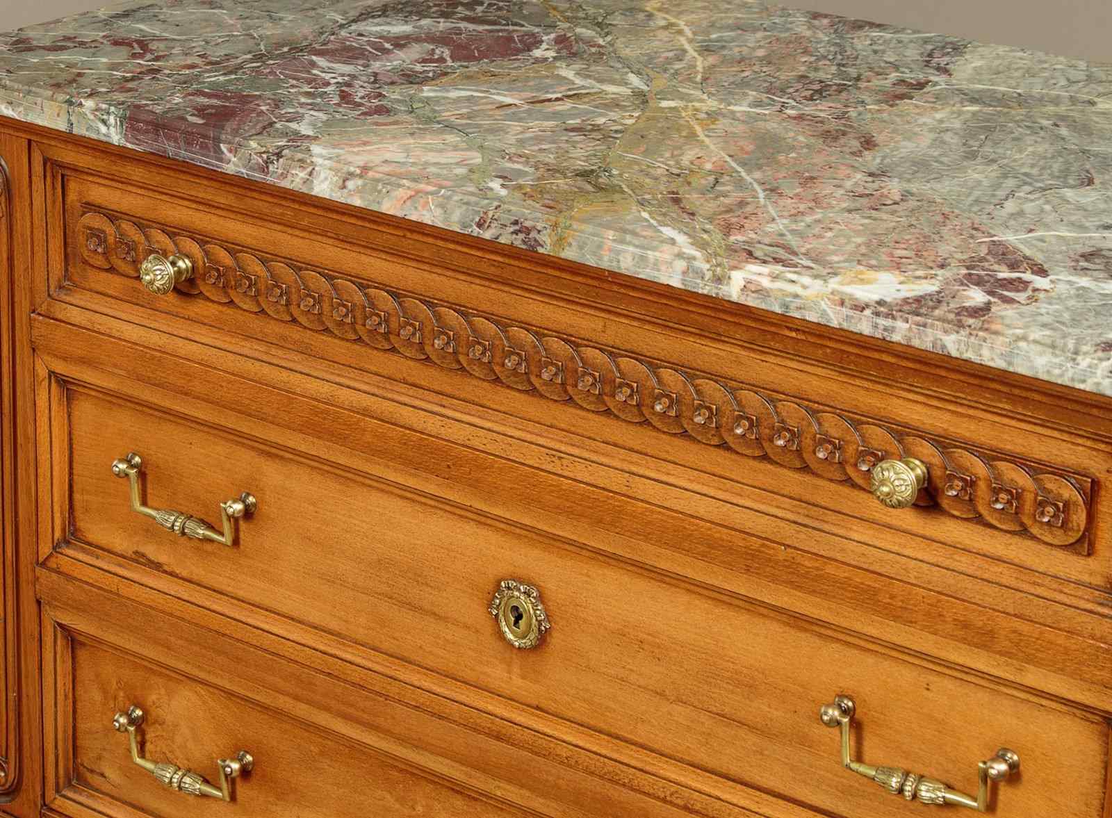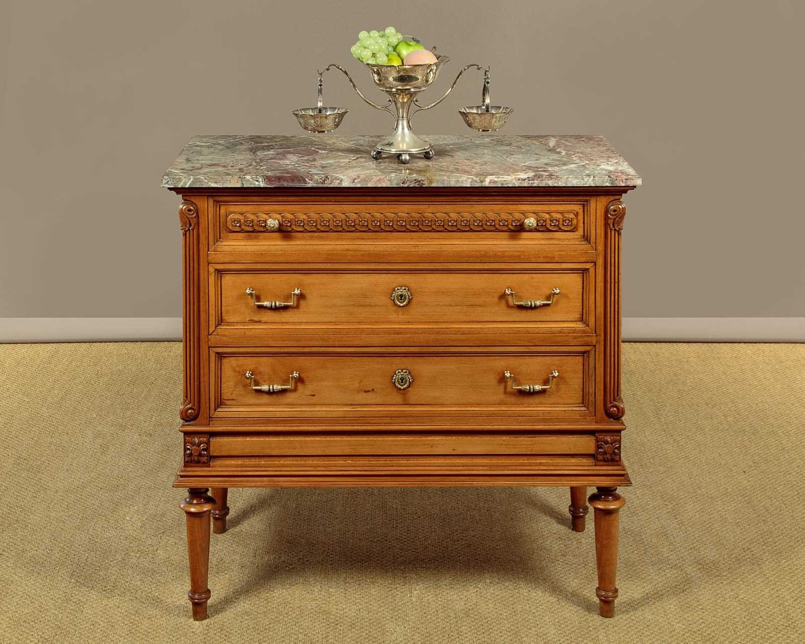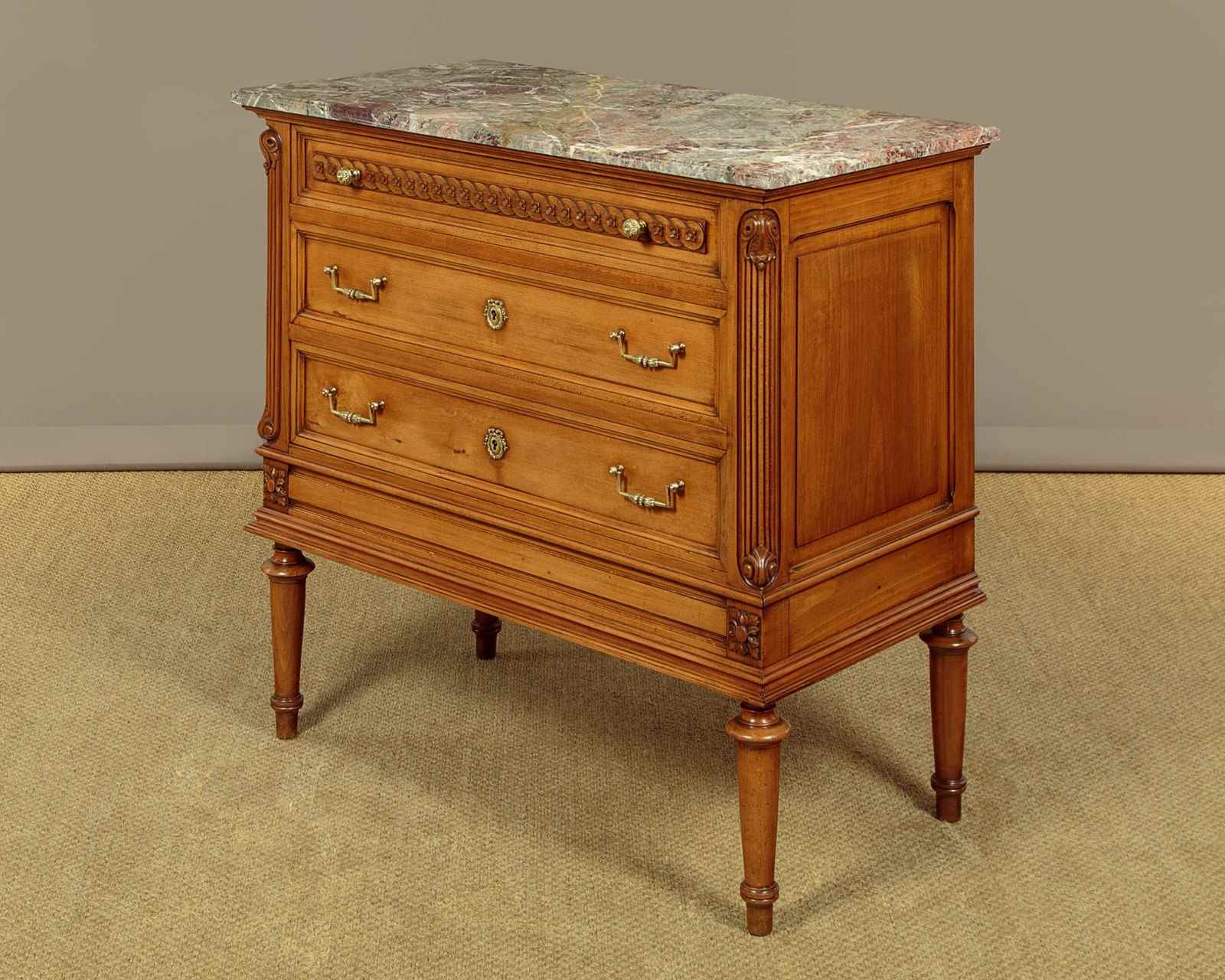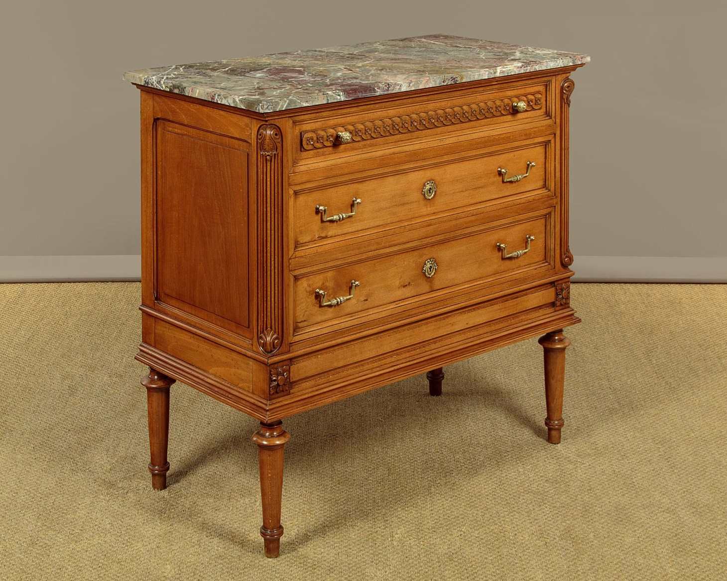 Very smart little French Louis XVI style walnut and marble top commode c.1960. Original and highly figured marble top with a moulded edge. Over a chest of three long drawers. Decorative carved guilloche frieze to the slightly slimmer top drawer, good quality brass knobs, handles and escutcheon plates. Flanked with reeded pilasters to the front corners with scrolling acanthus carved detail top and bottom. Further carved decoration below the drawers and a moulded edge. Raised and fielded side panels. Raised on short turned and tapering legs front and rear. With a repaired break running front to back across the marble. Otherwise excellent colour and condition, cleaned and waxed in our workshops.