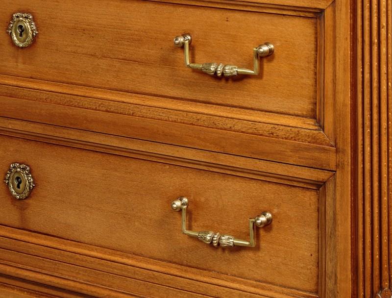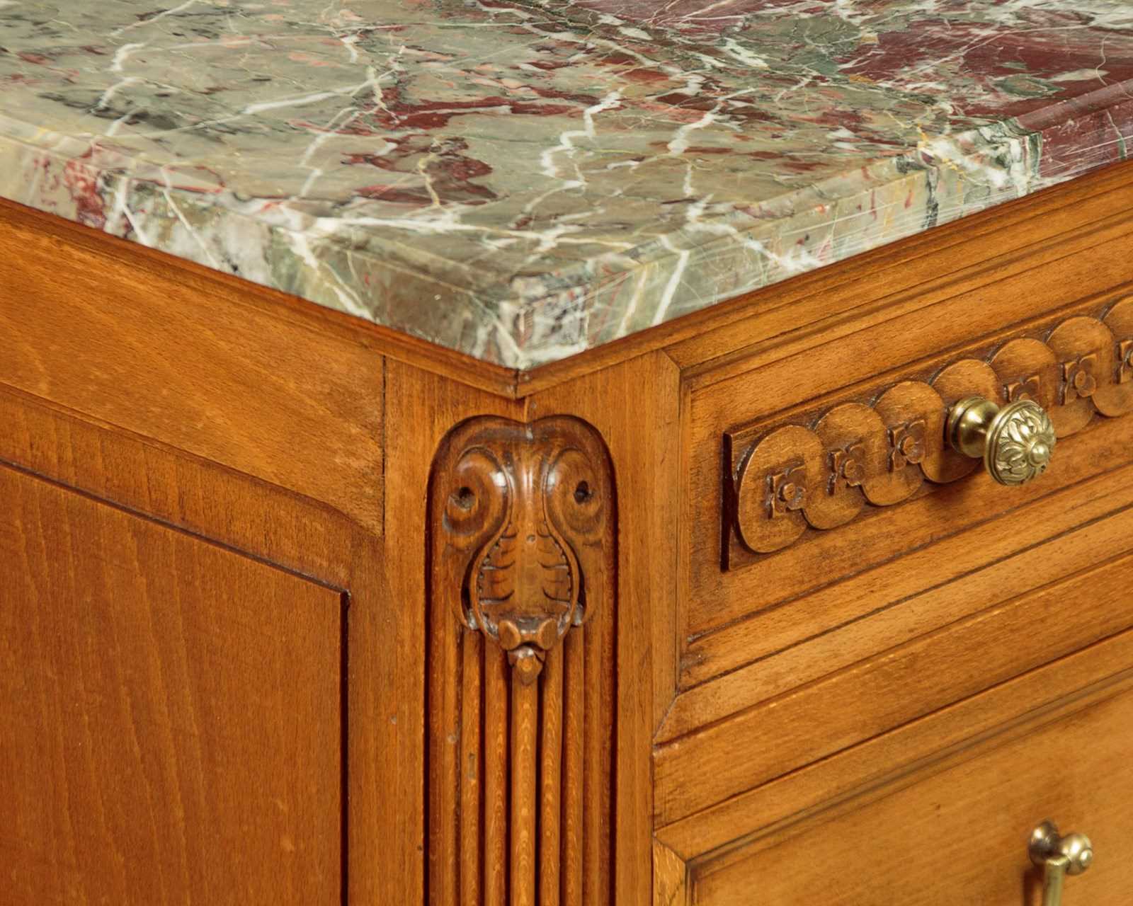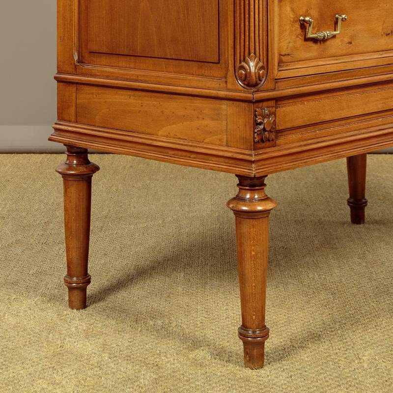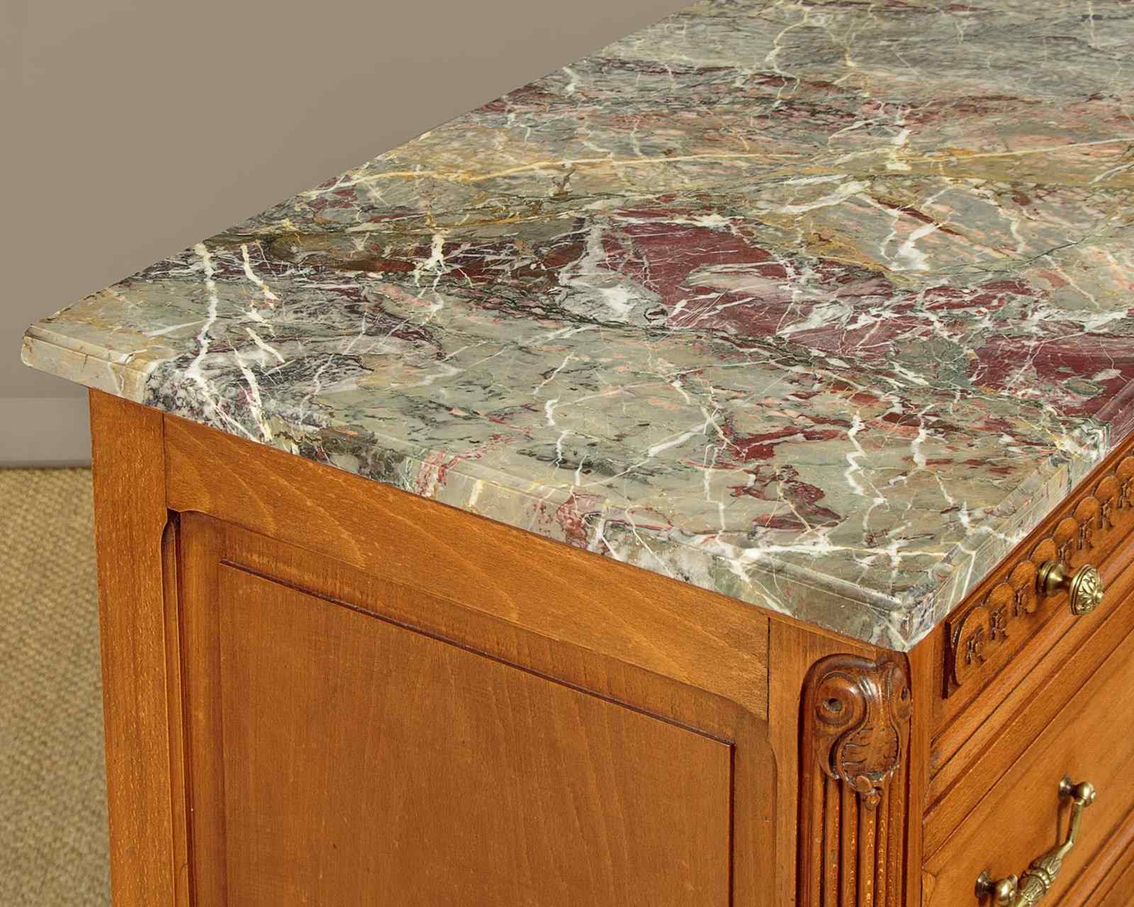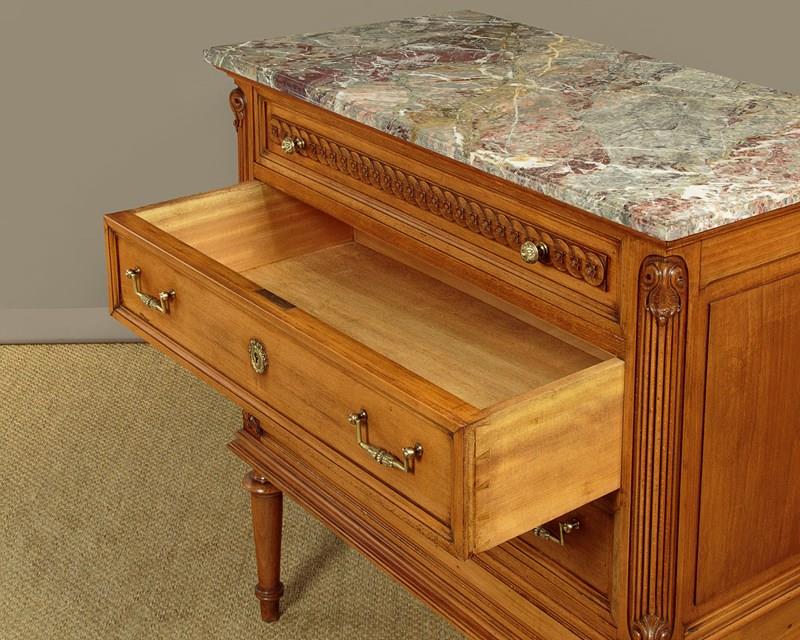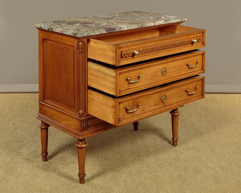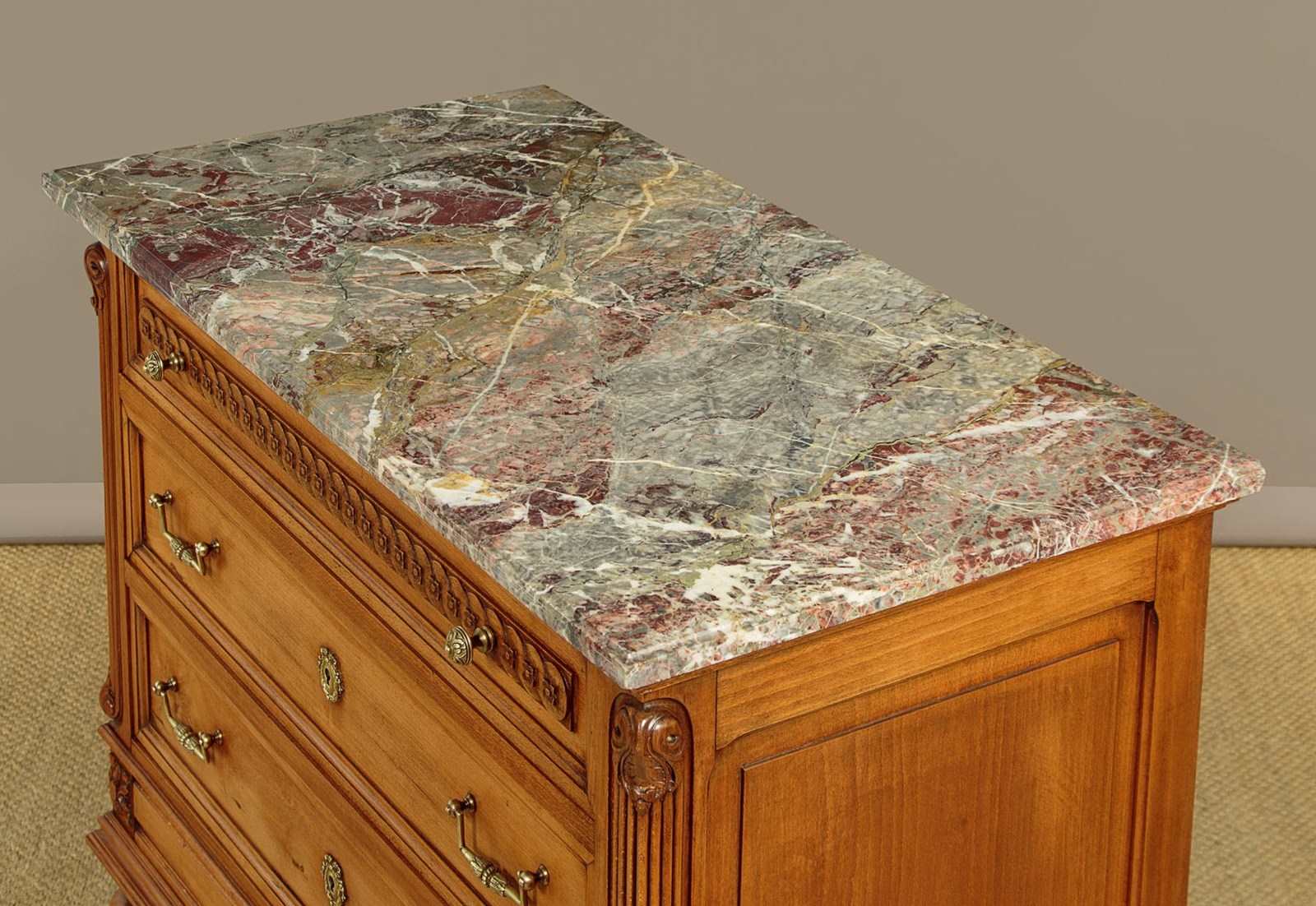 Very smart little French Louis XVI style walnut and marble top commode c.1960. Original and highly figured marble top with a moulded edge. Over a chest of three long drawers. Decorative carved guilloche frieze to the slightly slimmer top drawer, good quality brass knobs, handles and escutcheon plates. Flanked with reeded pilasters to the front corners with scrolling acanthus carved detail top and bottom. Further carved decoration below the drawers and a moulded edge. Raised and fielded side panels. Raised on short turned and tapering legs front and rear. With a repaired break running front to back across the marble. Otherwise excellent colour and condition, cleaned and waxed in our workshops.