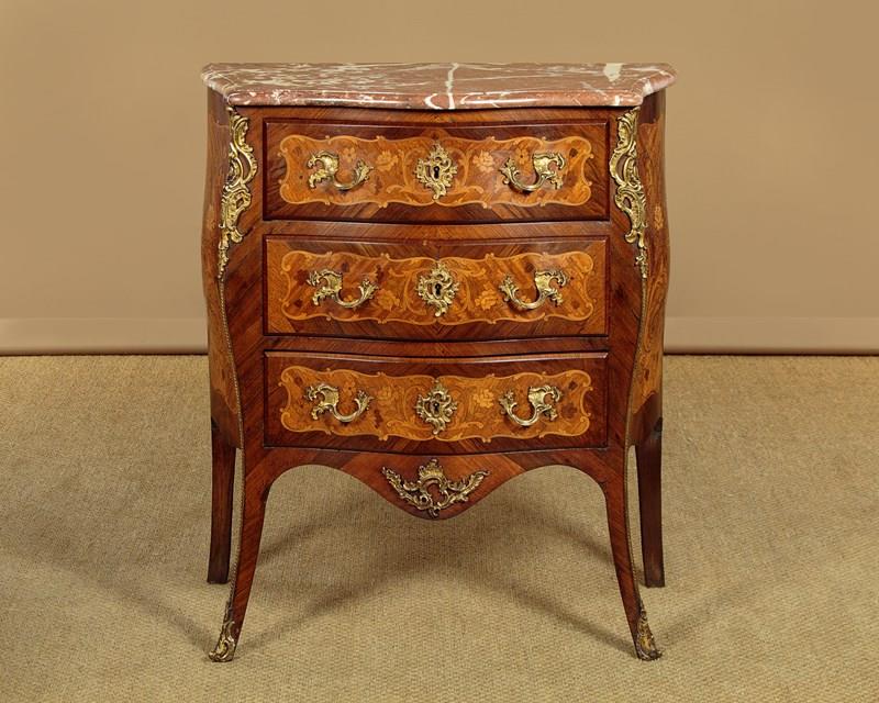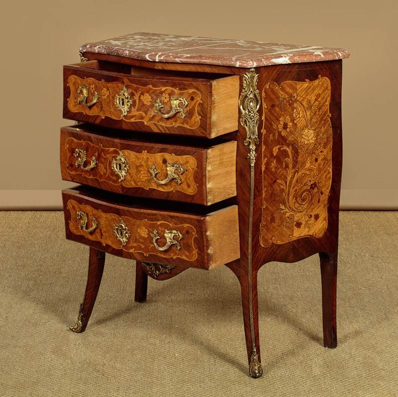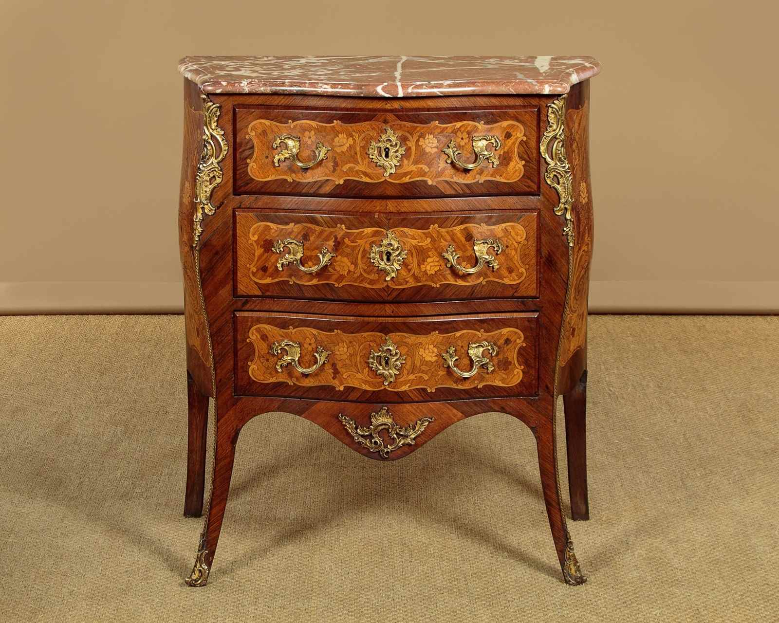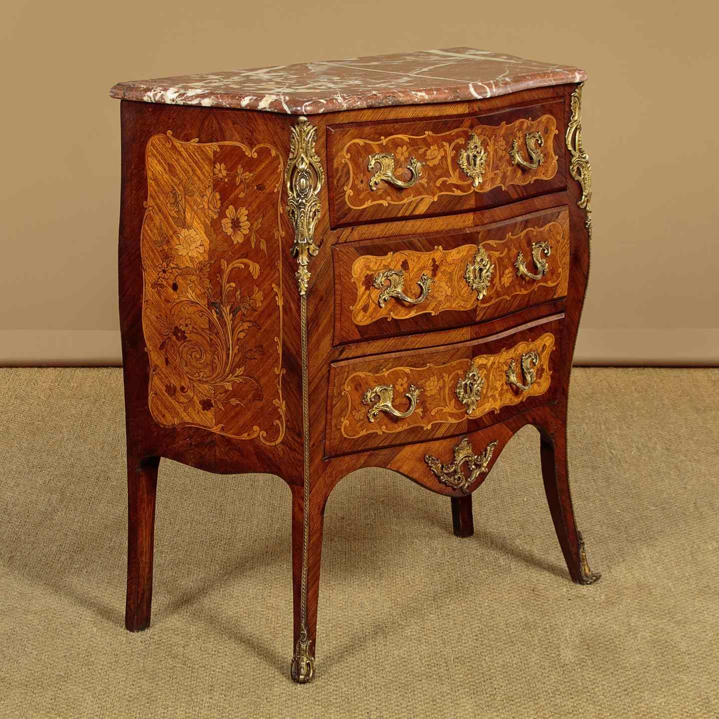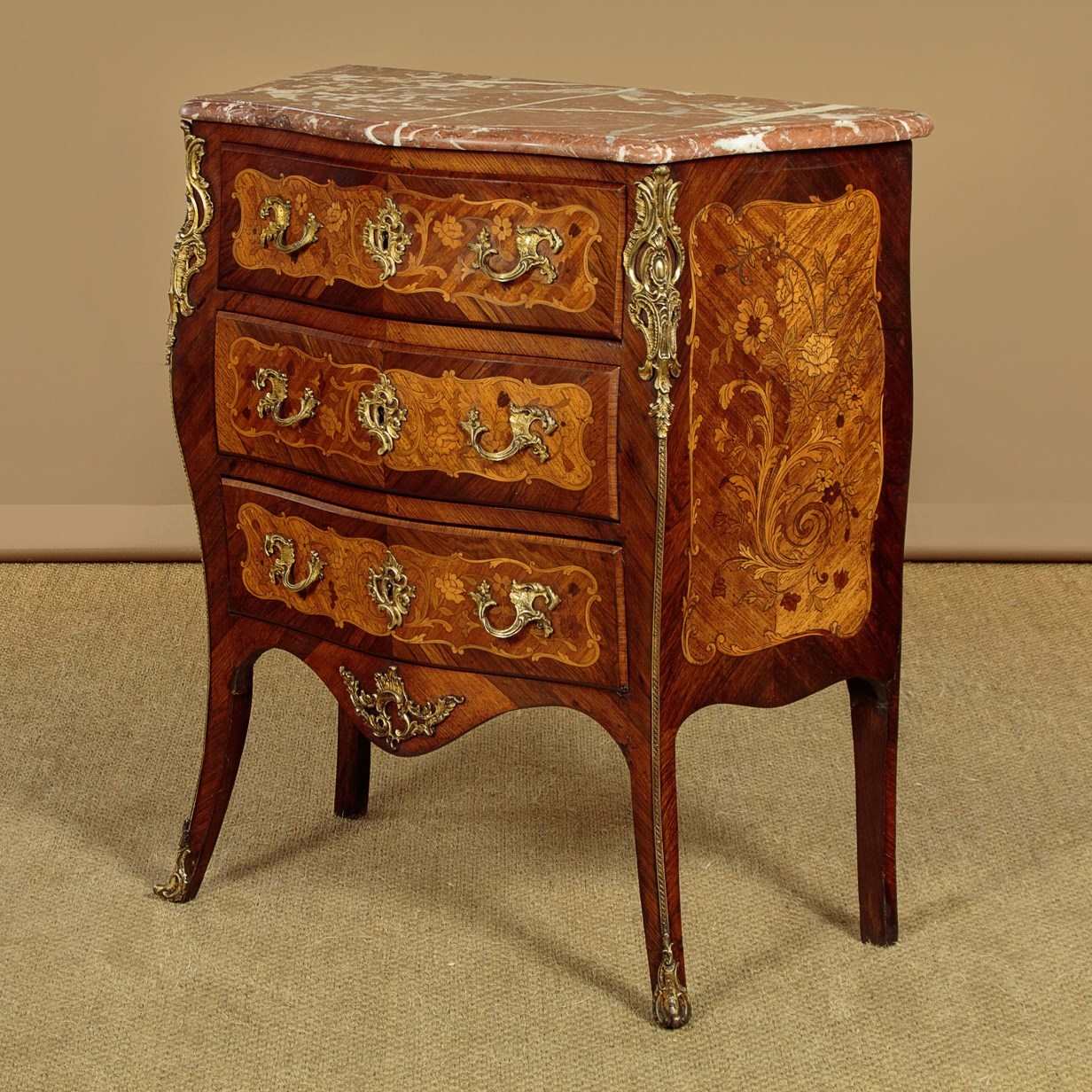 Sweet little French Louis XV style marquetry inlaid chest of drawers or commode c.1930. Useful small size, just 30" wide. Highly figured rouge griotte marble top with a serpentine shaped and moulded edge. Over a chest of three drawer with bombe shaped front and sides. Floral pattern marquetry inlaid drawer fronts and side panels, laid into tulipwood ground with a darker rosewood surround. Gilded brass handles and escutcheons. Large pierced and gilded brass mounts to the shoulders and a brass moulding running down the front edges of the cabinet. Shaped apron below the drawers with a brass mount at the centre and slim flared legs with brass mounts to the feet. Oak drawer linings. Excellent colour and condition, cleaned and waxed in our workshops.