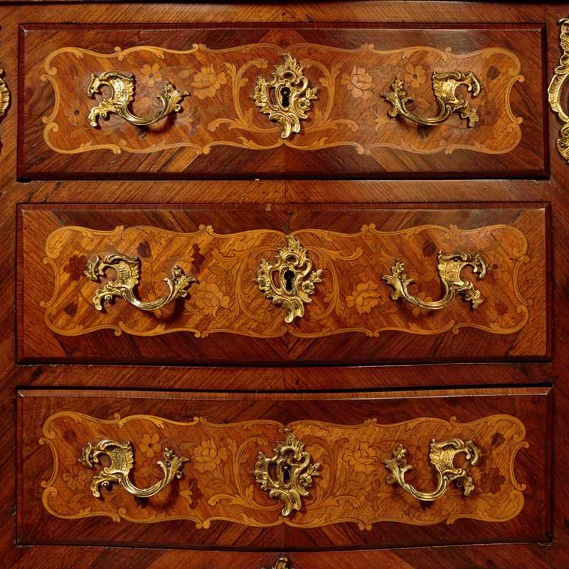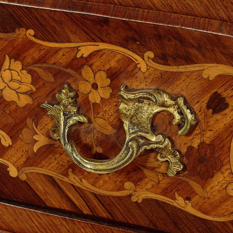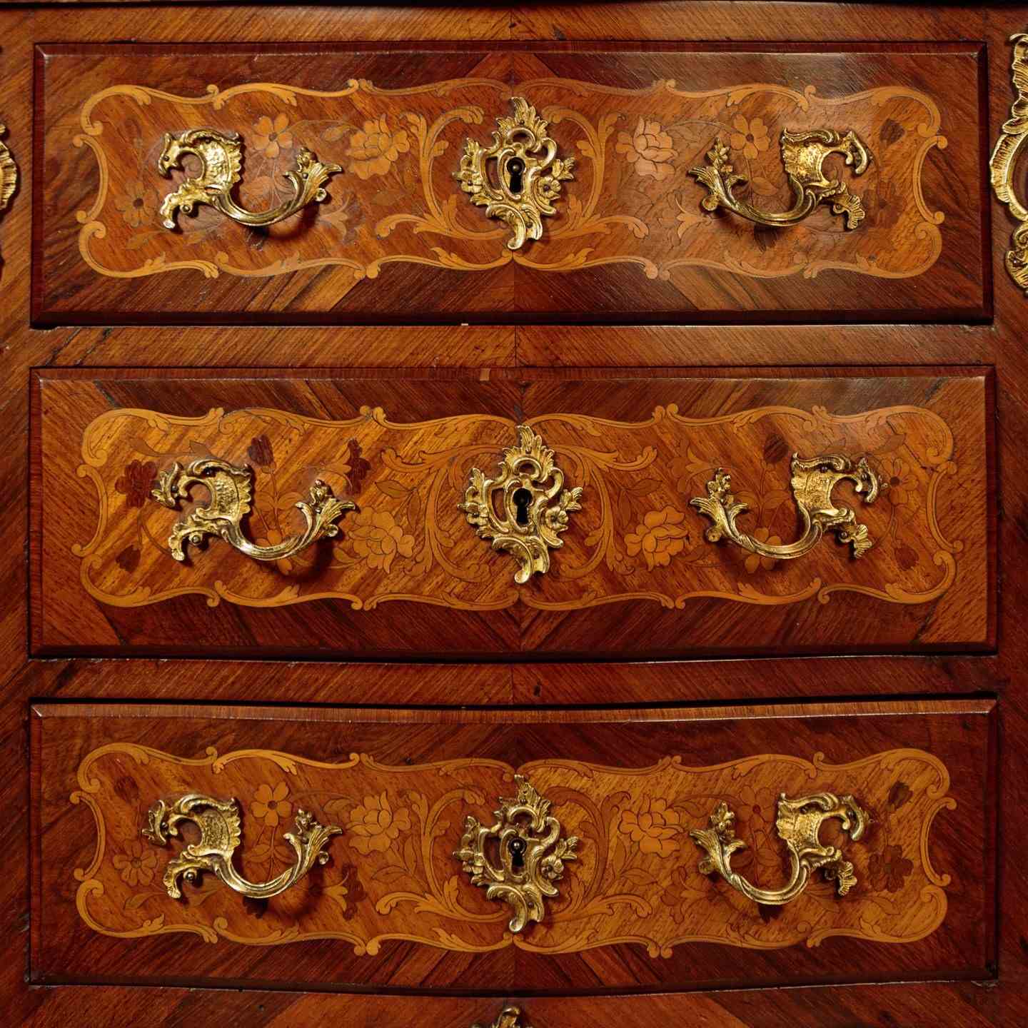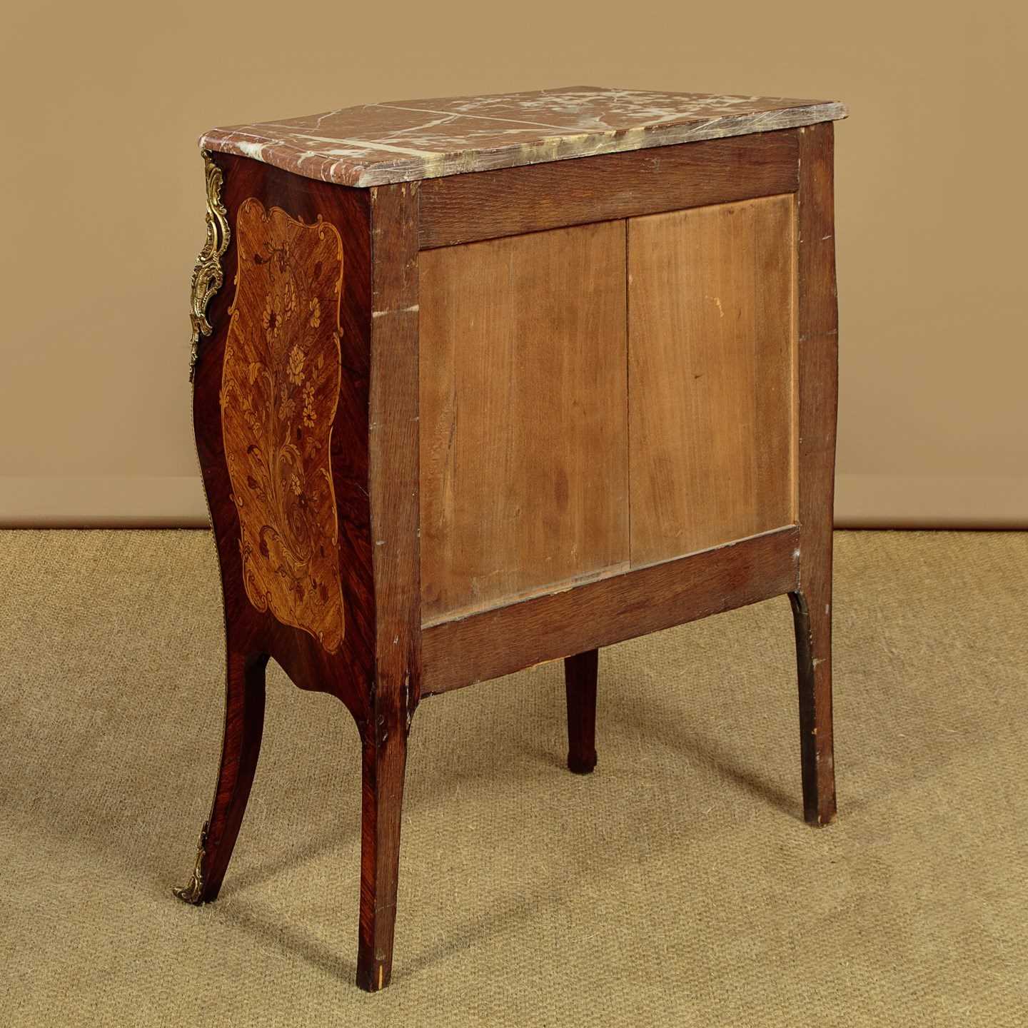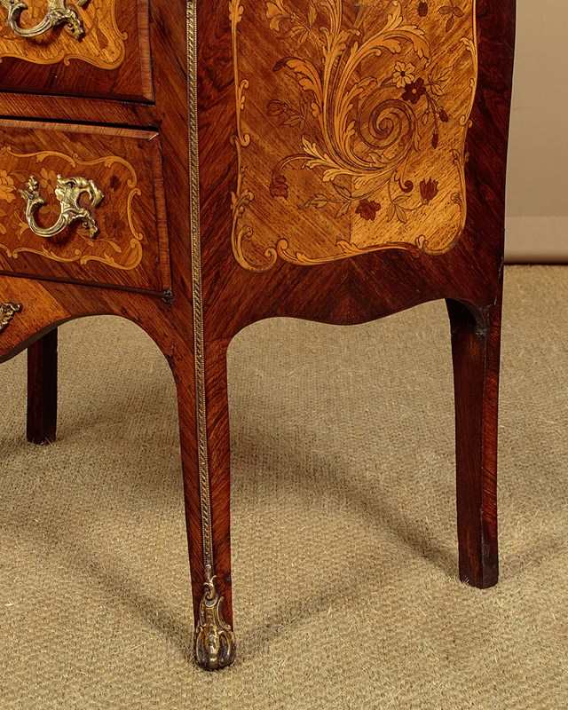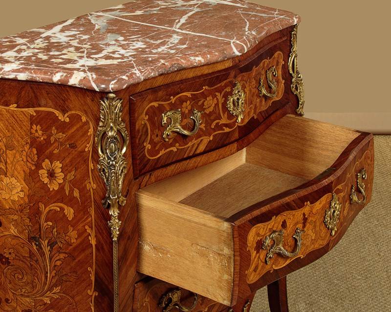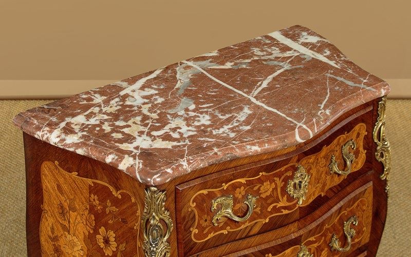 Sweet little French Louis XV style marquetry inlaid chest of drawers or commode c.1930. Useful small size, just 30" wide. Highly figured rouge griotte marble top with a serpentine shaped and moulded edge. Over a chest of three drawer with bombe shaped front and sides. Floral pattern marquetry inlaid drawer fronts and side panels, laid into tulipwood ground with a darker rosewood surround. Gilded brass handles and escutcheons. Large pierced and gilded brass mounts to the shoulders and a brass moulding running down the front edges of the cabinet. Shaped apron below the drawers with a brass mount at the centre and slim flared legs with brass mounts to the feet. Oak drawer linings. Excellent colour and condition, cleaned and waxed in our workshops.