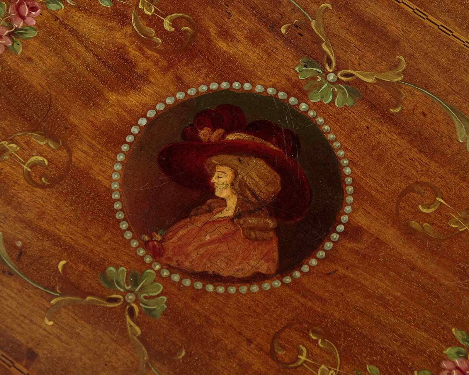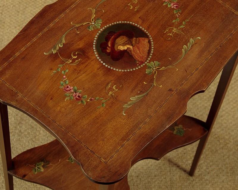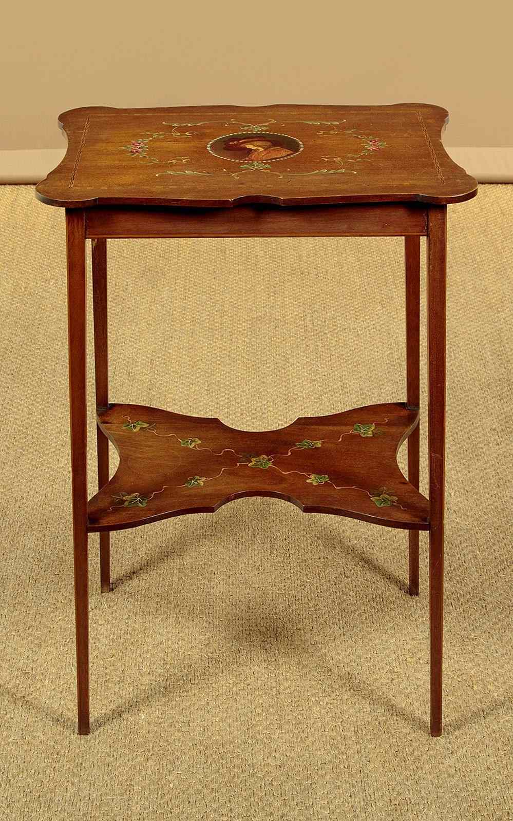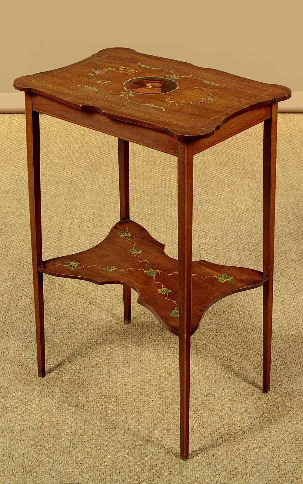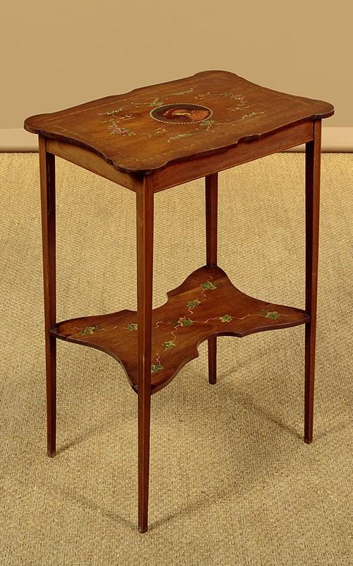Pretty little Sheraton style side table with painted decoration c.1900. 19½" x 13½" top with shaped sides and a fine ebony and boxwood inlaid border. Retaining the original painted decoration of an elegantly dressed lady in a wide-brimmed hat surrounded by a border of pearls, scrolling acanthus and floral garlands. With a shallow apron and slim tapering legs, all with an inlaid stringing to the edges. Legs are joined with a butterfly shaped stretcher shelf with painted decoration of trailing ivy. Very good condition, presented as found. Original label to the underside for the house furnishers Coxeters of Abingdon.