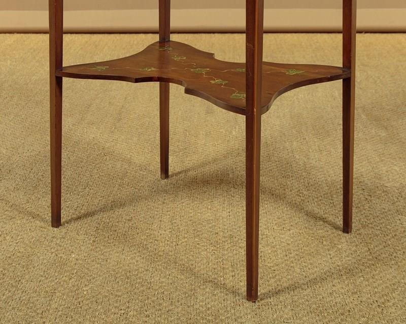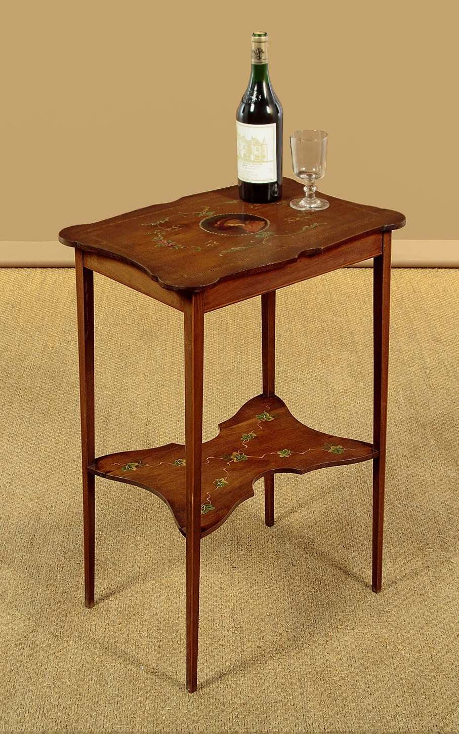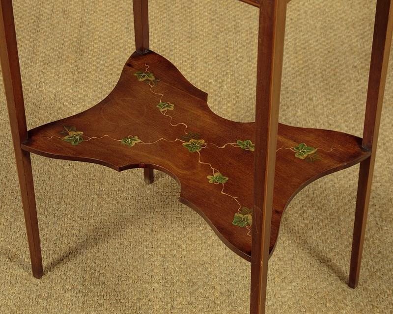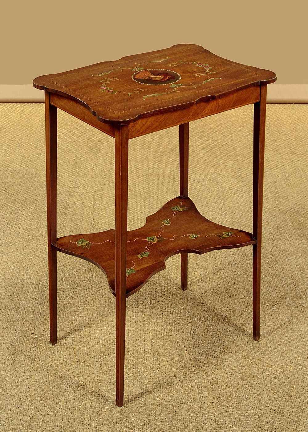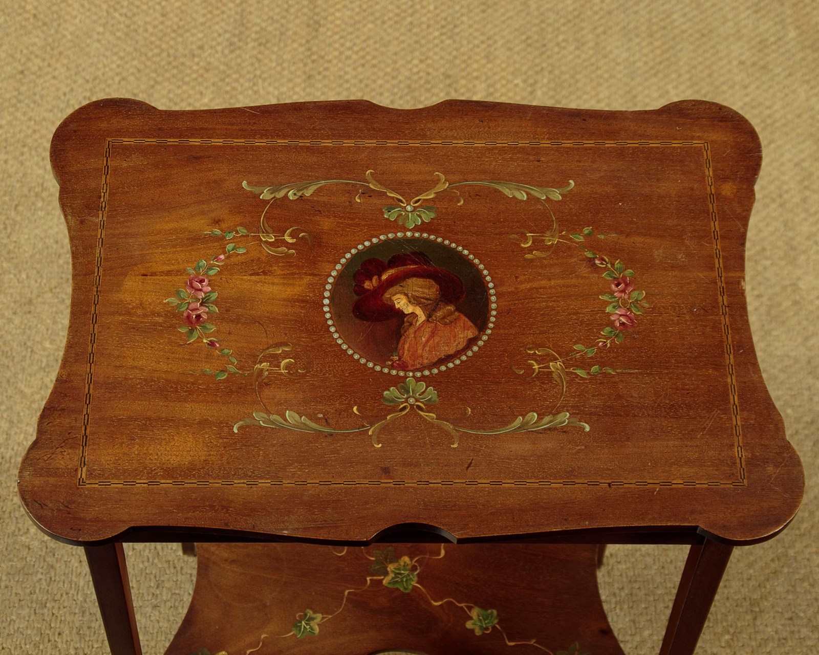 Pretty little Sheraton style side table with painted decoration c.1900. 19½" x 13½" top with shaped sides and a fine ebony and boxwood inlaid border. Retaining the original painted decoration of an elegantly dressed lady in a wide-brimmed hat surrounded by a border of pearls, scrolling acanthus and floral garlands. With a shallow apron and slim tapering legs, all with an inlaid stringing to the edges. Legs are joined with a butterfly shaped stretcher shelf with painted decoration of trailing ivy. Very good condition, presented as found. Original label to the underside for the house furnishers Coxeters of Abingdon.