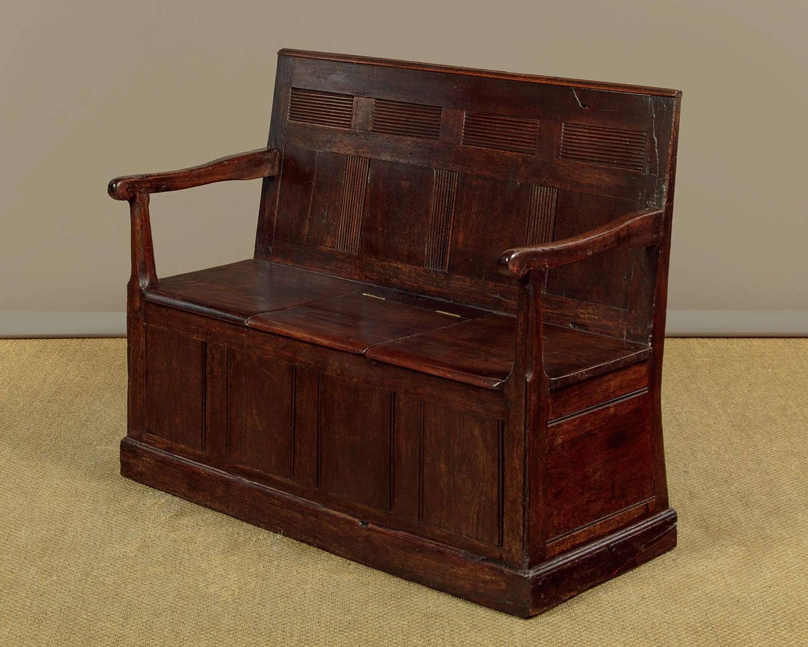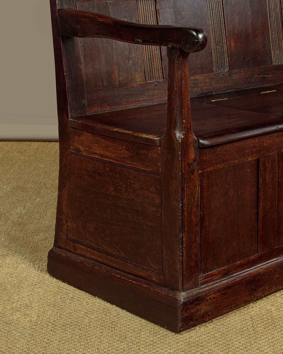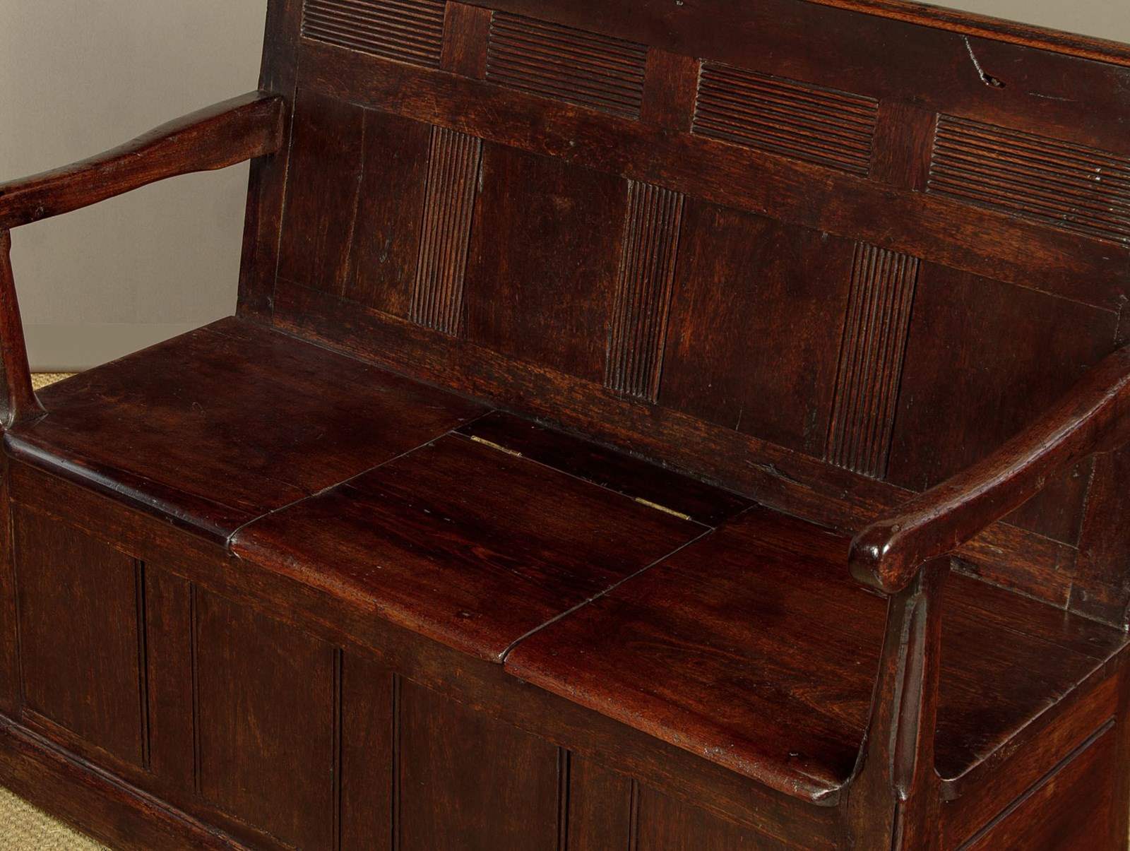 Small early 19th.c. Welsh box settle or hall bench c.1800. Purchased locally, it is an unusual example being in teak or similar rather than native timber - suggesting a link to maritime trade perhaps? Low and slightly sloping backrest with original moulding to the top and unusual reeded detail to the upper panels and the lower mullions. Shaped arms with rounded ends on tapering and chamfered supports. Board seat, the centre panel hinged to reveal useful storage below for boots and shoes etc. Flat panels to the front and sides and a moulded plinth or kickboard around the base. Note the original backboards and how the rear flares outwards for stability. Great rustic character with some old wear and repairs but otherwise excellent colour and condition, restored cleaned and waxed in our workshops.
