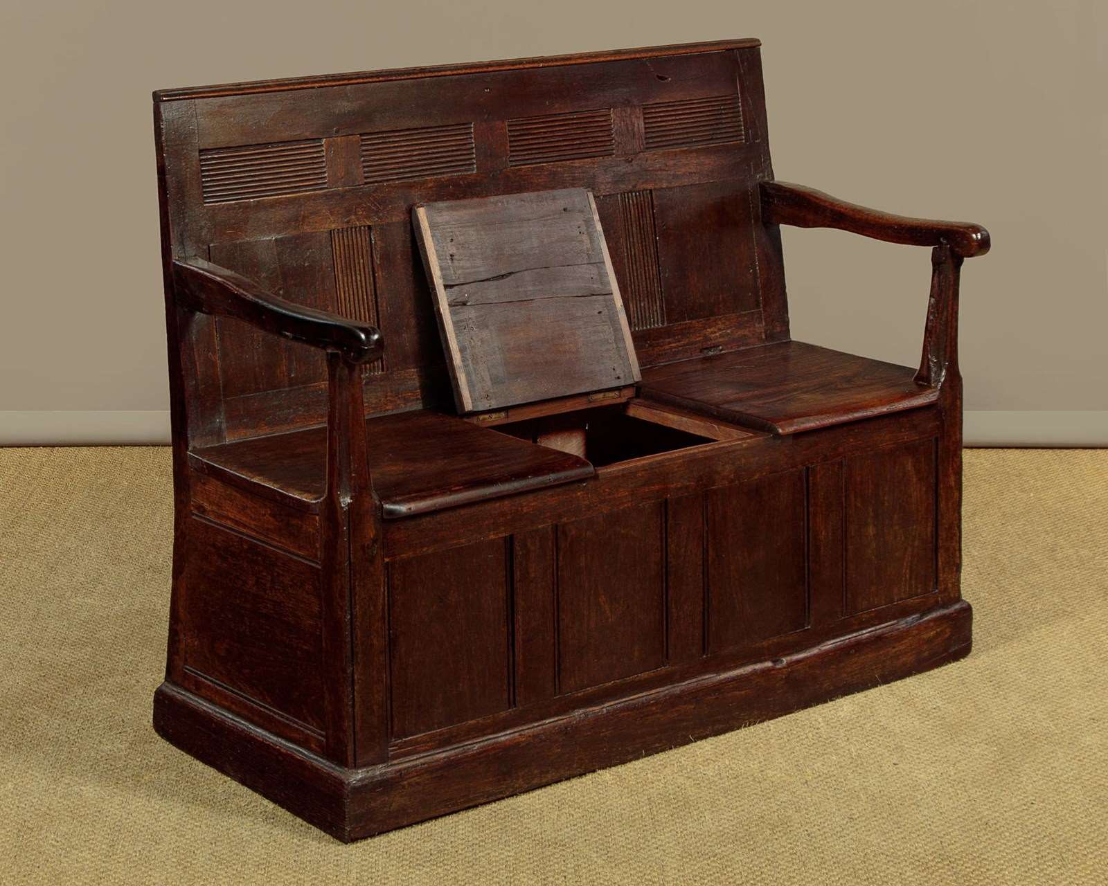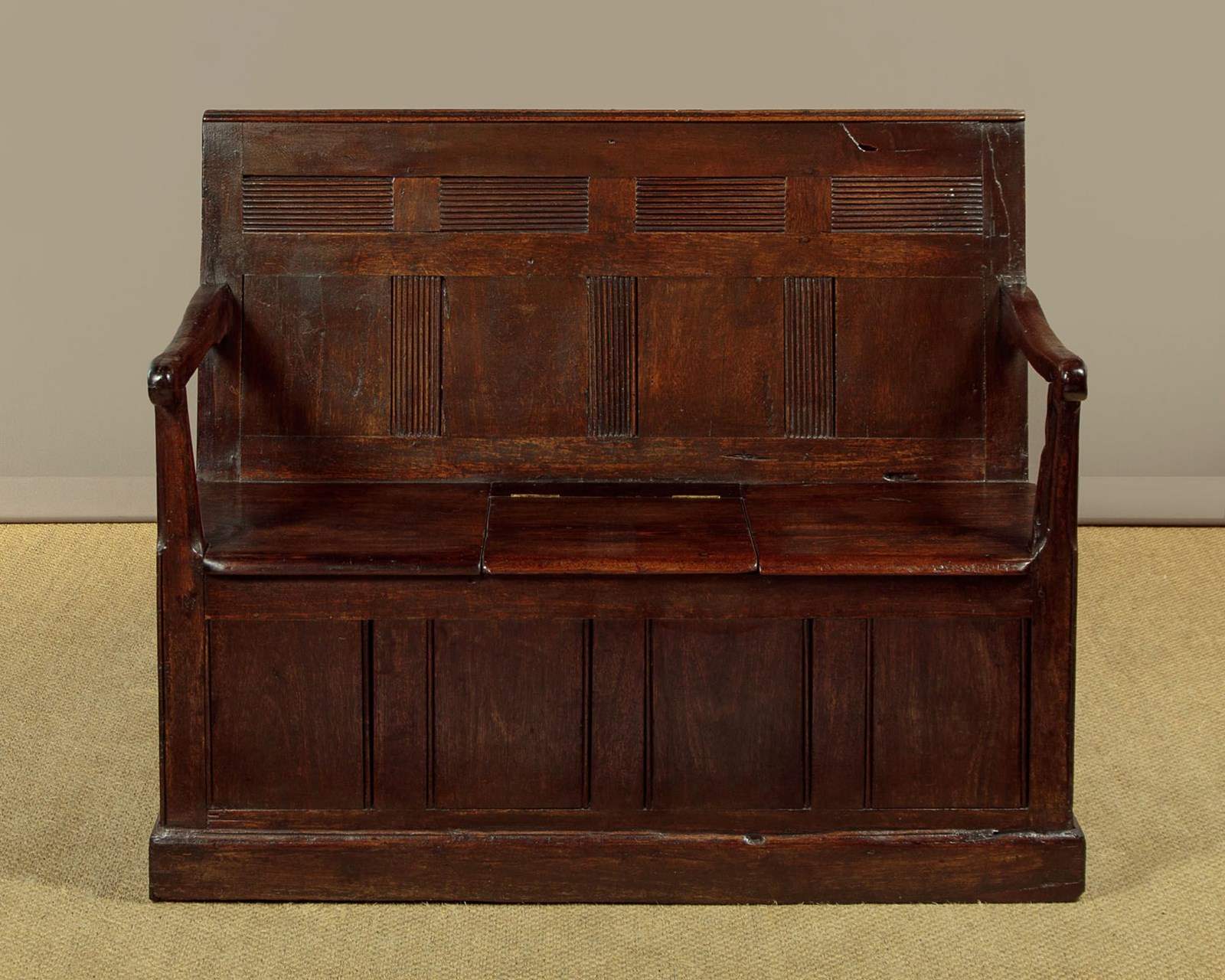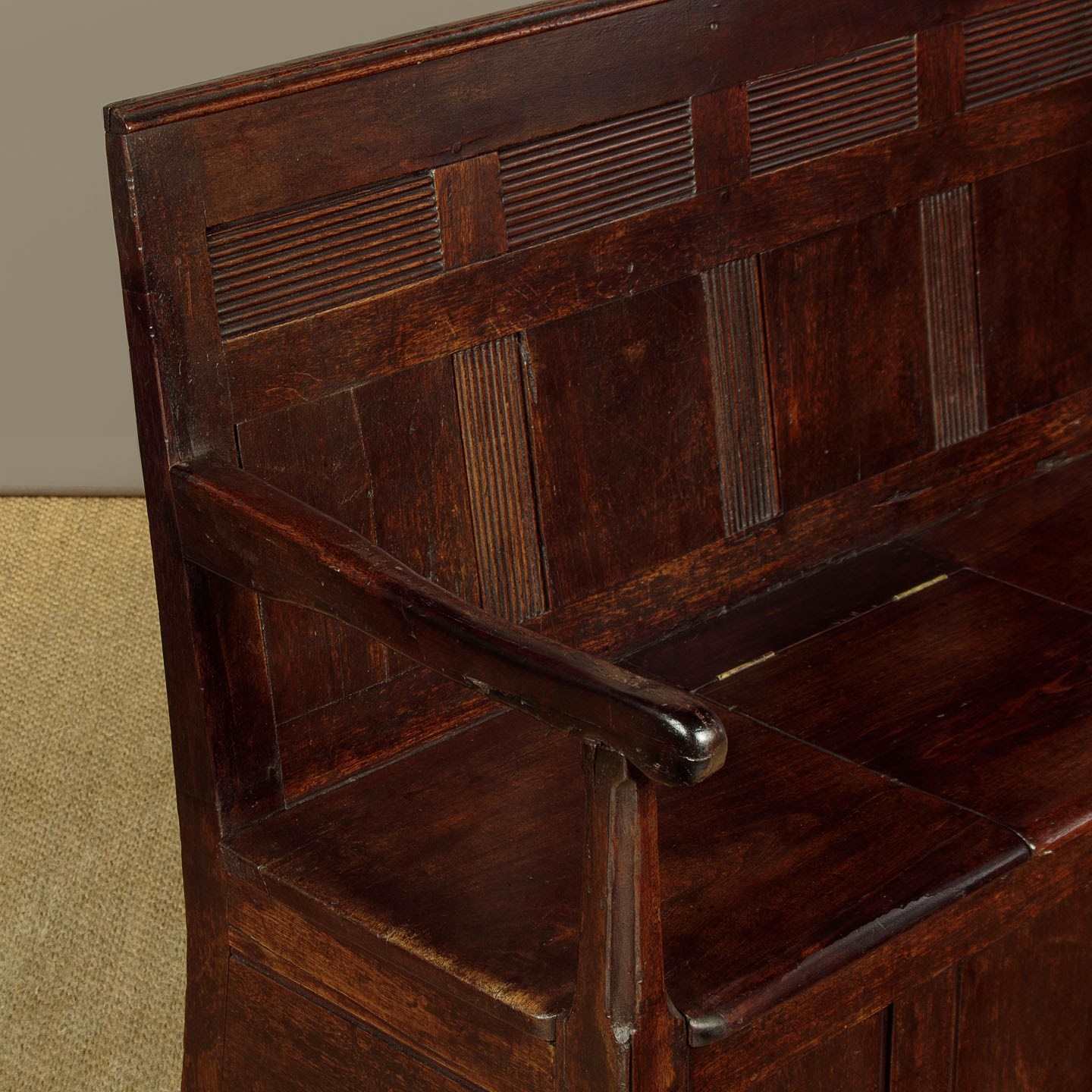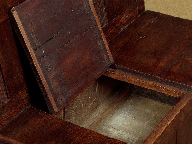 Small early 19th.c. Welsh box settle or hall bench c.1800. Purchased locally, it is an unusual example being in teak or similar rather than native timber - suggesting a link to maritime trade perhaps? Low and slightly sloping backrest with original moulding to the top and unusual reeded detail to the upper panels and the lower mullions. Shaped arms with rounded ends on tapering and chamfered supports. Board seat, the centre panel hinged to reveal useful storage below for boots and shoes etc. Flat panels to the front and sides and a moulded plinth or kickboard around the base. Note the original backboards and how the rear flares outwards for stability. Great rustic character with some old wear and repairs but otherwise excellent colour and condition, restored cleaned and waxed in our workshops.