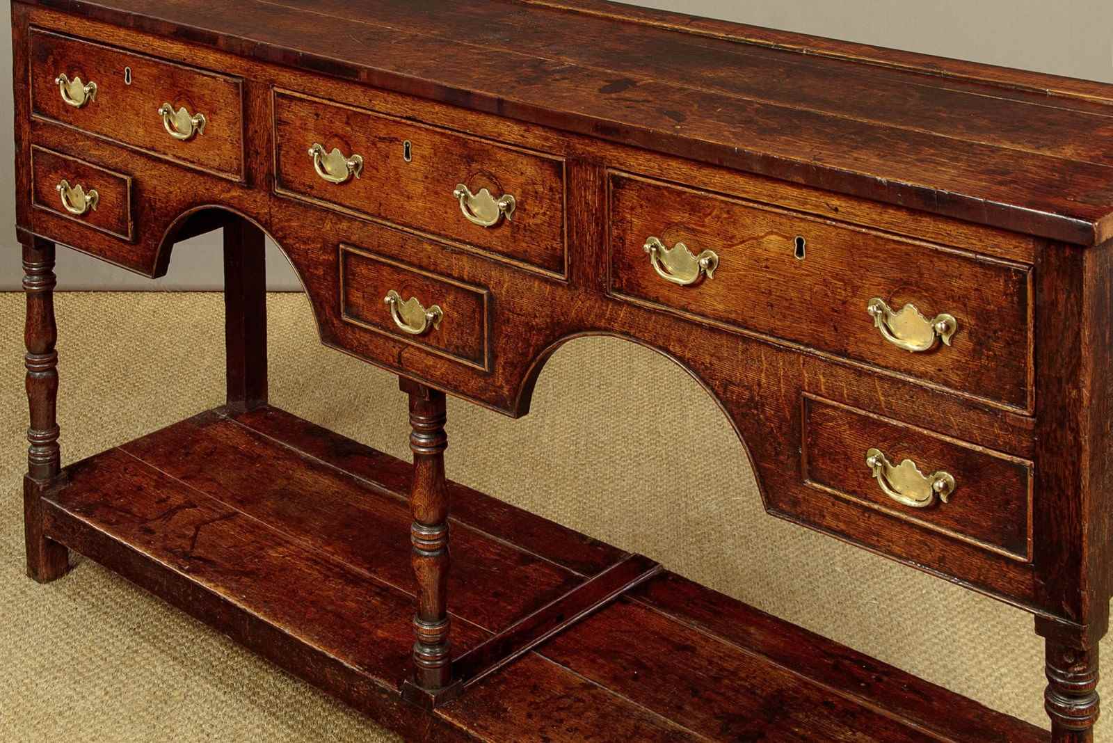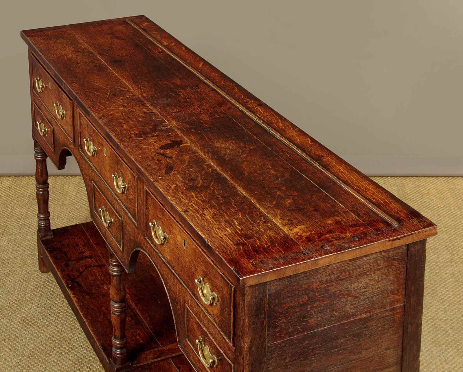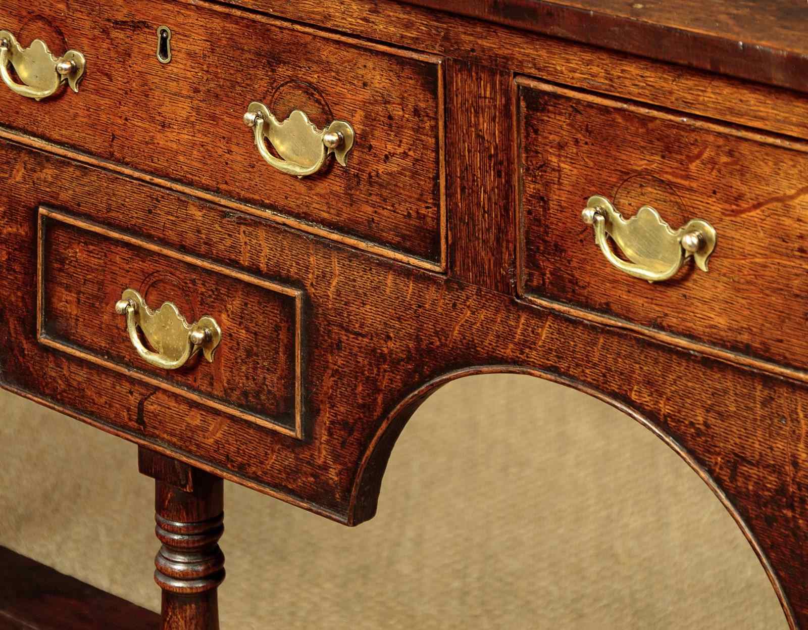 Sweet little early 19th.c. Welsh dresser base South Wales c.1810. Unusual small size, just 59" wide. Top made of three oak boards with an applied bead to form a plate stand (can be removed if preferred) and an unusual mahogany crossbanded edge. Over three larger drawers and two small knife drawers (the small drawer at the middle being a dummy drawer front). With cockbeaded edges to the drawer fronts and simple Georgian pattern brass handles. Double arch apron to the front, also with a cockbeaded edge. Raised on three turned front legs joined to the straight rear stiles with a potboard display shelf with oak boards and rails. Solid oak sides, pine drawer linings and back board. Very good colour and condition, cleaned and waxed in our workshops.