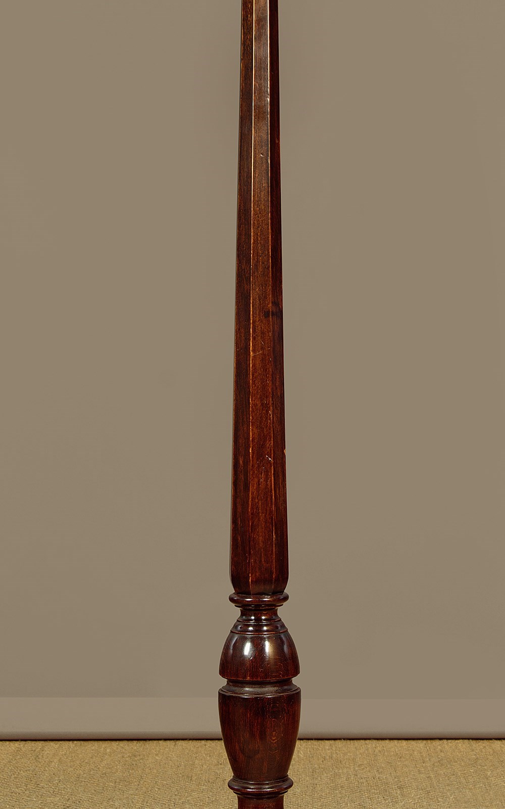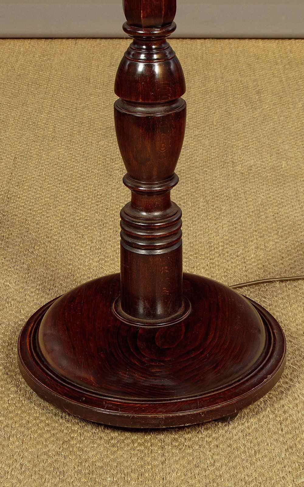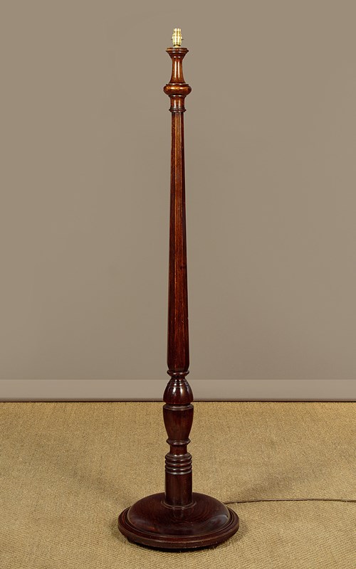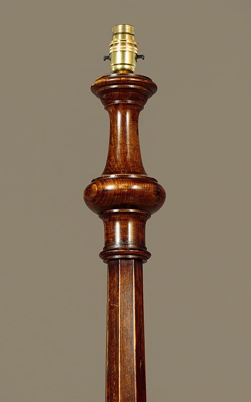Stained beechwood standard lamp c.1930. Single bulb raised on a tapering octagonal column with turned elements. 15" diameter base in solid timber with a good weight for stability and three turned bun feet below. Excellent condition, cleaned rewired and PAT tested.