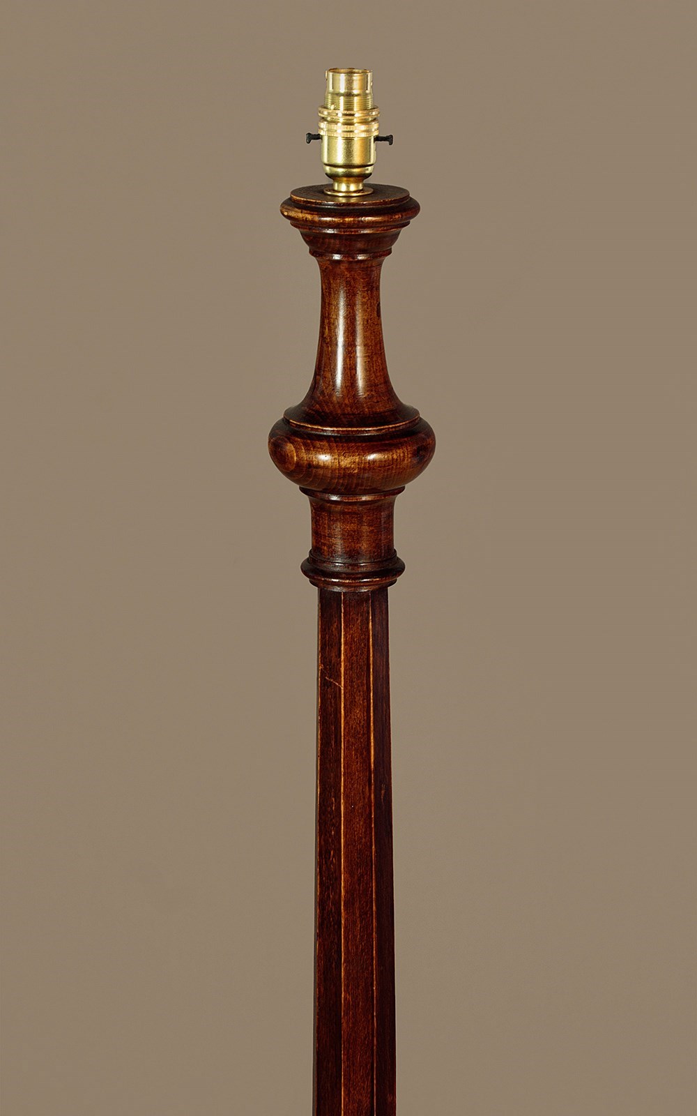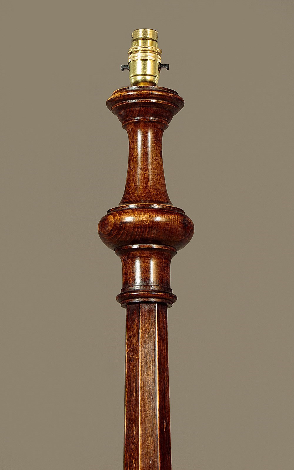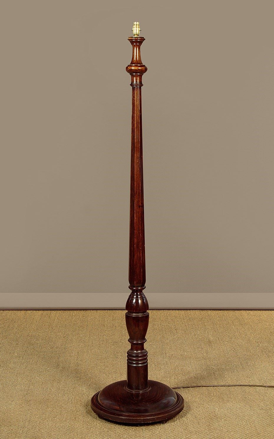 Stained beechwood standard lamp c.1930. Single bulb raised on a tapering octagonal column with turned elements. 15" diameter base in solid timber with a good weight for stability and three turned bun feet below. Excellent condition, cleaned rewired and PAT tested.