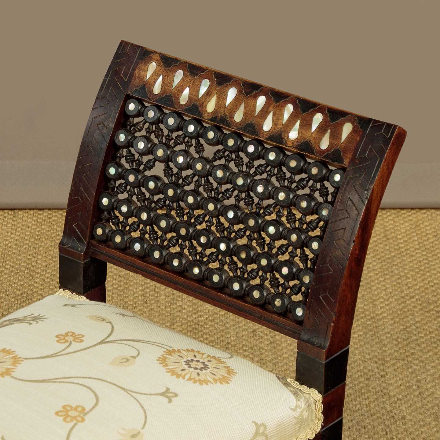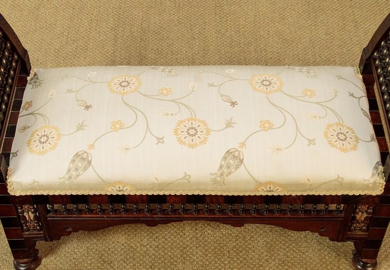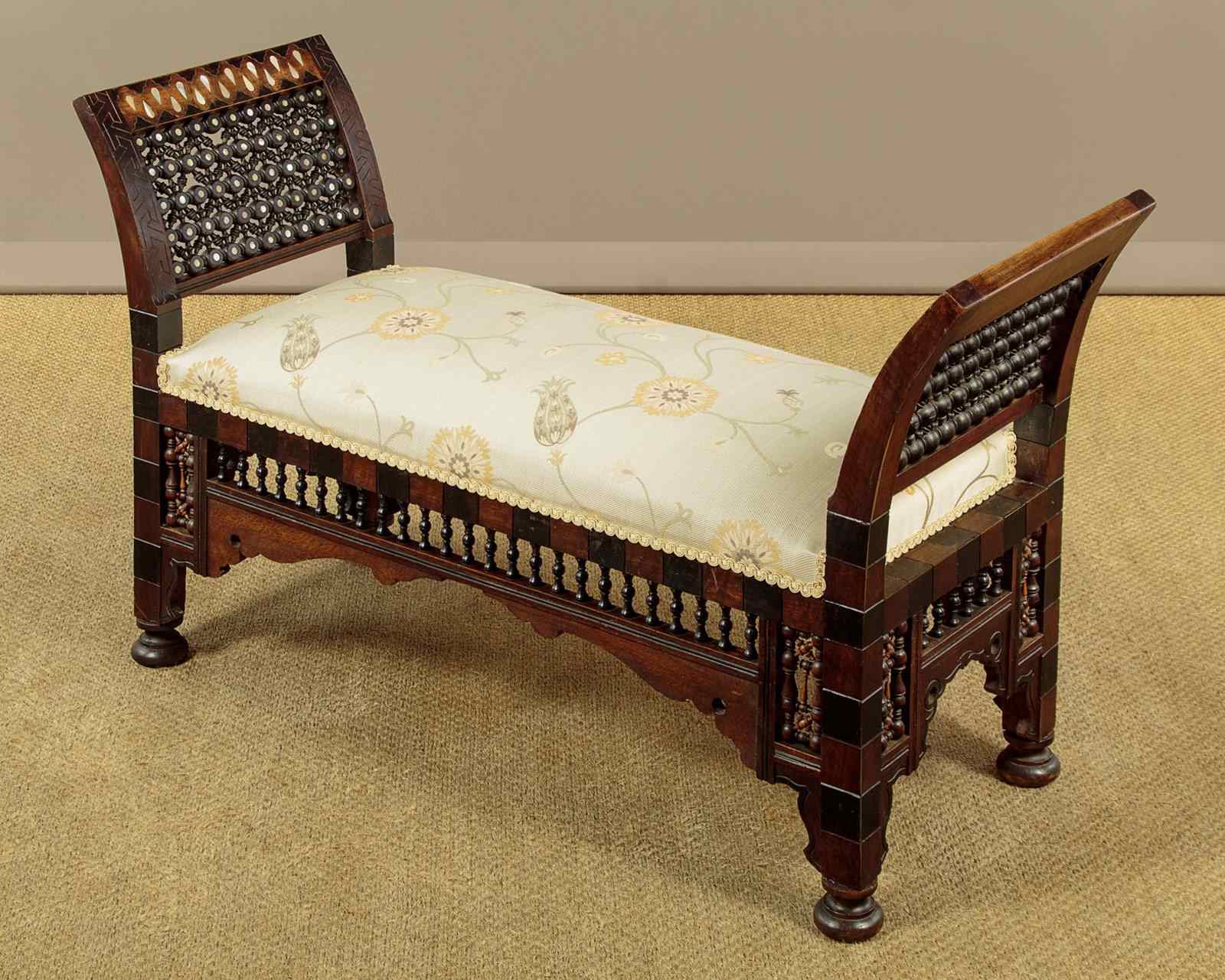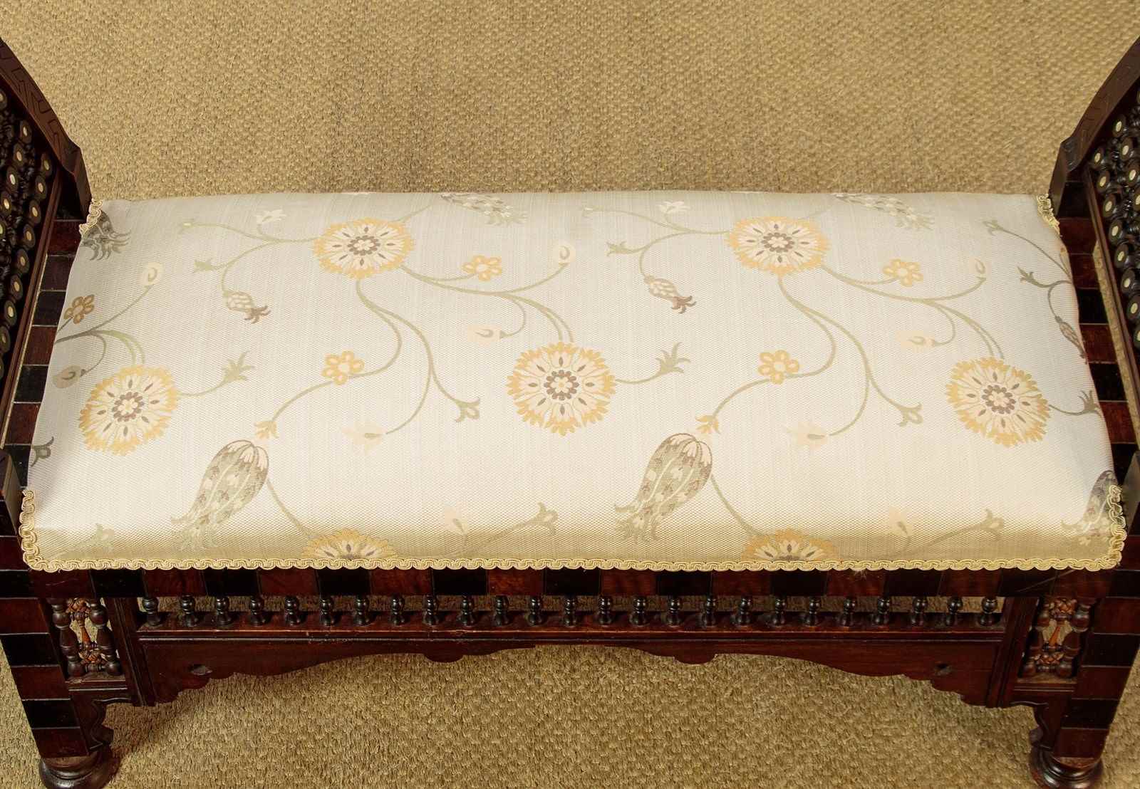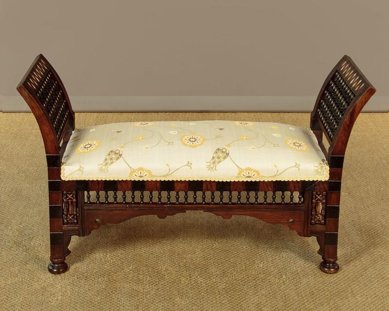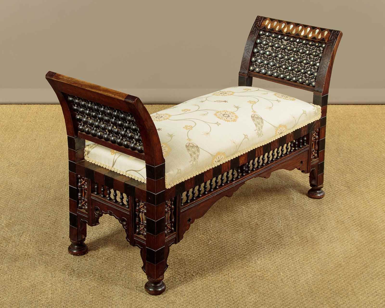 Unusual little Syrian window seat or stool c.1920. Walnut frame with raised ends with mashrabiya panels, stained and inlaid with mother of pearl. Over a sprung seat (height 15½") freshly upholstered a pale fabric with stylized flower heads. Shaped apron to all four sides below the seat with rows of finely turned spindles. Alternate polished and stained block detail to the frame and legs. Raised on turned feet. Very good condition, cleaned and waxed in our workshops.