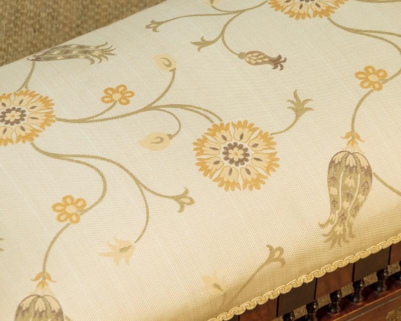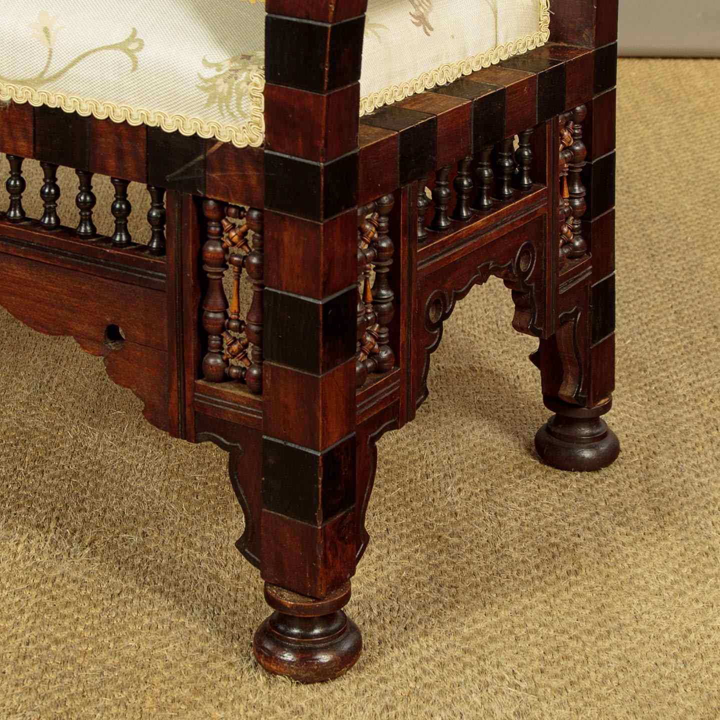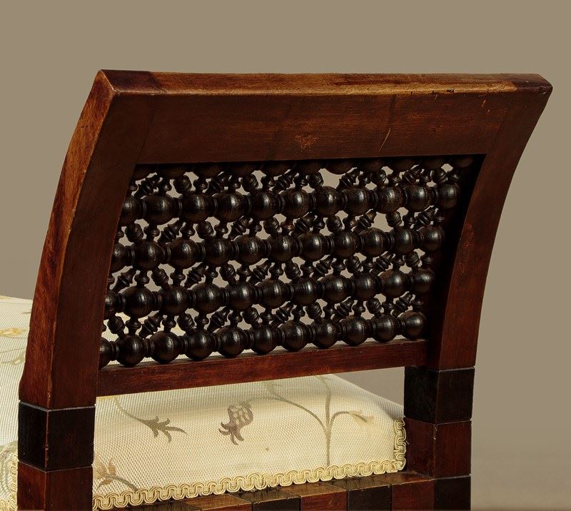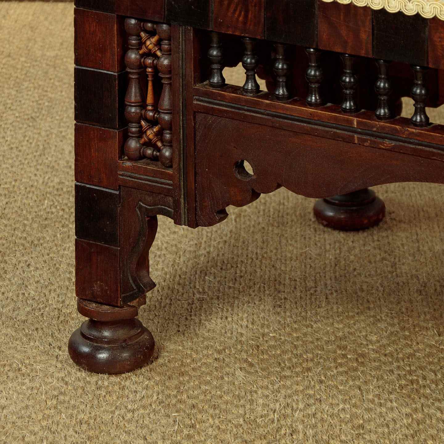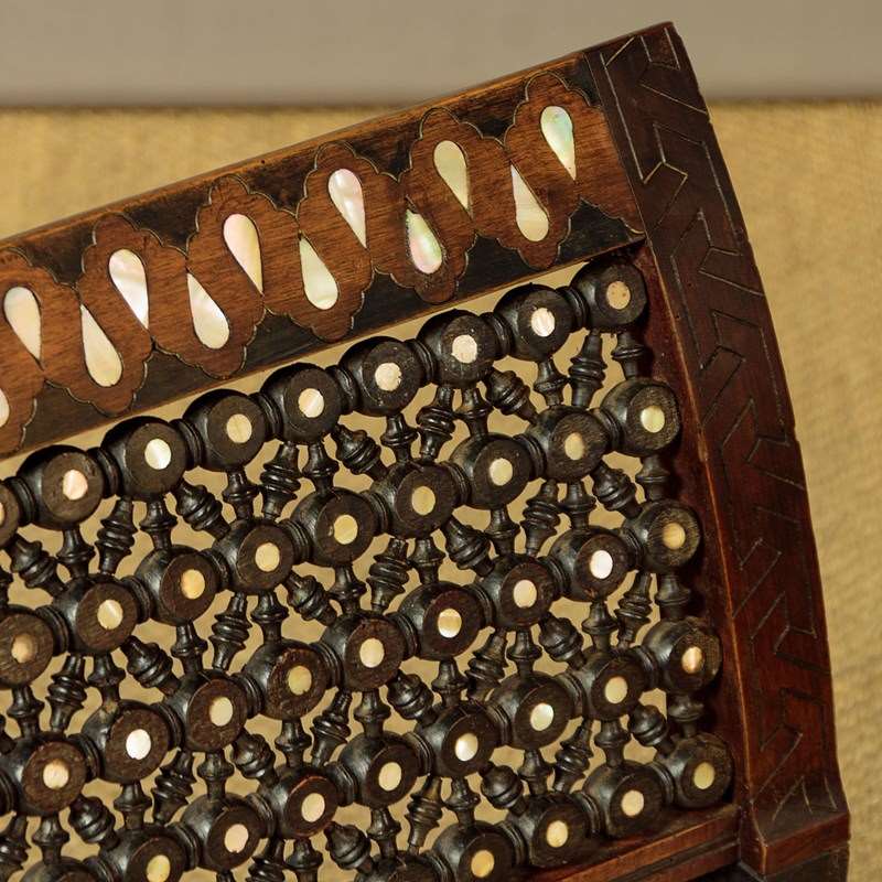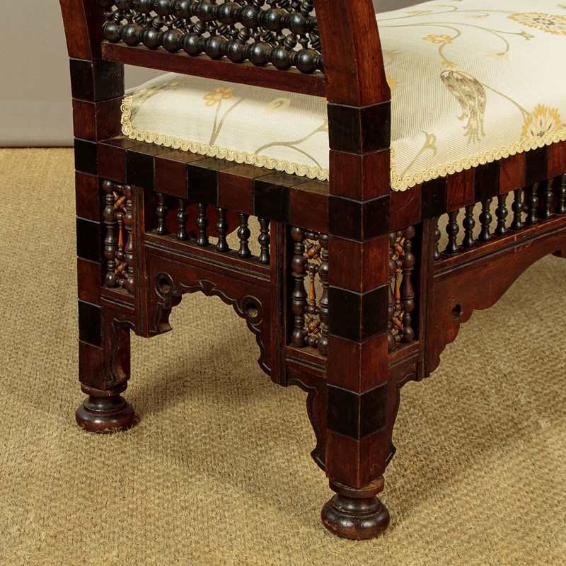 Unusual little Syrian window seat or stool c.1920. Walnut frame with raised ends with mashrabiya panels, stained and inlaid with mother of pearl. Over a sprung seat (height 15½") freshly upholstered a pale fabric with stylized flower heads. Shaped apron to all four sides below the seat with rows of finely turned spindles. Alternate polished and stained block detail to the frame and legs. Raised on turned feet. Very good condition, cleaned and waxed in our workshops.