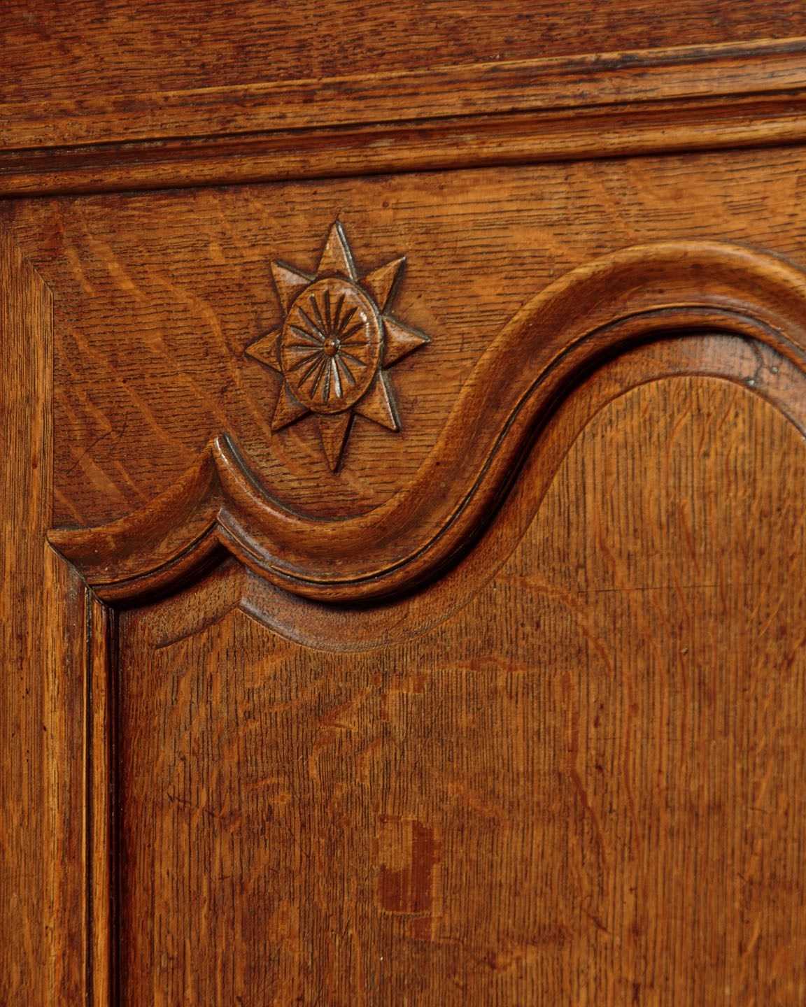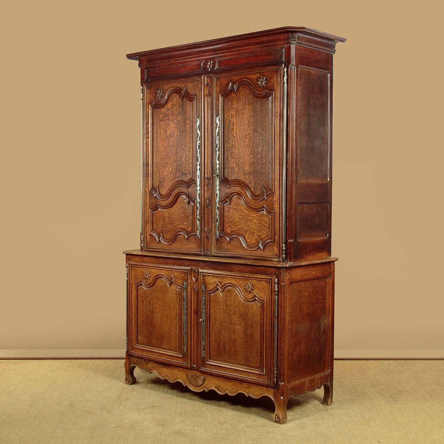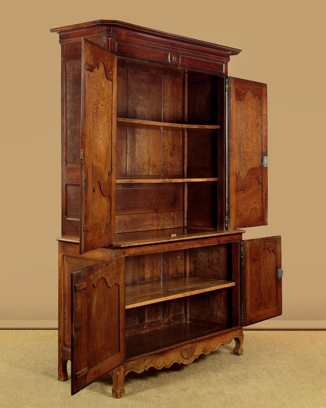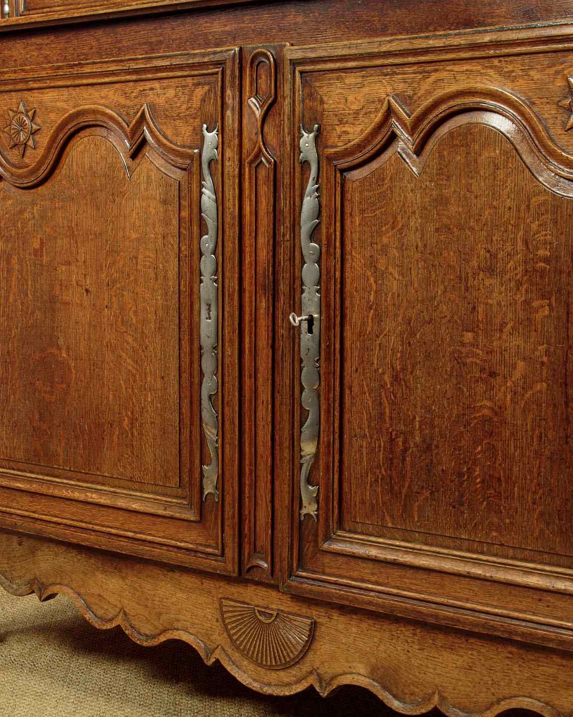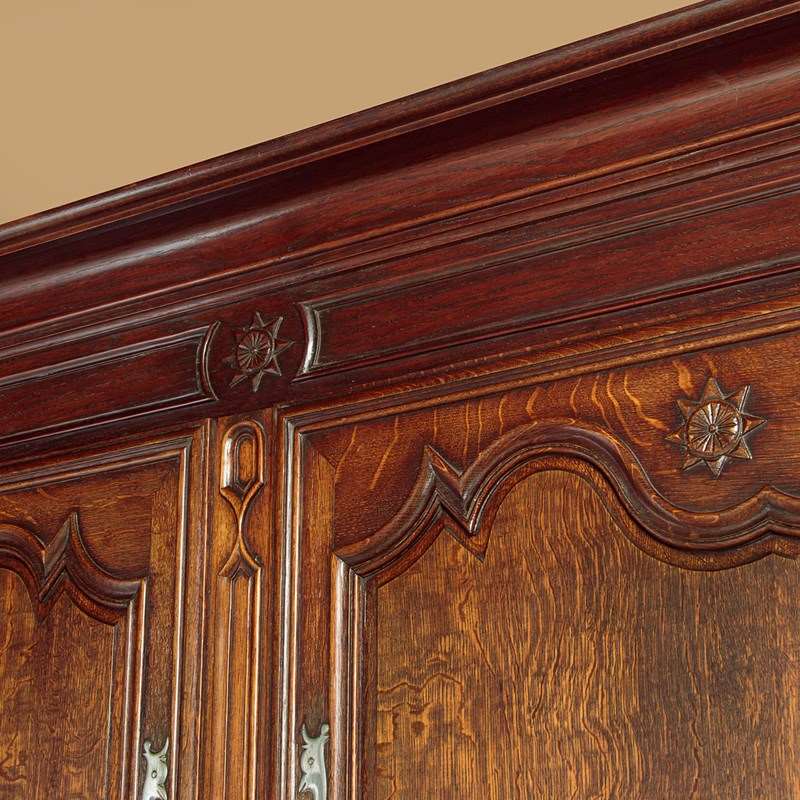 Superb late 18th.c French oak housekeepers cupboard c.1770. Of impressive scale, standing very nearly eight feet tall. Built in two sections (plus cornice) with a two door cupboard top fitted with two shelves (internal depth 16"), over a deeper two door cupboard base with a single shelf inside (internal depth 21"). Slim flared and moulded cornice over a moulded frieze carved with an eight pointed star or sun motif at the centre. Beautifully shaped raised and fielded panels to both sets of doors, set within moulded surrounds and featuring further star motifs. Note the long decorative polished steel escutcheon plates and hinges to the doors. Attractively shaped apron and legs, carved with a fan detail at the centre and a scroll to the front feet. Oak panelled sides and back. Excellent colour and condition, cleaned and waxed in our workshops. Keys supplied.