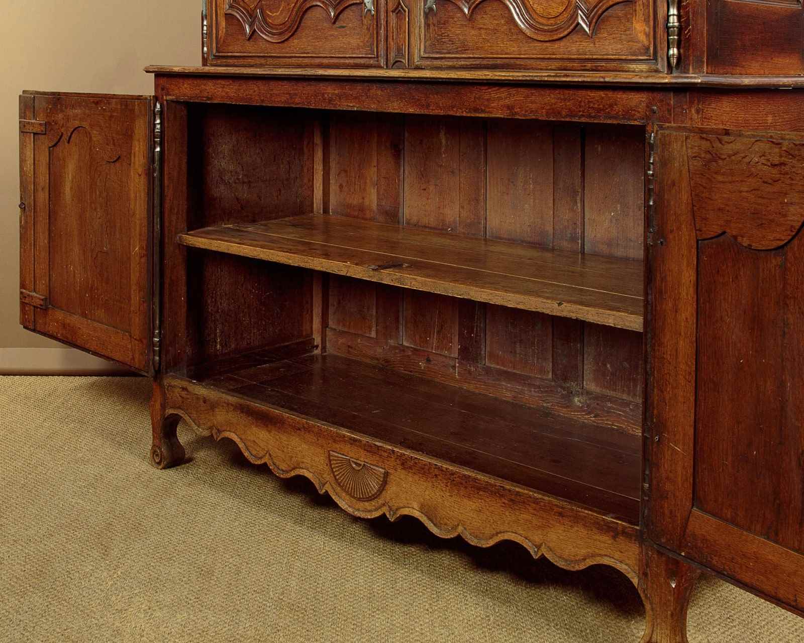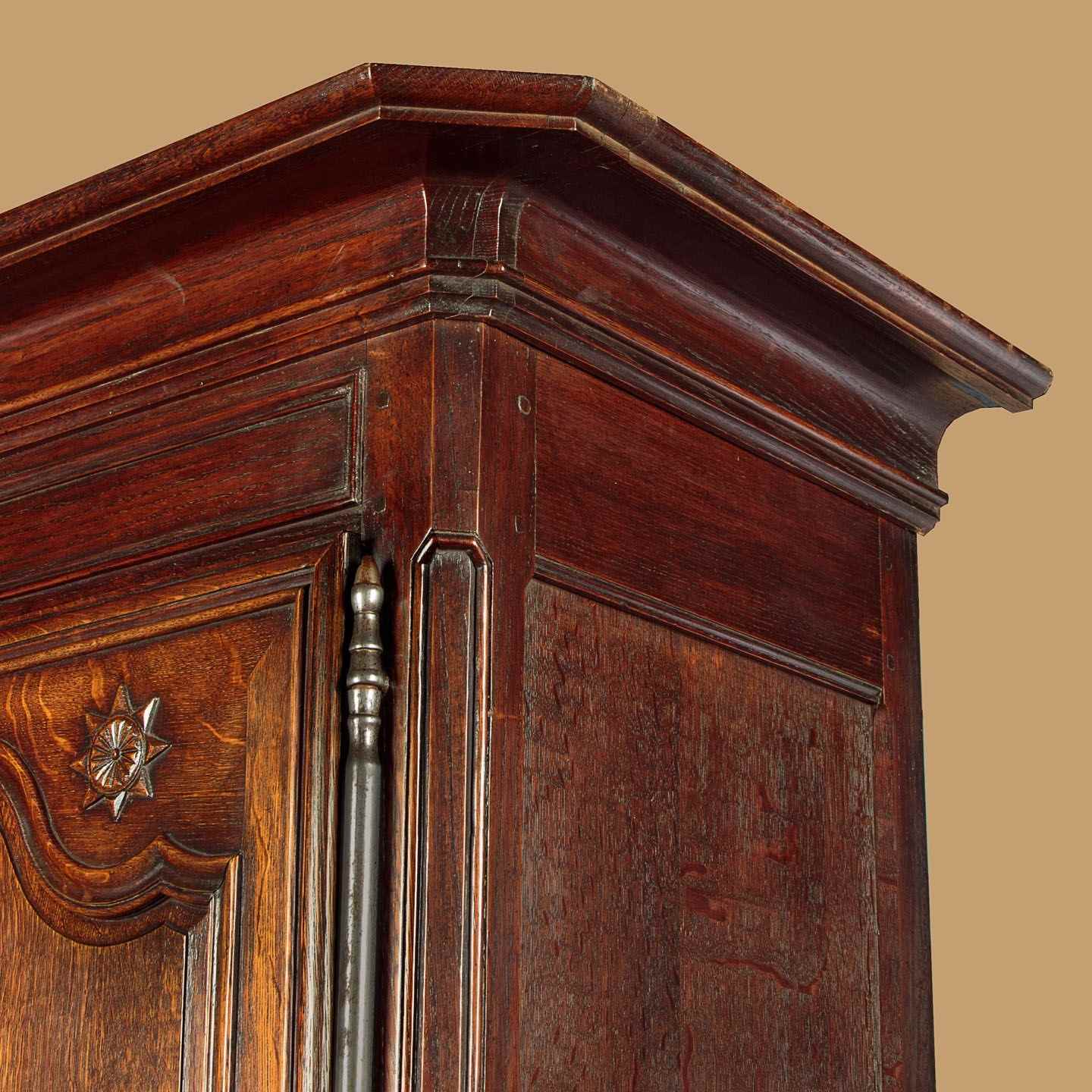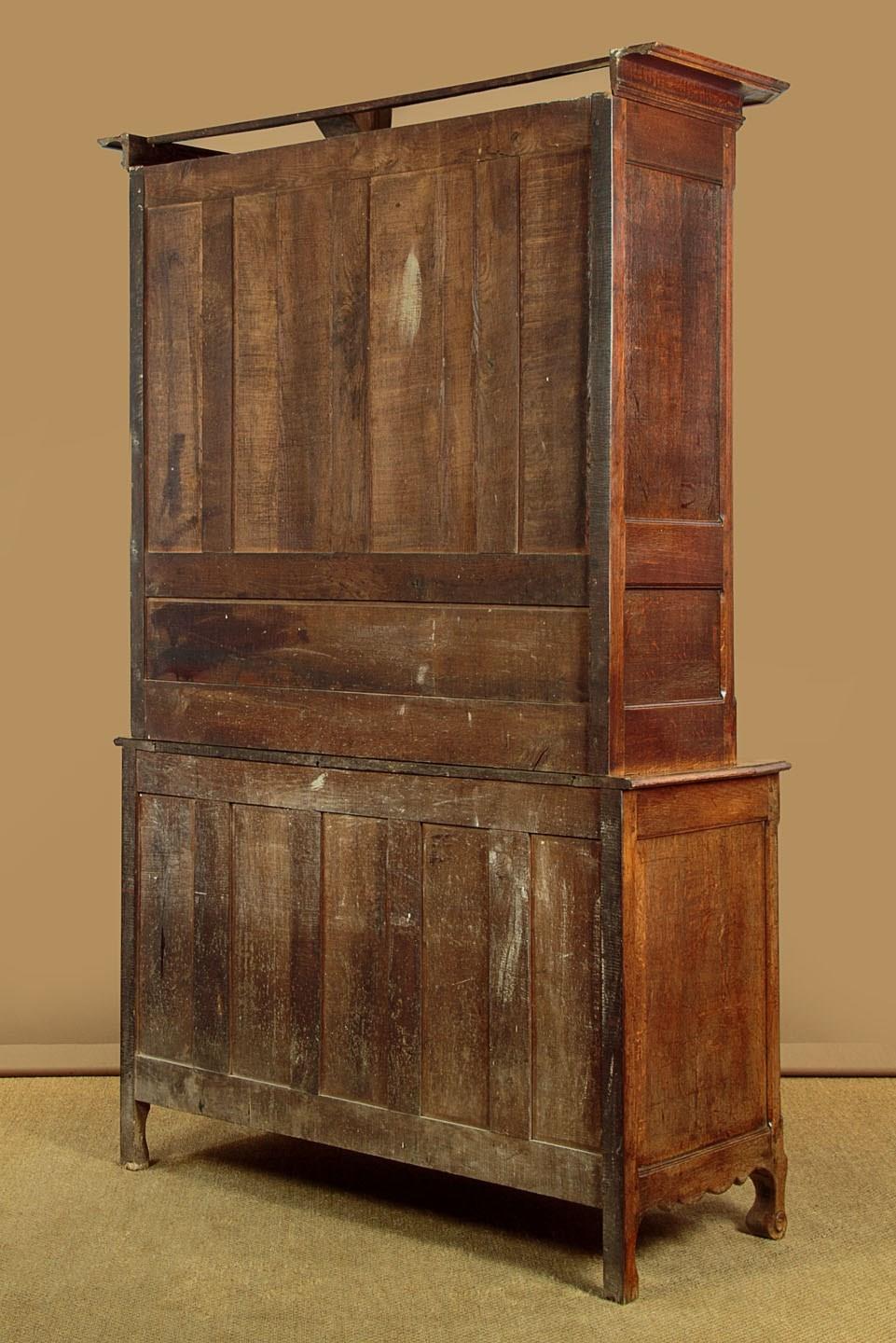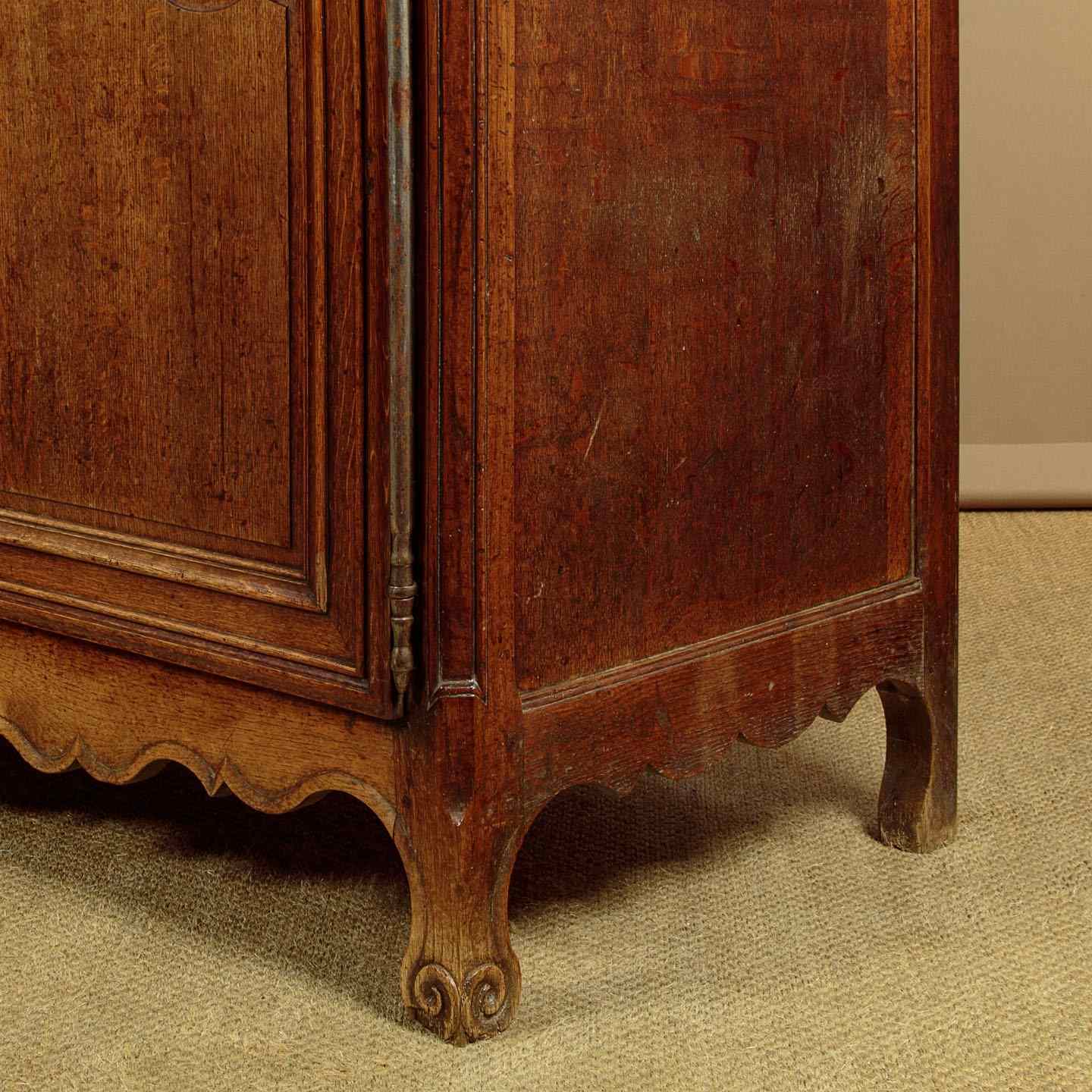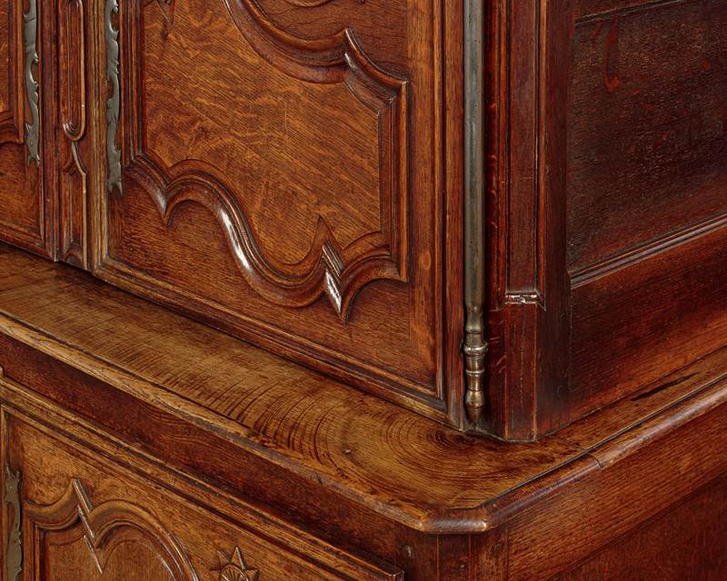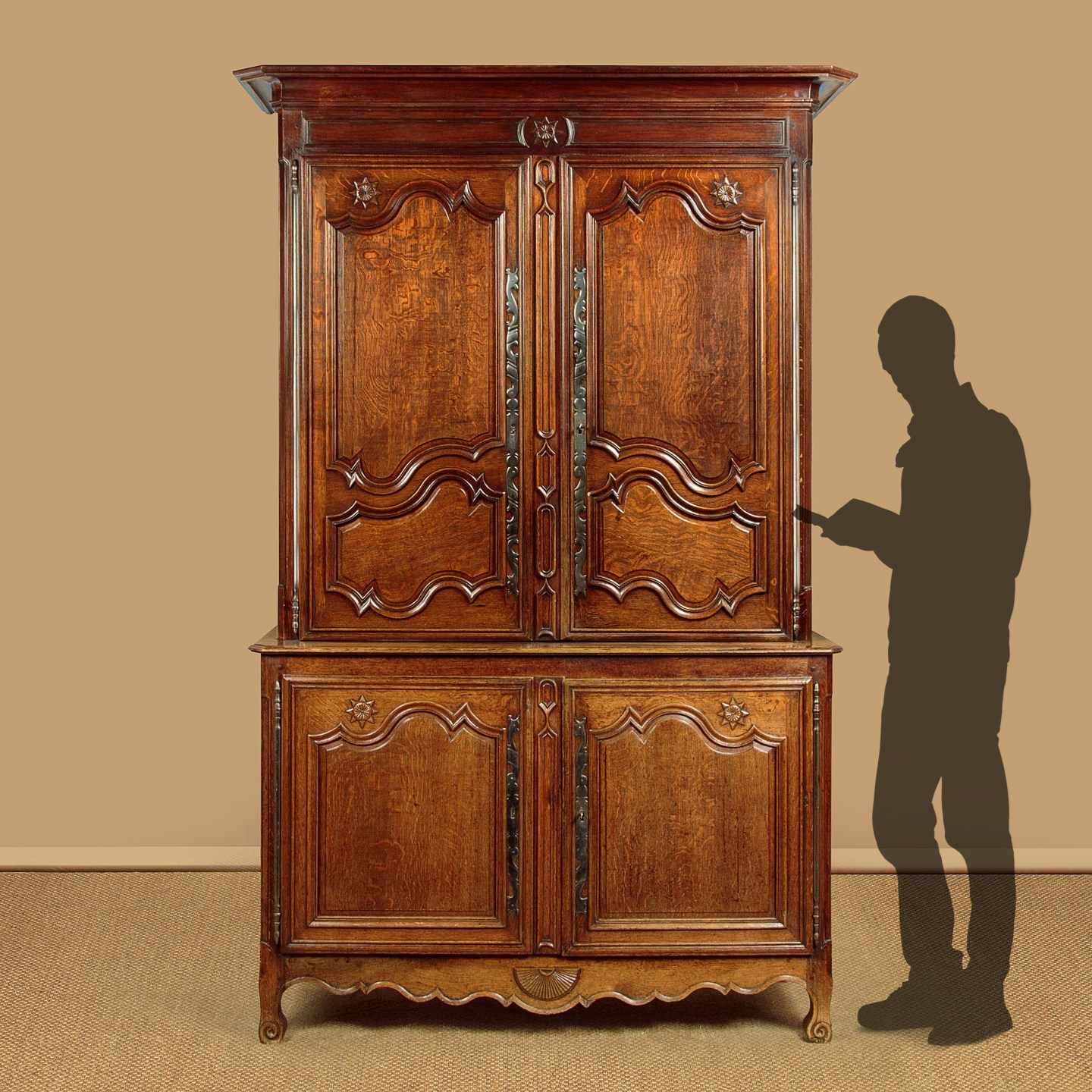 Superb late 18th.c French oak housekeepers cupboard c.1770. Of impressive scale, standing very nearly eight feet tall. Built in two sections (plus cornice) with a two door cupboard top fitted with two shelves (internal depth 16"), over a deeper two door cupboard base with a single shelf inside (internal depth 21"). Slim flared and moulded cornice over a moulded frieze carved with an eight pointed star or sun motif at the centre. Beautifully shaped raised and fielded panels to both sets of doors, set within moulded surrounds and featuring further star motifs. Note the long decorative polished steel escutcheon plates and hinges to the doors. Attractively shaped apron and legs, carved with a fan detail at the centre and a scroll to the front feet. Oak panelled sides and back. Excellent colour and condition, cleaned and waxed in our workshops. Keys supplied.
