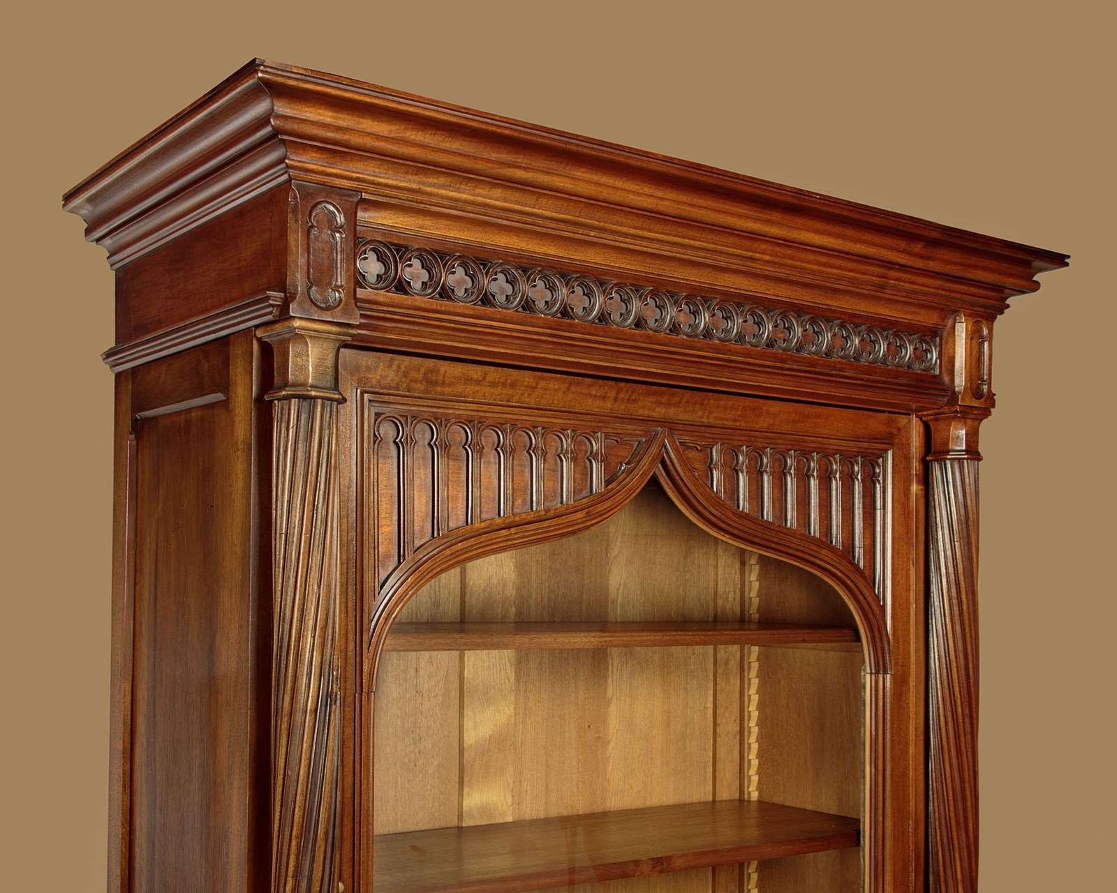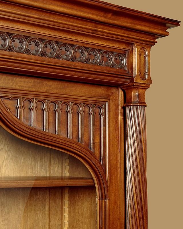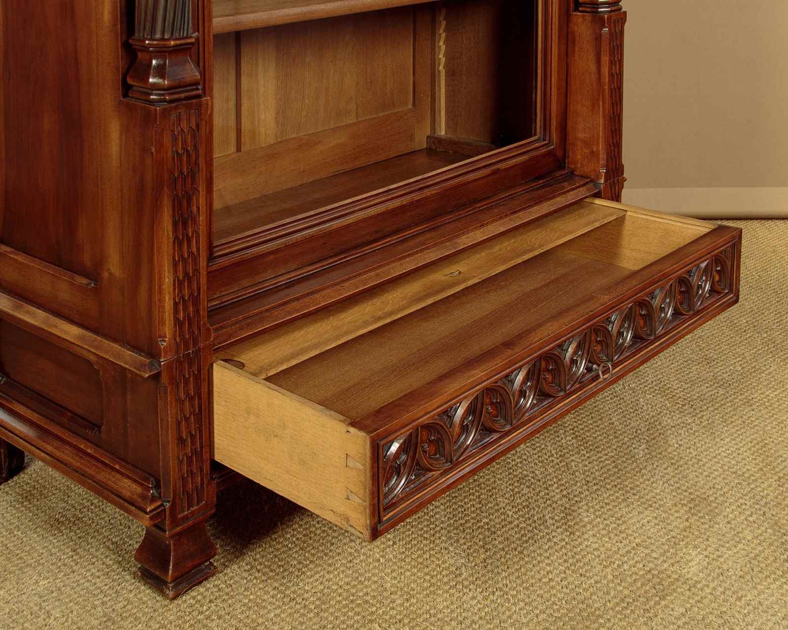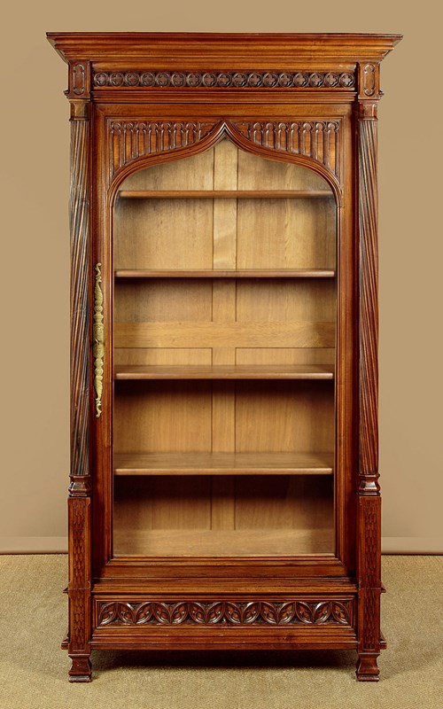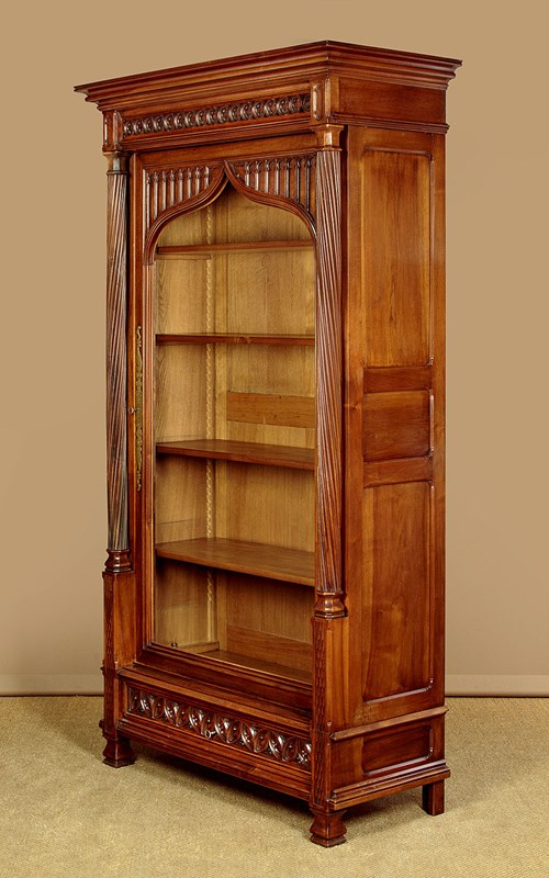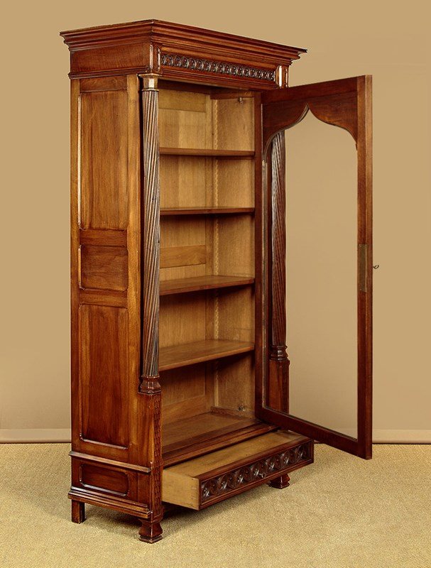 Exceptional quality late 19th.c. Gothic Revival bookcase in walnut c.1880. Single door with an ogee pointed arch shaped glazed panel. Fitted inside with four adjustable shelves (internal depth 13"). Over a useful drawer in the base. Deep moulded cornice with a carved quatrefoil blind tracery frieze. Further tracery carving to the top of the door, note also the large original brass lock plate with lovely chased decoration of Christ on the cross, a heraldic device and laurel wreaths. Flanking the door are a splendid pair of long twist carved columns with shaped capitals. Deep carved tracery decoration to the drawer front. Oak drawer lings with the original sliding dust cover. Panelled sides with chamfered surround. Oak lined interior and shelves. Excellent colour and condition. Cleaned and waxed in our workshops. Keys supplied for the door and drawer.