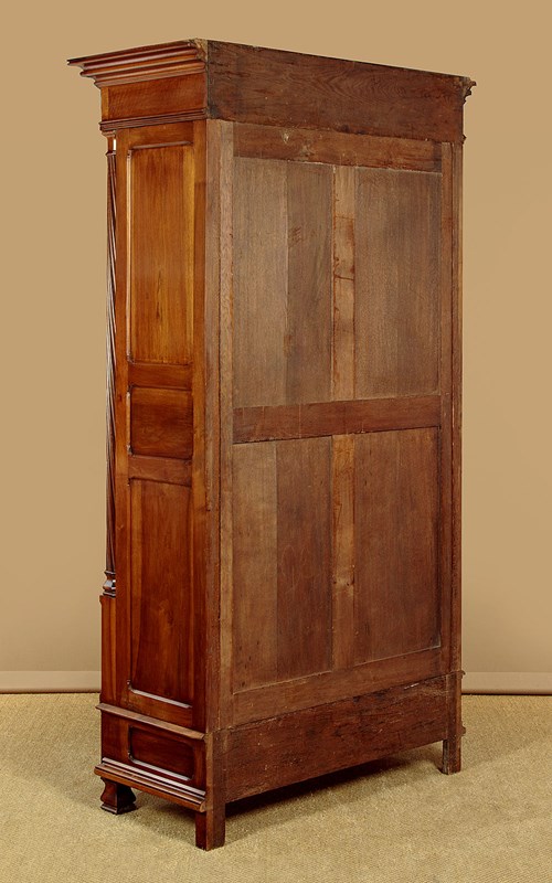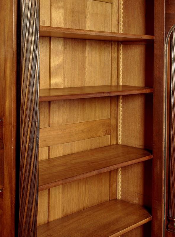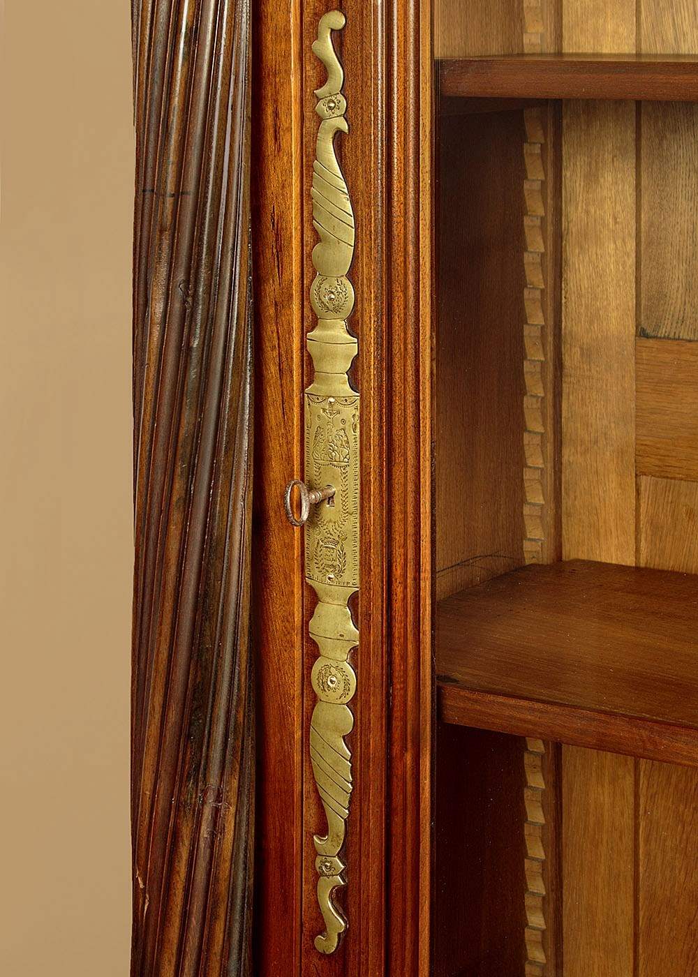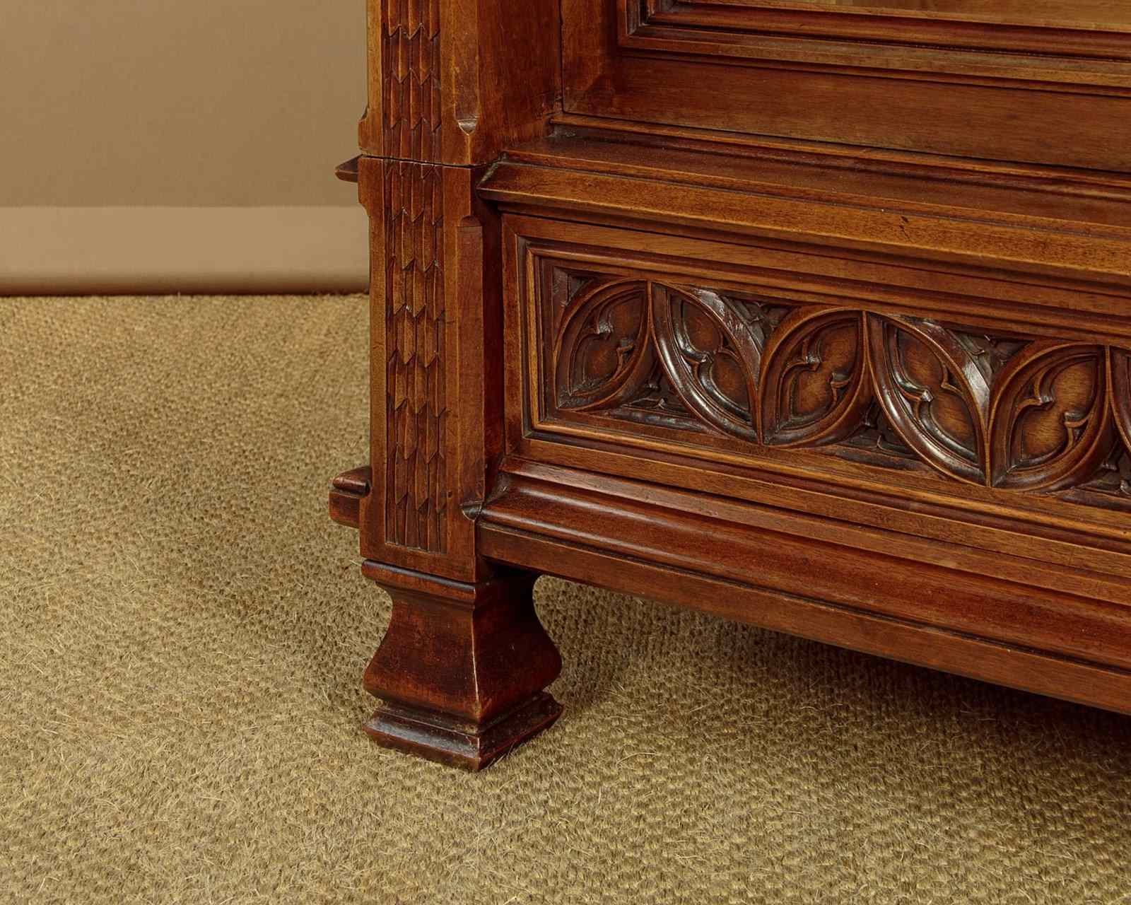 Exceptional quality late 19th.c. Gothic Revival bookcase in walnut c.1880. Single door with an ogee pointed arch shaped glazed panel. Fitted inside with four adjustable shelves (internal depth 13"). Over a useful drawer in the base. Deep moulded cornice with a carved quatrefoil blind tracery frieze. Further tracery carving to the top of the door, note also the large original brass lock plate with lovely chased decoration of Christ on the cross, a heraldic device and laurel wreaths. Flanking the door are a splendid pair of long twist carved columns with shaped capitals. Deep carved tracery decoration to the drawer front. Oak drawer lings with the original sliding dust cover. Panelled sides with chamfered surround. Oak lined interior and shelves. Excellent colour and condition. Cleaned and waxed in our workshops. Keys supplied for the door and drawer.